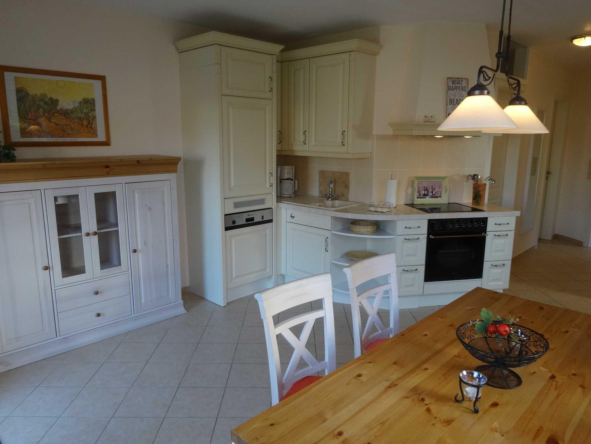 Die sehr gut ausgestattete Einbauküche ist kombiniert mit dem Wohnbereich, der sehr geschmackvoll und gemütlich eingerichtet ist. Hier befindet sich auch das sehr komfortable Schlafsofa.