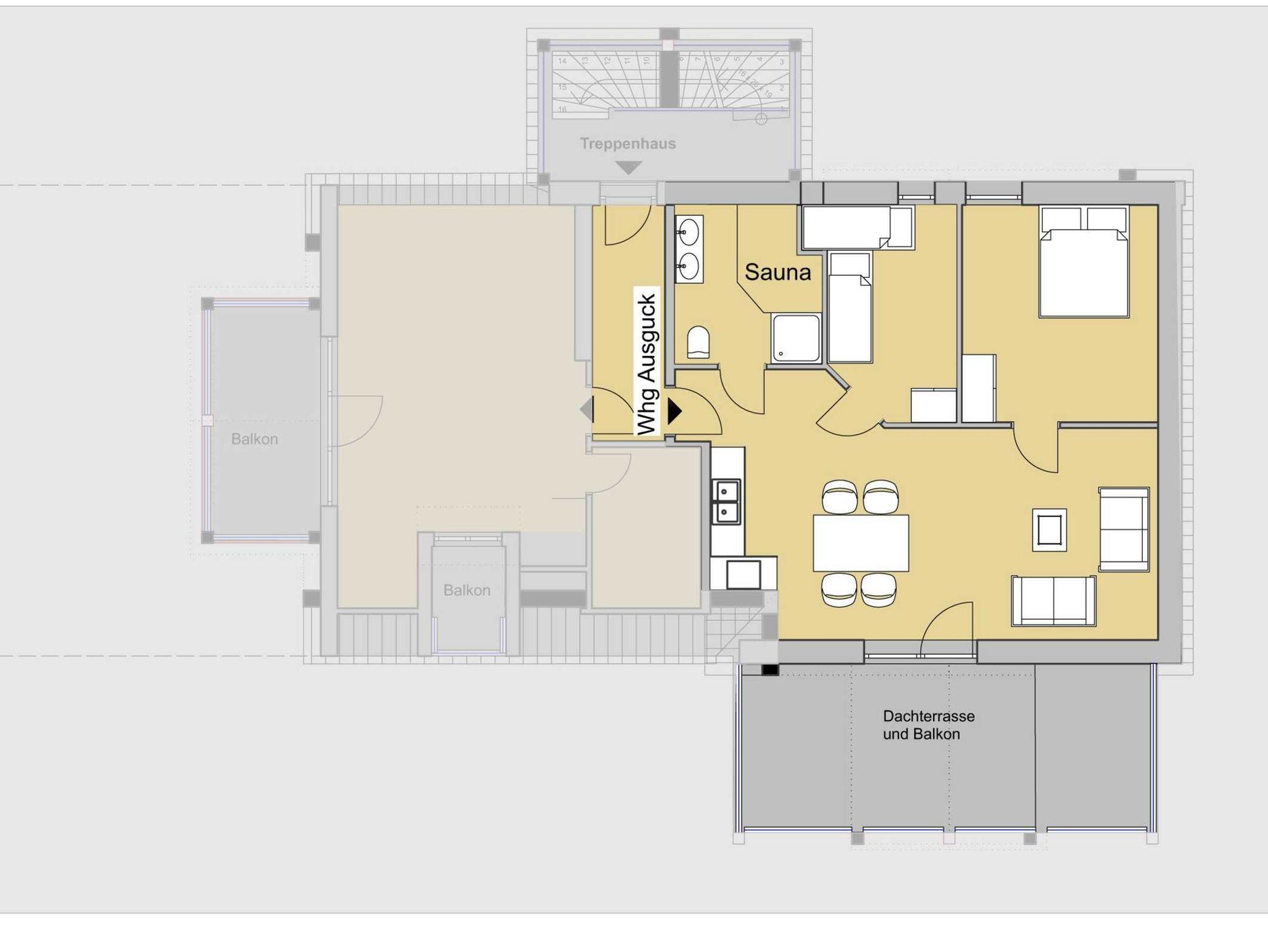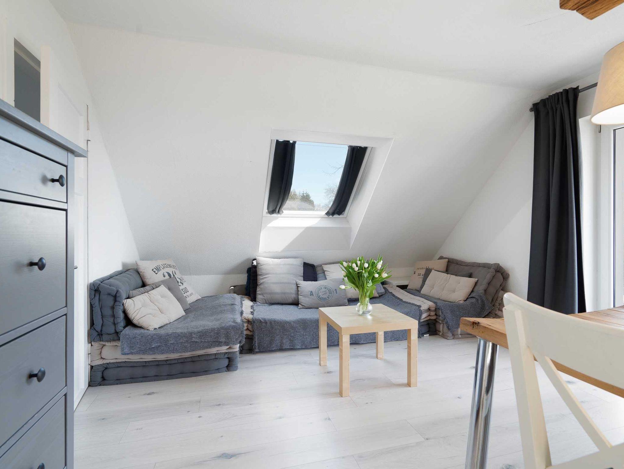 Die 3-Zimmer-Ferienwohnung wurde im Frühjahr 2022 renoviert und neu eingerichtet. Hier finden bis zu 6 Personen bequem Platz. Die Wohnung besteht aus einem Schlafzimmer, einem Kinderzimmer, dem Wohnzimmer mit offener Küche, der Dachterrasse mit Weber-Grill und einem Duschbad mit eigener Sauna.