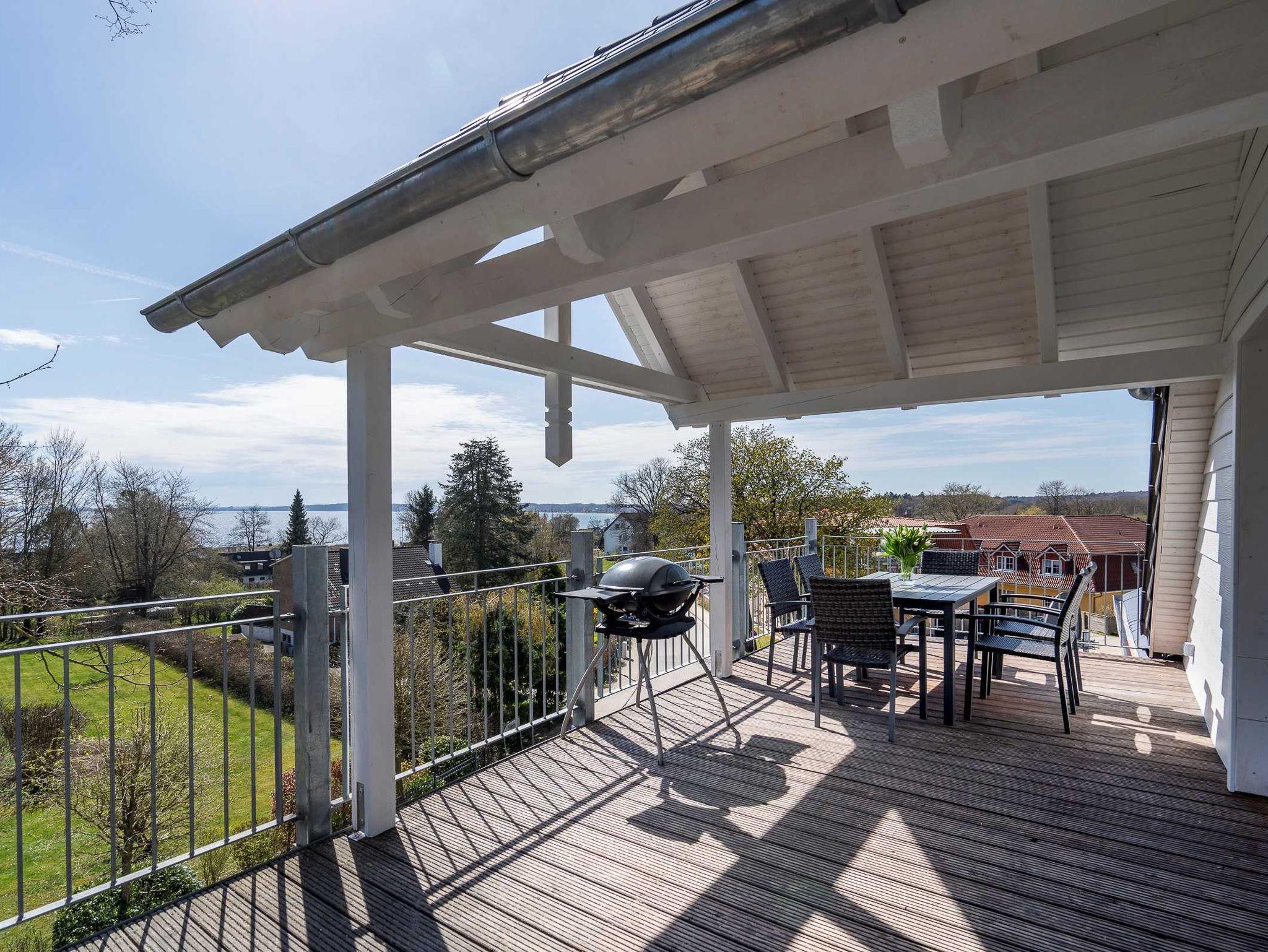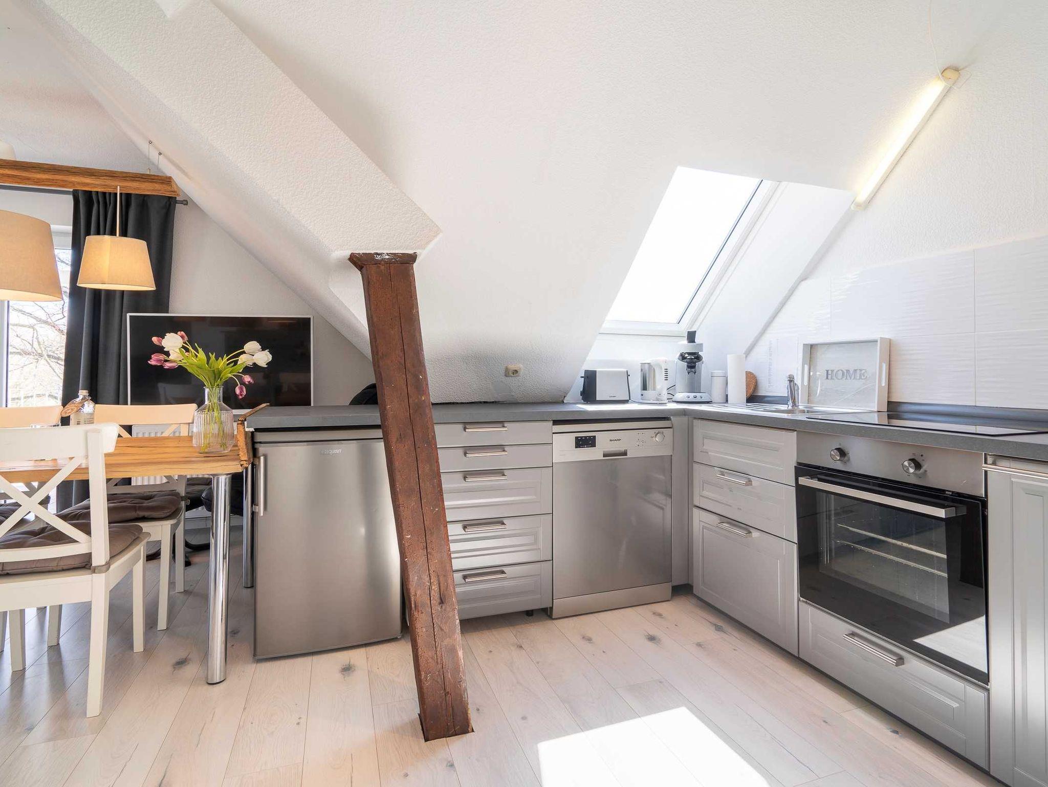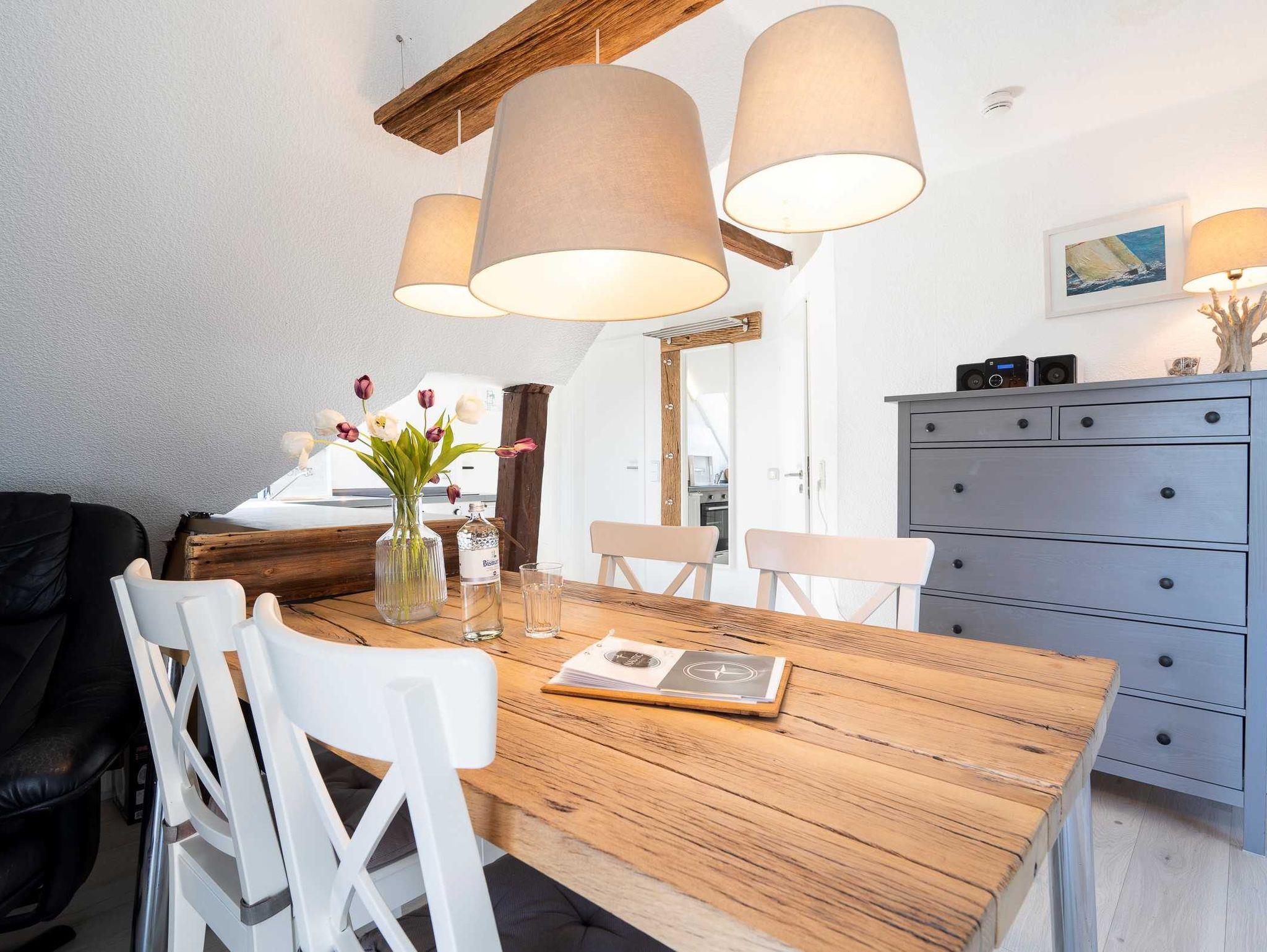 Es gibt ein 180 cm großes Doppelbett im Schlafzimmer und ein Matratzensofa im Wohnzimmer. Im Kinderzimmer finden natürlich auch Erwachsene Platz. Das Wohnzimmer ist nach Süden ausgerichtet. Am großen Esstisch aus alten Stegbohlen können 6 Prersonen gemütlich gemeinsam essen. In der Küche findet man neben einem 4-Platten-Cerankochfeld mit Backofen und einem Kühlschrank mit Gefrierfach auch einen Wasserkocher, eine Kaffeemaschine und eine neue Spülmaschine. Es sind ausreichend Geschirr, Töpfe und Pfannen für 6 Personen vorhanden. Eine große Dachterrasse mit großem Tisch, 6 Stühlen und einem elektrischen Weber-Grill stehen zur Verfügung. Von hier blicken unsere Gäste auf die nur 250 m entfernte Ostsee.