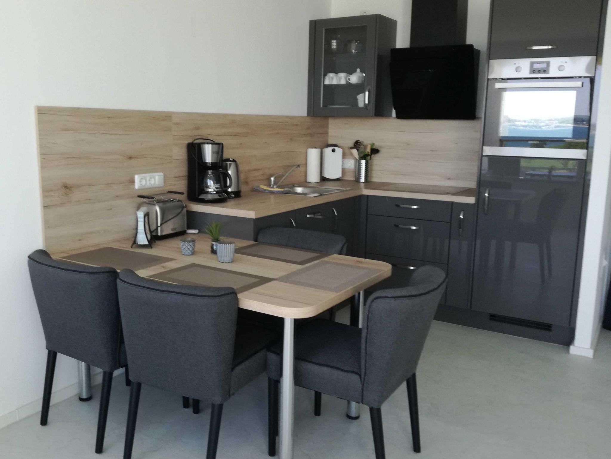 Doppelbett (Boxspringbett 160x200). Die hochwertige Küche ist mit allen Küchengeräten (Geschirrspüler, Backofen) und