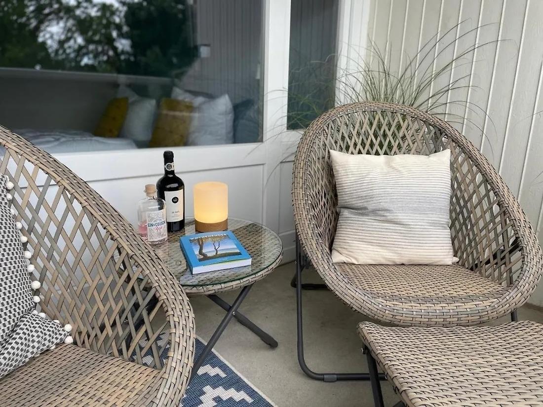 Das Highlight der neu sanierten, modernen Wohnung gibt ihr den Namen: "Sunset". Es ist der große überdachte Westbalkon mit Ausblick auf die Natur, im Winter ohne Laub an den Bäumen kann man auf der linken Seite auch einen Ausblick auf die nahe Ostsee erhaschen. Hier ist ausreichend Platz für gemeinsame Mahlzeiten mit der ganzen Familie oder ein entspanntes Glas Wein in den bequemen Lounge Möbeln mit Blick auf die Abendsonne.