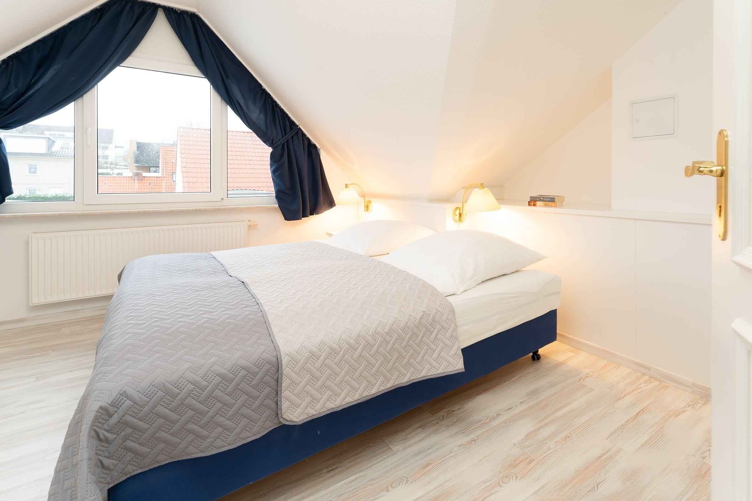 Auf der unteren Etage (1. Etage) befindet sich die großzügige Wohnküche mit einer Schlafcouch für 2 Personen und dem Essplatz. Die moderne Küchenzeile ist ausgestattet mit: Induktionsherd (4 Kochplatten), Kühlschrank mit Gefrierfach, Mikrowelle, Geschirrspülmaschine, Wasserkocher, Kaffeemaschine und Toaster. Das Dachgeschoss ist mit Laminat ausgelegt und verfügt über: Schlafraum mit 2 Einzelbetten (je 90x200 cm), Duschbad mit Fön und Wohnraum mit TV-Gerät, Radio/CD-Player und einer weiteren Schlafcouch für 2 Personen. Vom Balkon hat man Meerblick.