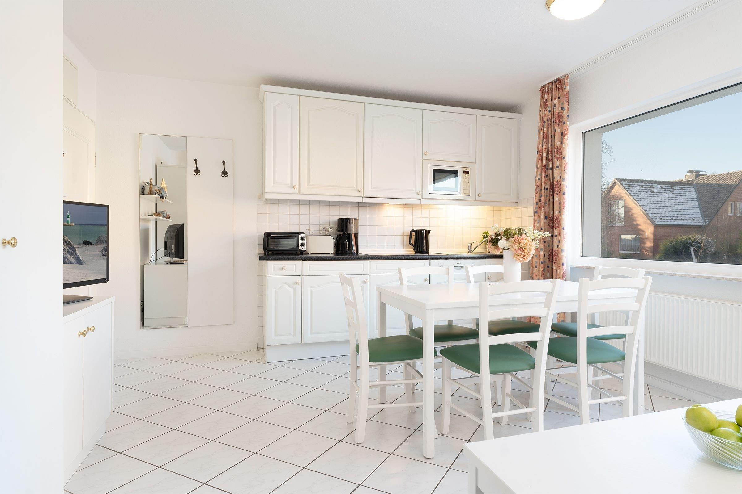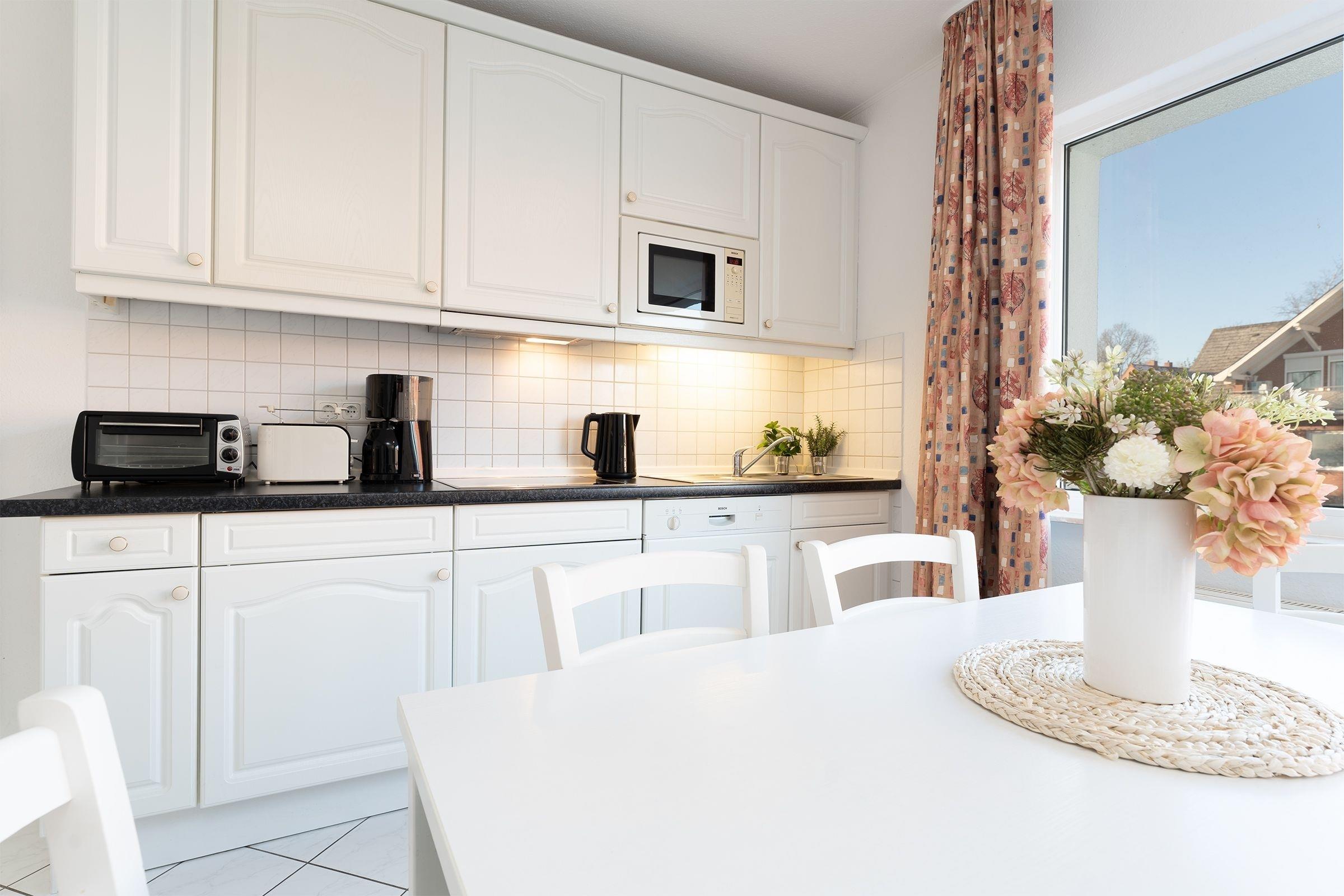 Auf der unteren Etage (1. Etage) befindet sich die großzügige Wohnküche mit einer Schlafcouch für 2 Personen und dem Essplatz. Die moderne Küchenzeile ist ausgestattet mit: Induktionsherd (4 Kochplatten), Kühlschrank mit Gefrierfach, Mikrowelle, Geschirrspülmaschine, Wasserkocher, Kaffeemaschine und Toaster. Das Dachgeschoss ist mit Laminat ausgelegt und verfügt über: Schlafraum mit Doppelbett (2x 90x200 cm), Duschbad mit Fön und Wohnraum mit TV-Gerät, Radio/CD-Player und einer weiteren Schlafcouch für 2 Personen. Vom Balkon hat man Meerblick.