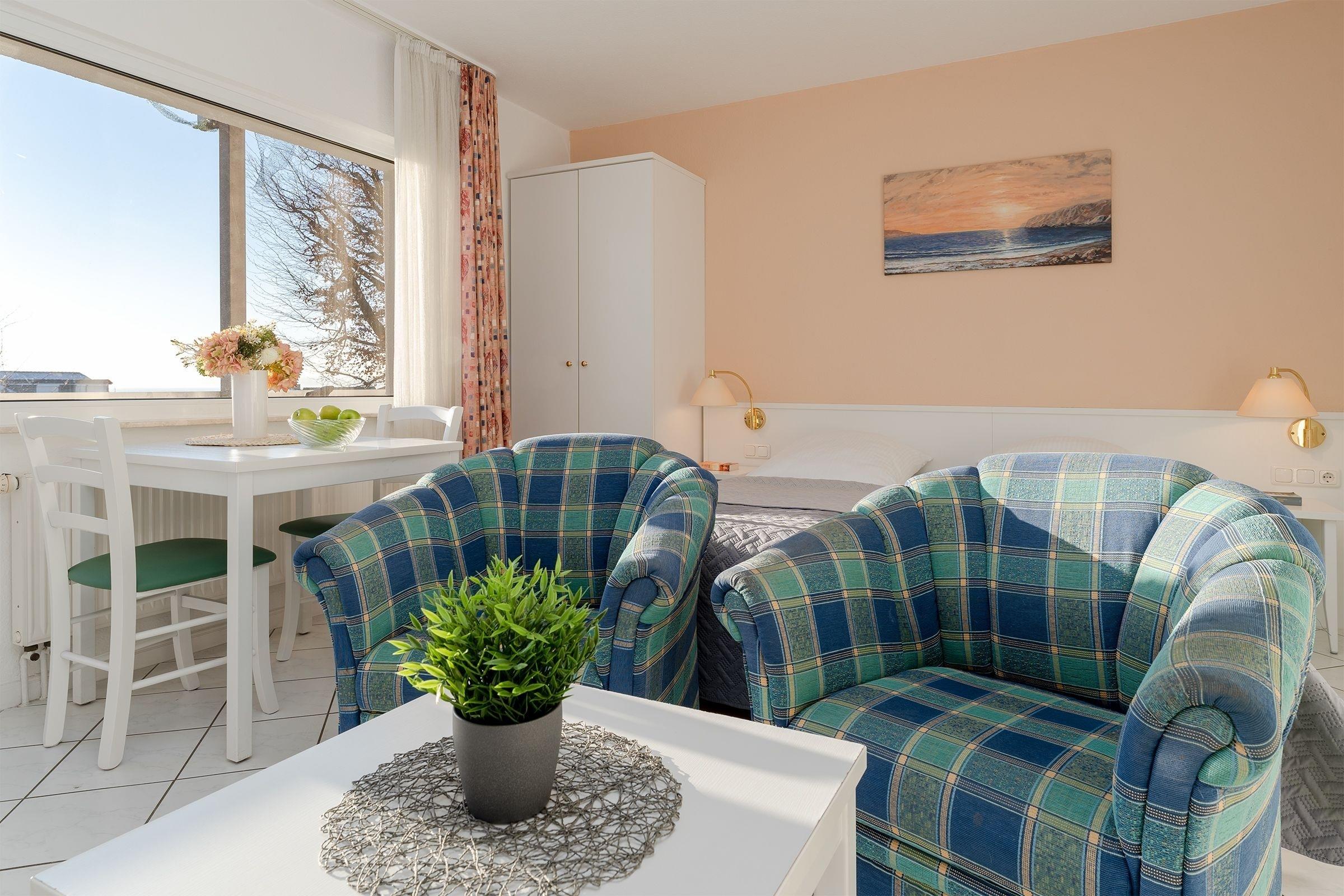 Das 1-Zimmer-Appartement hat ca. 28 m² und bietet Platz für bis zu 2 Personen. Es ist komplett gefliest und verfügt über einen Wohn-/Schlafraum mit einem Doppelbett (2x 90x200 cm), TV-Gerät, Radio/CD-Player, Essplatz, integrierter Küchenzeile sowie einem Zugang zum Balkon mit Gartenmöbeln und etwas Meerblick. Die moderne Küchenzeile ist ausgestattet mit: Induktionsherd (4 Kochplatten), Kühlschrank mit Gefrierfach, Mikrowelle, Wasserkocher, Kaffeemaschine und Toaster. Duschbad mit Fön.
