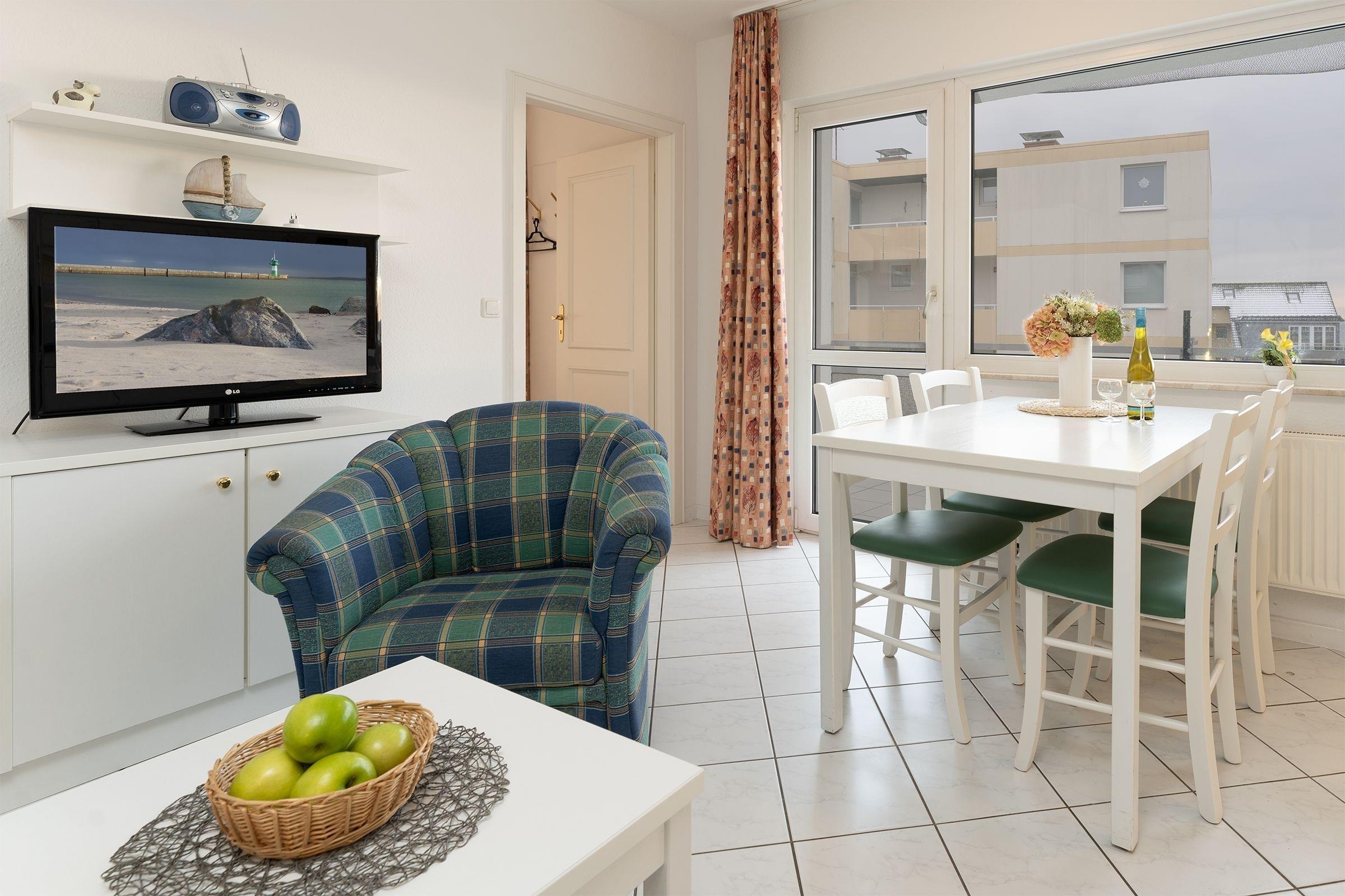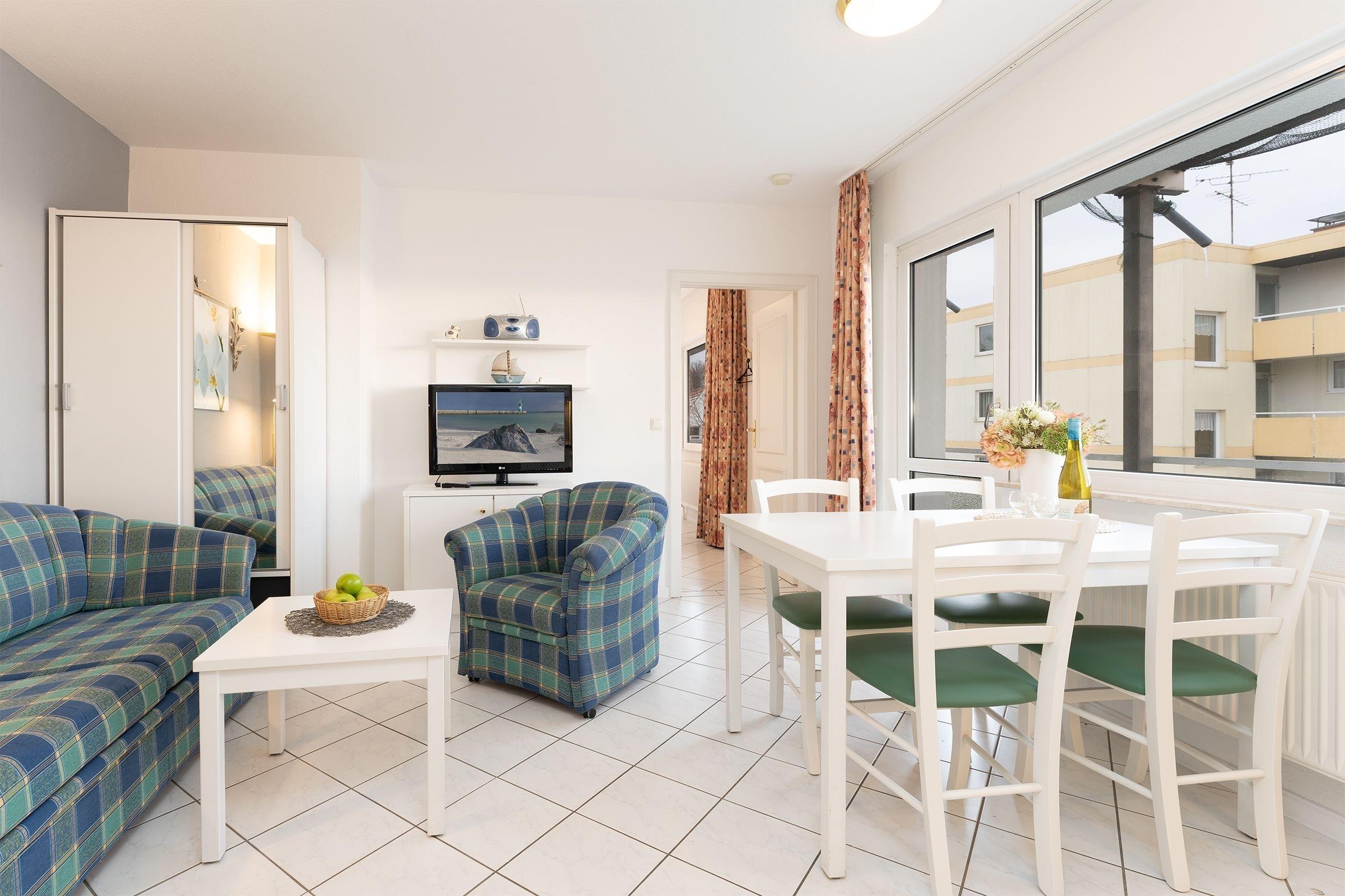 Das 2-Zimmer-Appartement hat ca. 36 m² und bietet Platz für bis zu 4 Personen. Es ist komplett gefliest und verfügt über einen Wohnraum mit: Schlafcouch für 2 Personen, TV-Gerät, Radio/CD-Player, Essplatz, integrierter Küchenzeile sowie einem Zugang zum großzügigen Balkon mit Gartenmöbeln und etwas Meerblick. Die moderne Küchenzeile ist ausgestattet mit: Induktionsherd (4 Kochplatten), Kühlschrank mit Gefrierfach, Mikrowelle, Geschirrspülmaschine, Wasserkocher, Kaffeemaschine und Toaster. Im Schlafzimmer befinden sich ein Doppelbett (2x 90x200 cm) und ein 2. Zugang zum Balkon. Duschbad mit Fön.