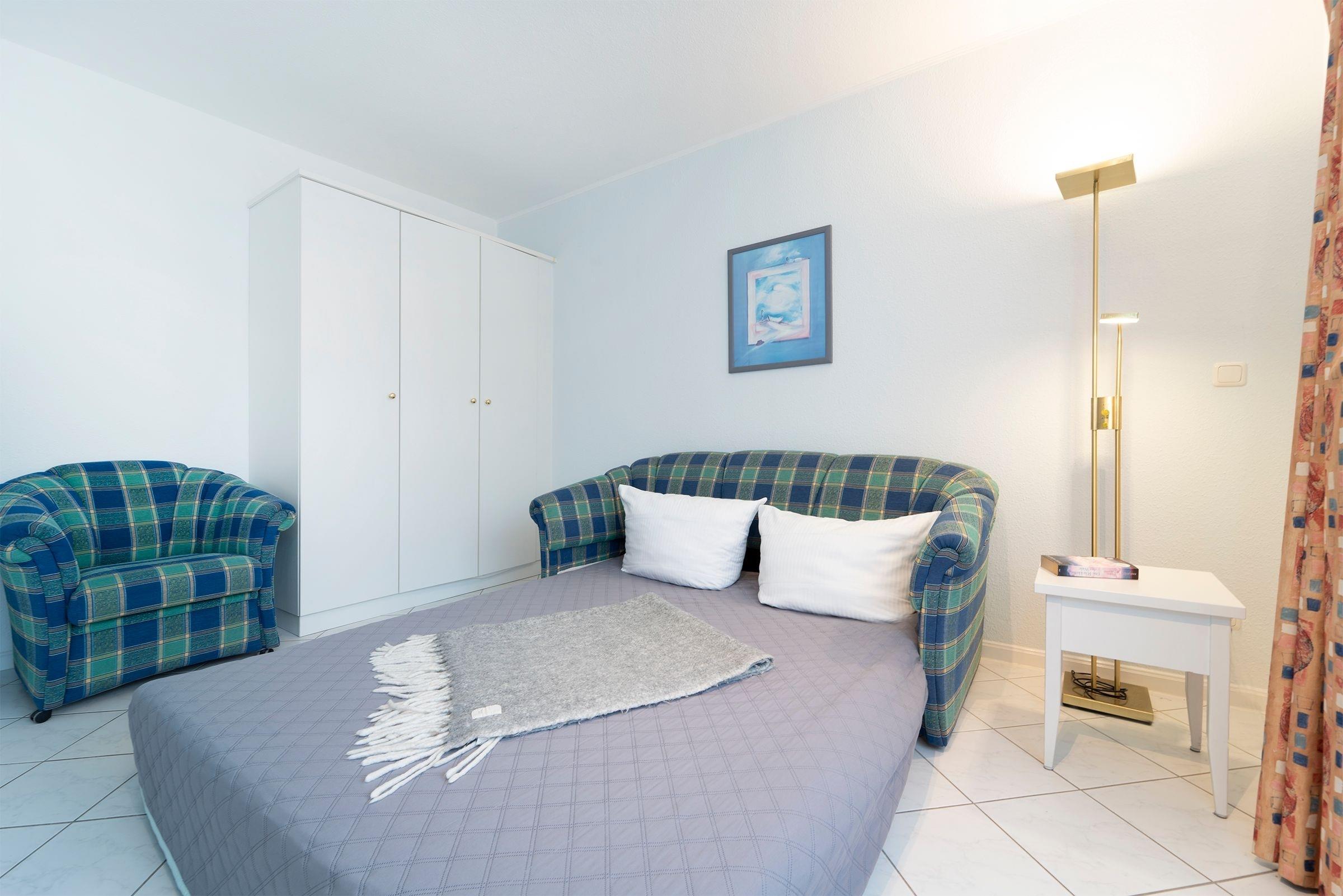 Wohn-/Schlafzimmer: 1 Schlafsofa (150x200 cm), Platz für Kinderreisebett.
