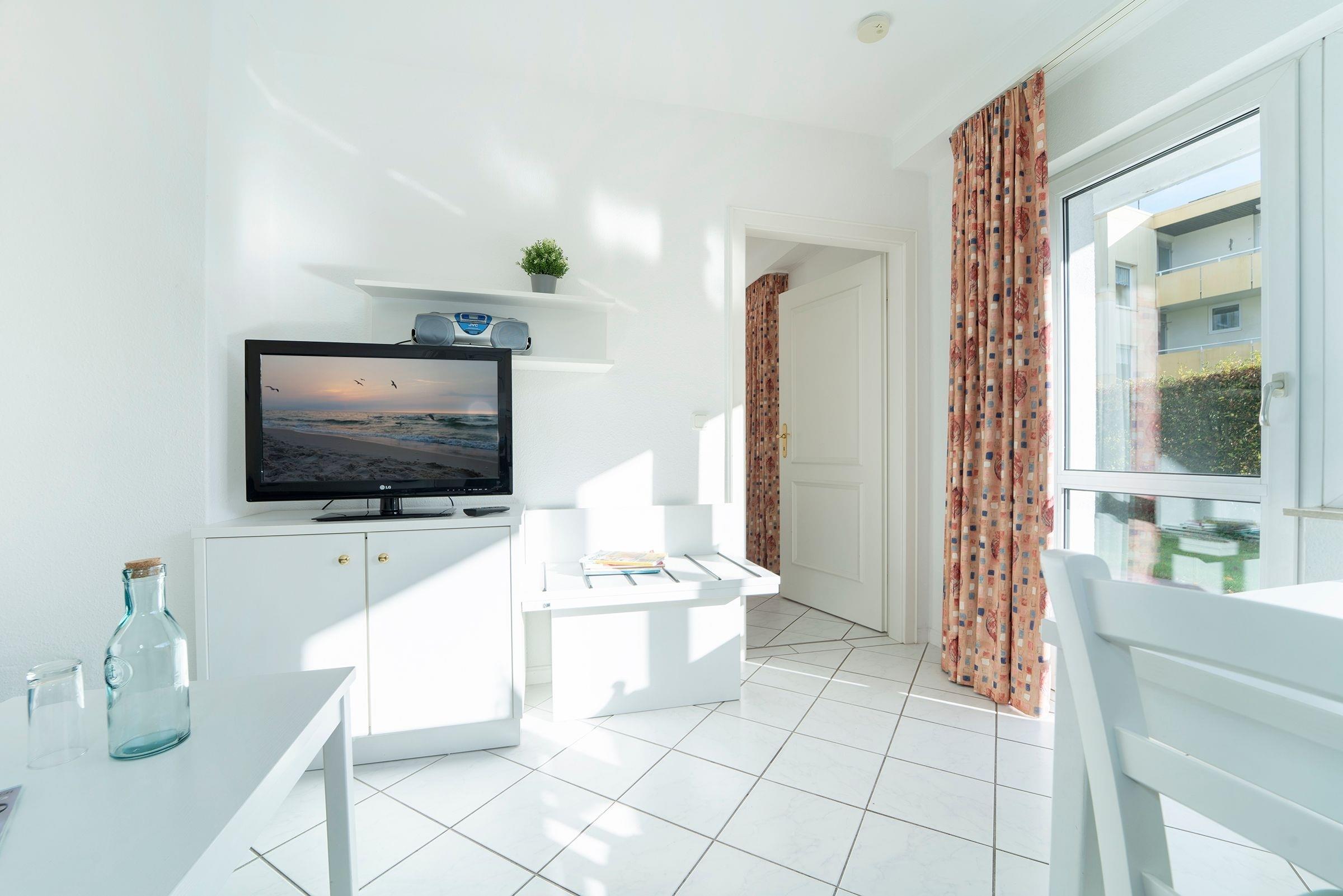 Das 2-Zimmer-Appartement hat ca. 33 m² und bietet Platz für bis zu 4 Personen. Es ist komplett gefliest und verfügt über einen Wohnraum mit: Schlafcouch für 2 Personen, TV-Gerät, Radio/CD-Player, Essplatz, integrierter Küchenzeile sowie einem Zugang zur großzügigen Terrasse mit Gartenmöbeln. Die moderne Küchenzeile ist ausgestattet mit: Induktionsherd (4 Kochplatten), Kühlschrank mit Gefrierfach, Mikrowelle, Geschirrspülmaschine, Wasserkocher, Kaffeemaschine und Toaster. Im Schlafzimmer befinden sich ein Doppelbett (2x 90x200 cm) und ein 2. Zugang zur Terrasse. Duschbad mit Fön.