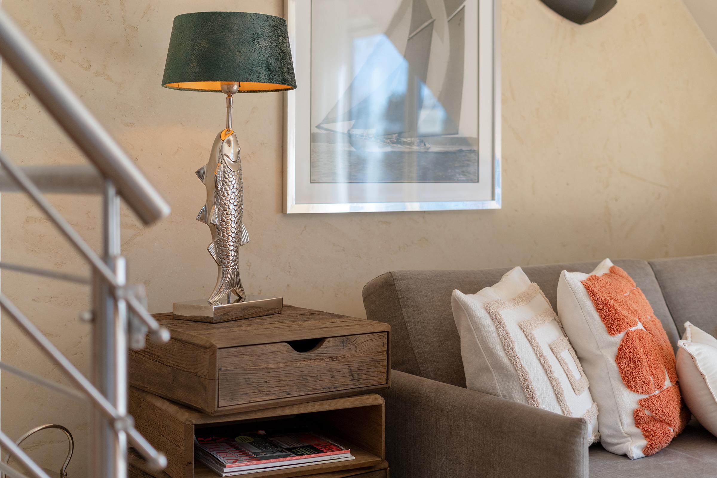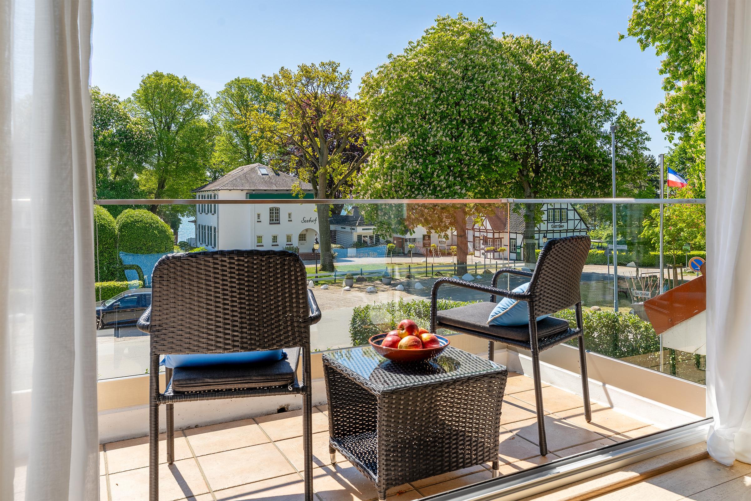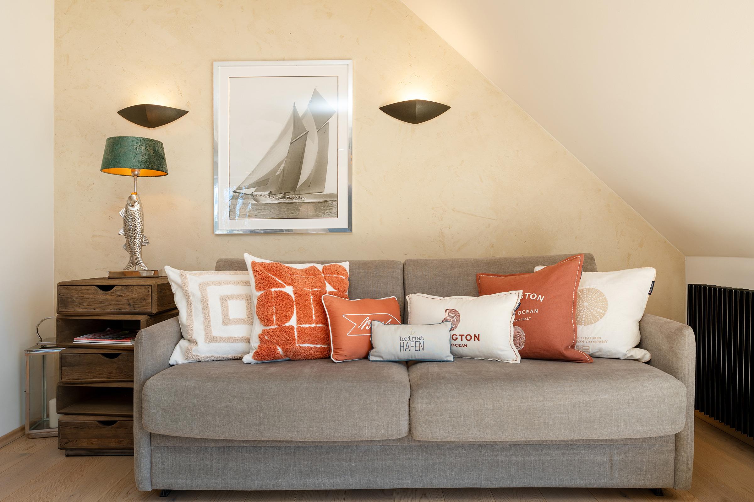 Der großzügige Wohnbereich besticht durch eine gemütliche Schlafcouch (180x200 cm), die zum Verweilen einladen, sowie einen Fernseher für unterhaltsame Abende. Durch die großen Fenster wird der Raum mit Tageslicht durchflutet, was für eine besonders freundliche Atmosphäre sorgt. Von hier aus haben Sie direkten Zugang zum Balkon – ideal, um die frische Seeluft und den Teilmeerblick zu genießen.