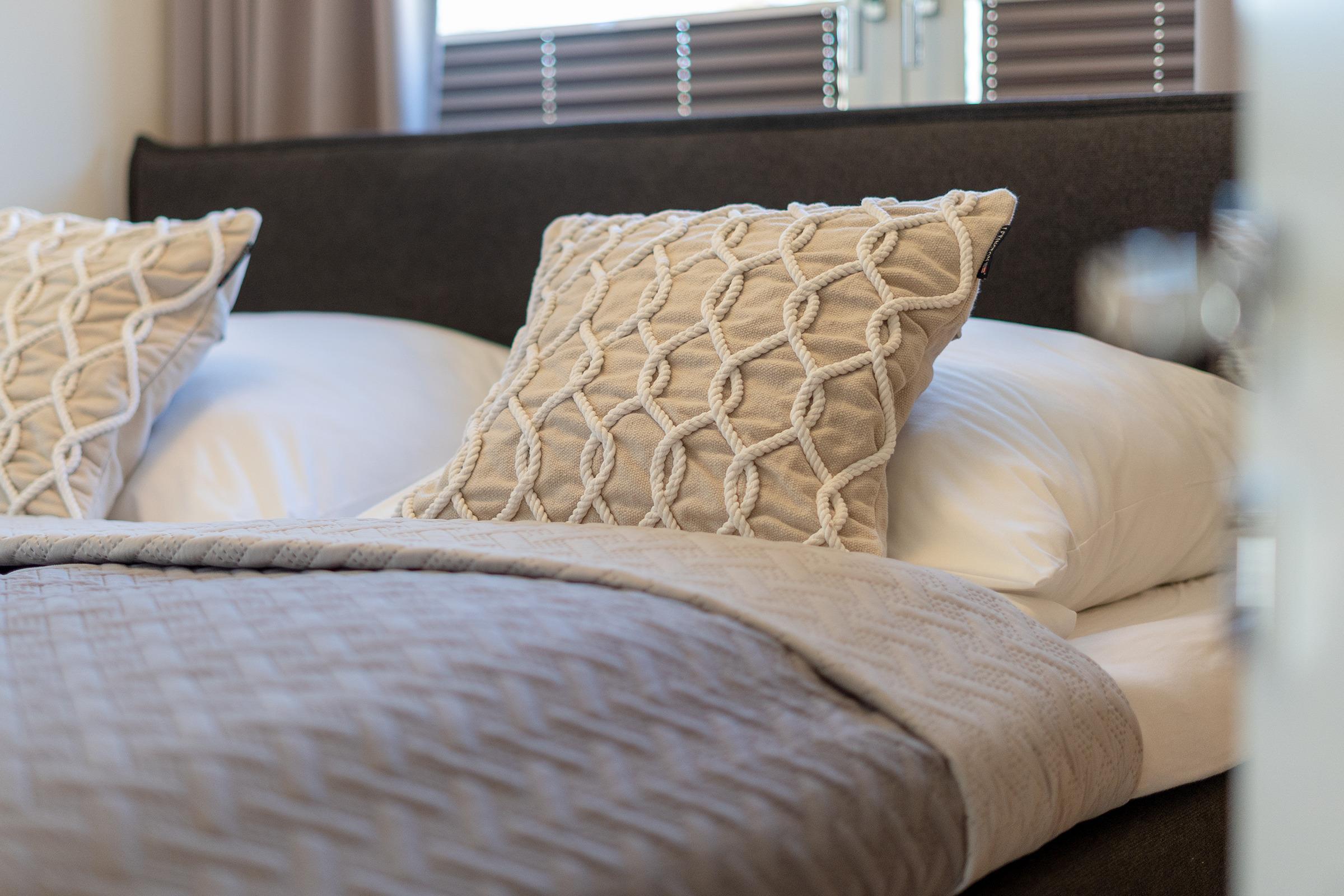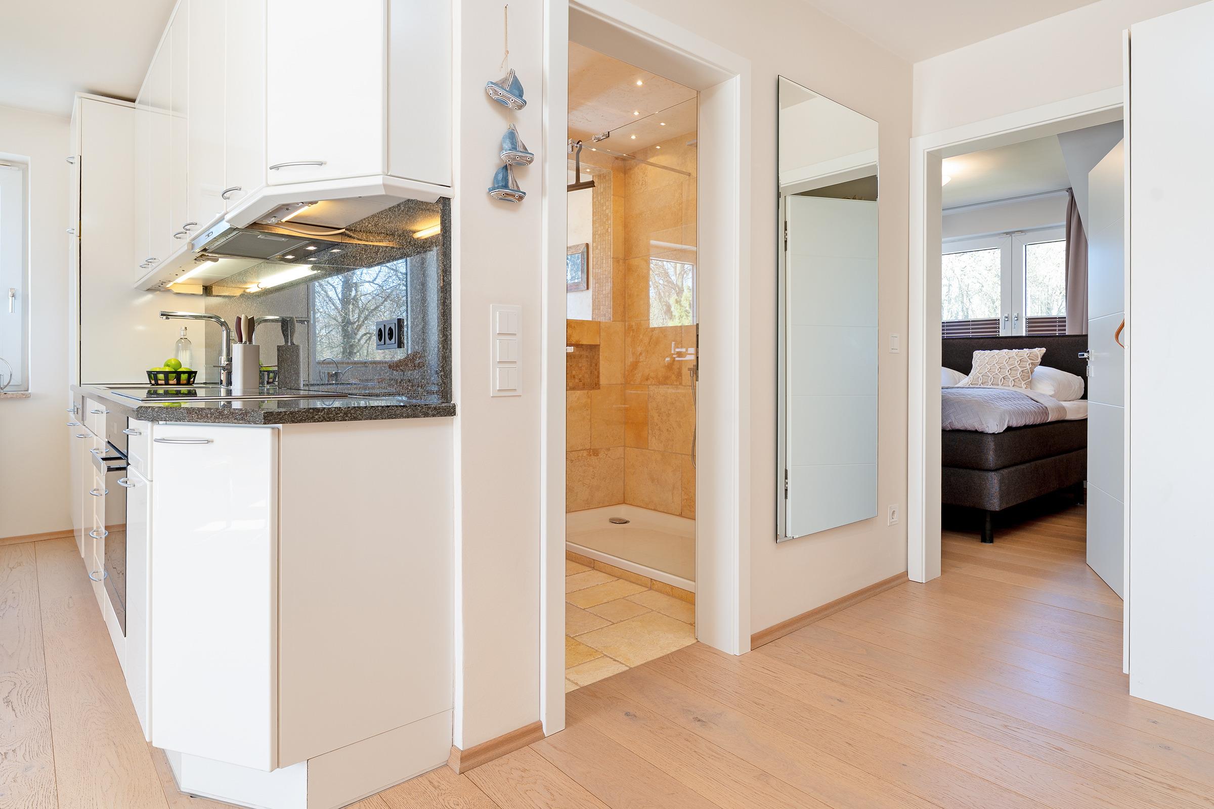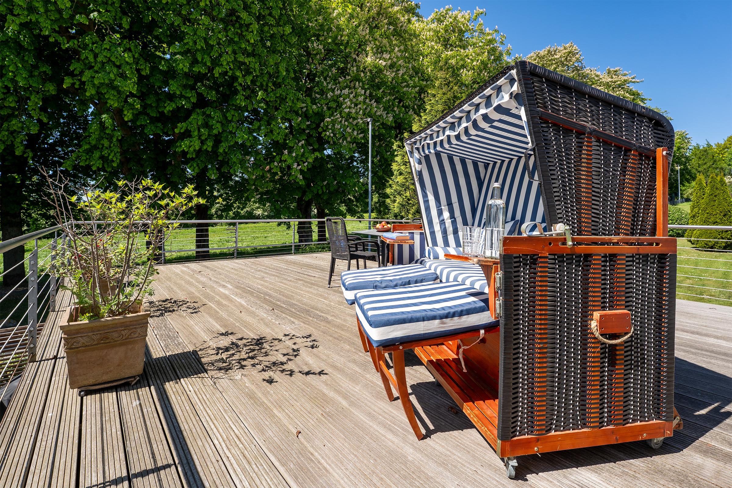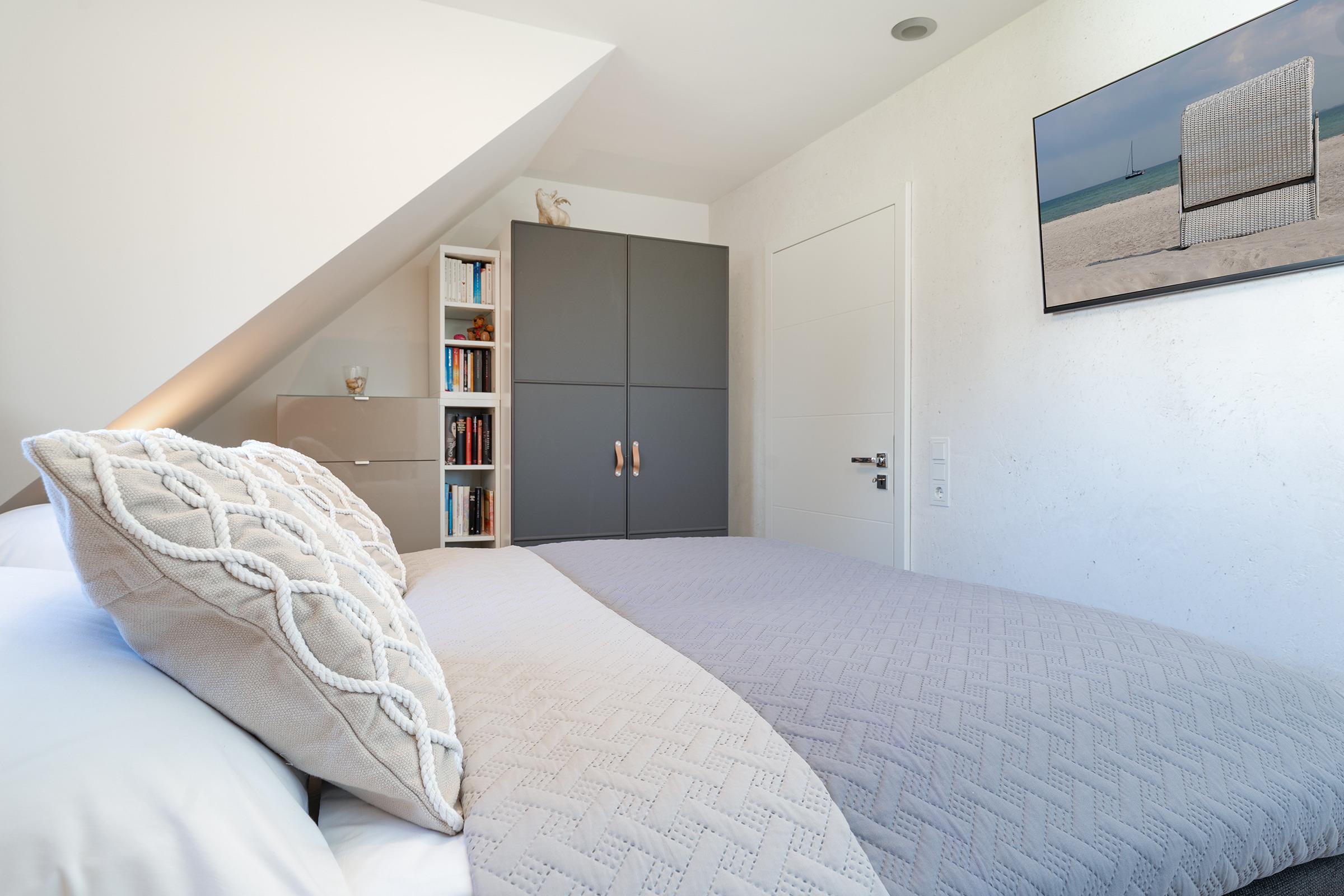 Das Schlafzimmer ist mit einem komfortablen Doppelbett (180x200 cm) eingerichtet und verspricht erholsame Nächte. Von hier aus gelangen Sie auf die großzügige Dachterrasse, auf der Sie zahlreiche Sonnenstunden im Strandkorb genießen können. Im modernen Badezimmer erwartet Sie eine bodengleiche Dusche.