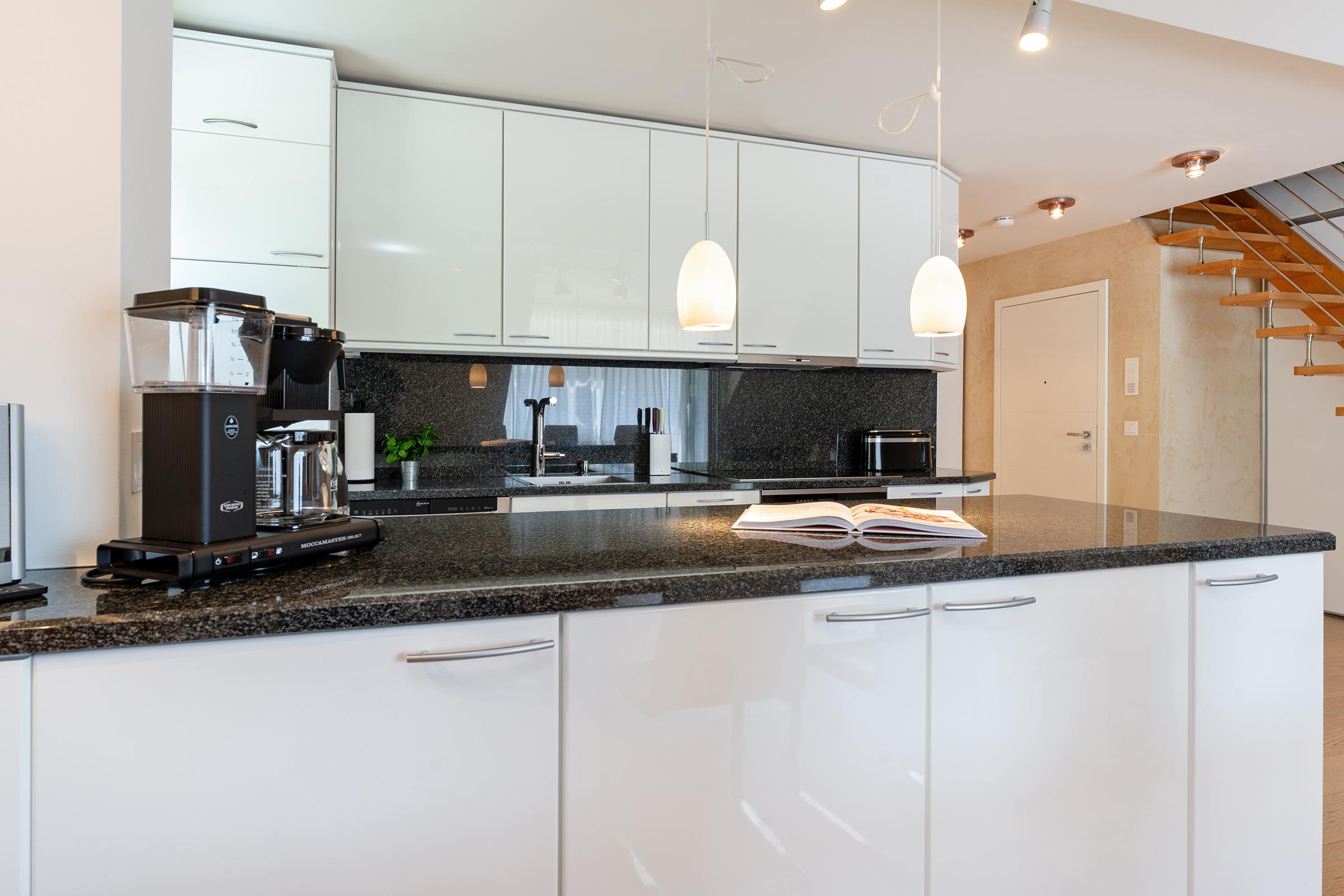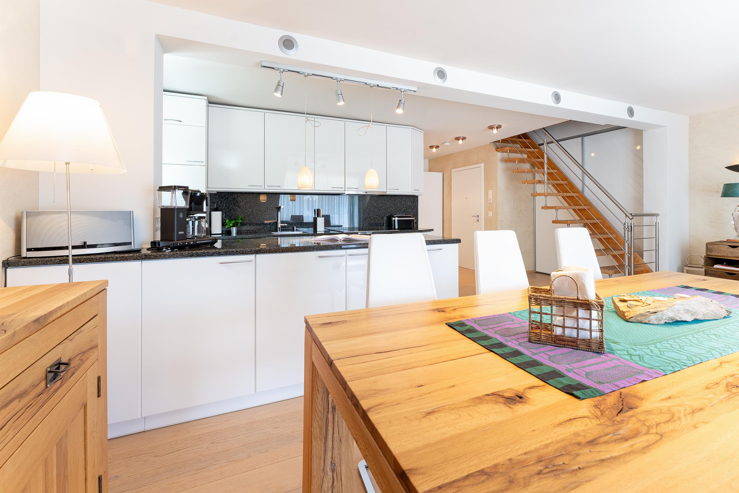 Die offene Küche ist bestens ausgestattet und bietet alles, was Sie für Ihre kulinarischen Vorhaben benötigen. Neben einem Induktionsherd und einem Backofen stehen Ihnen ein Kühlschrank mit Gefrierfach, eine Spülmaschine, eine Kaffeemaschine und ein Toaster zur Verfügung. Der angrenzende Essbereich bietet ausreichend Platz für gemeinsame Mahlzeiten.