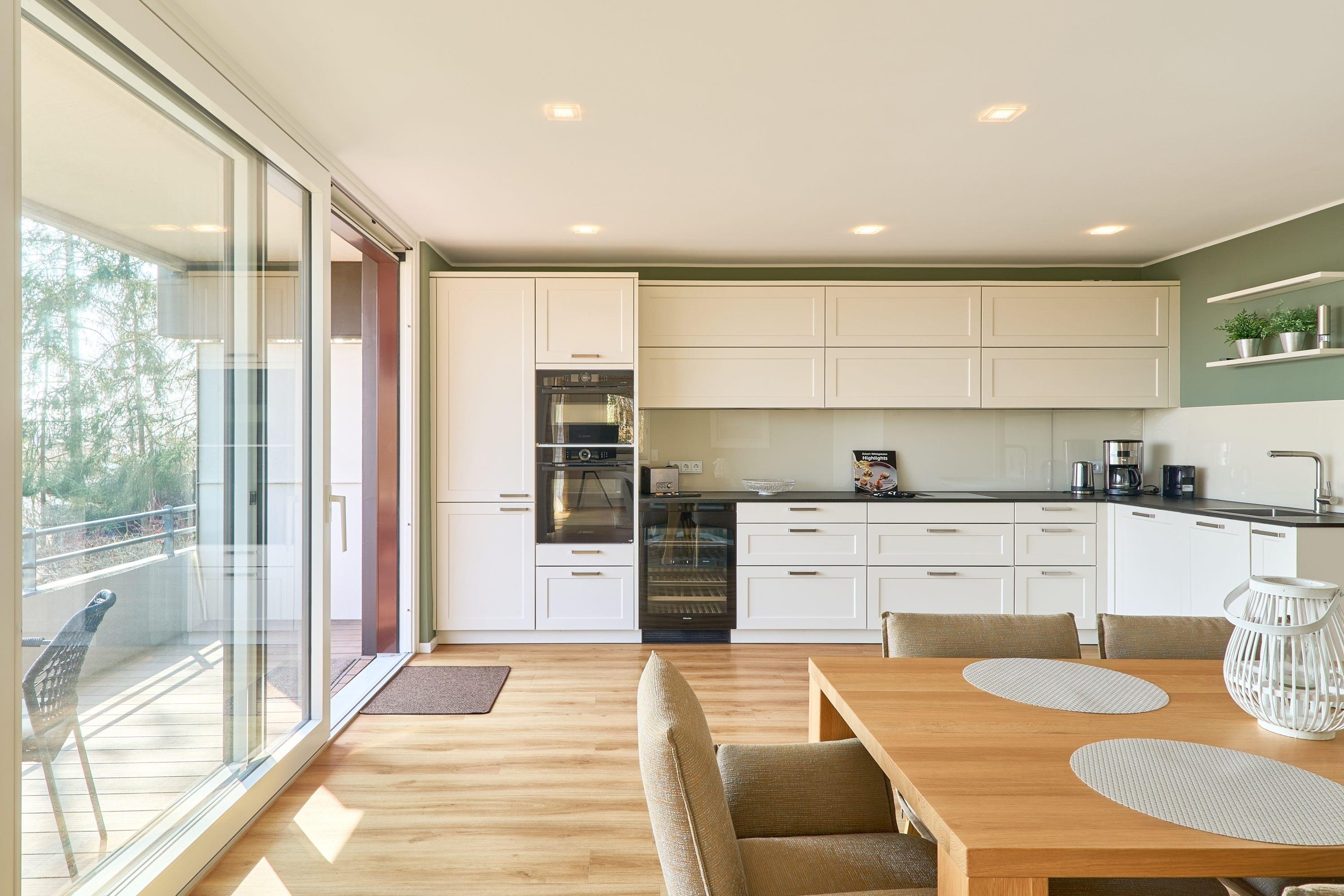 Diese schöne Wohlfühlwohnung hat einen großen Balkon mit Blick auf die Ostsee und ins Grüne. In der Wohnung erwarten Sie ein Geschmack vom Feinsten sowie Großzügigkeit. Lassen Sie sich überraschen. Eine großartige Wohnküche, ein großer[nbsp] Essbereich erwarten Sie in dieser Wohnung. Der Wohnbereich ist separiert und mit einer hochwertigen Einrichtung ausgestattet. Auch die technische Ausstattung lässt keine Wünsche offen: Ein Flachbildschirm-TV befindet sich im Wohnbereich sowie im großen Schlafzimmer. Das große Schlafzimmer ist mit einem Boxspringbett (1,80mx2,00m) ausgestattet. Die weiteren zwei Schlafzimmer besitzen Einzel-Boxspringbetten (1,00mx2,00m). Die Wohnung hat ein Tageslichtduschbad sowie ein sehr geräumiges Gäste-WC mit einer Waschmaschine. Ein Abstellraum befindet sich ebenfalls in der Wohnung. Kostenloses WLAN steht Ihnen zur Verfügung.