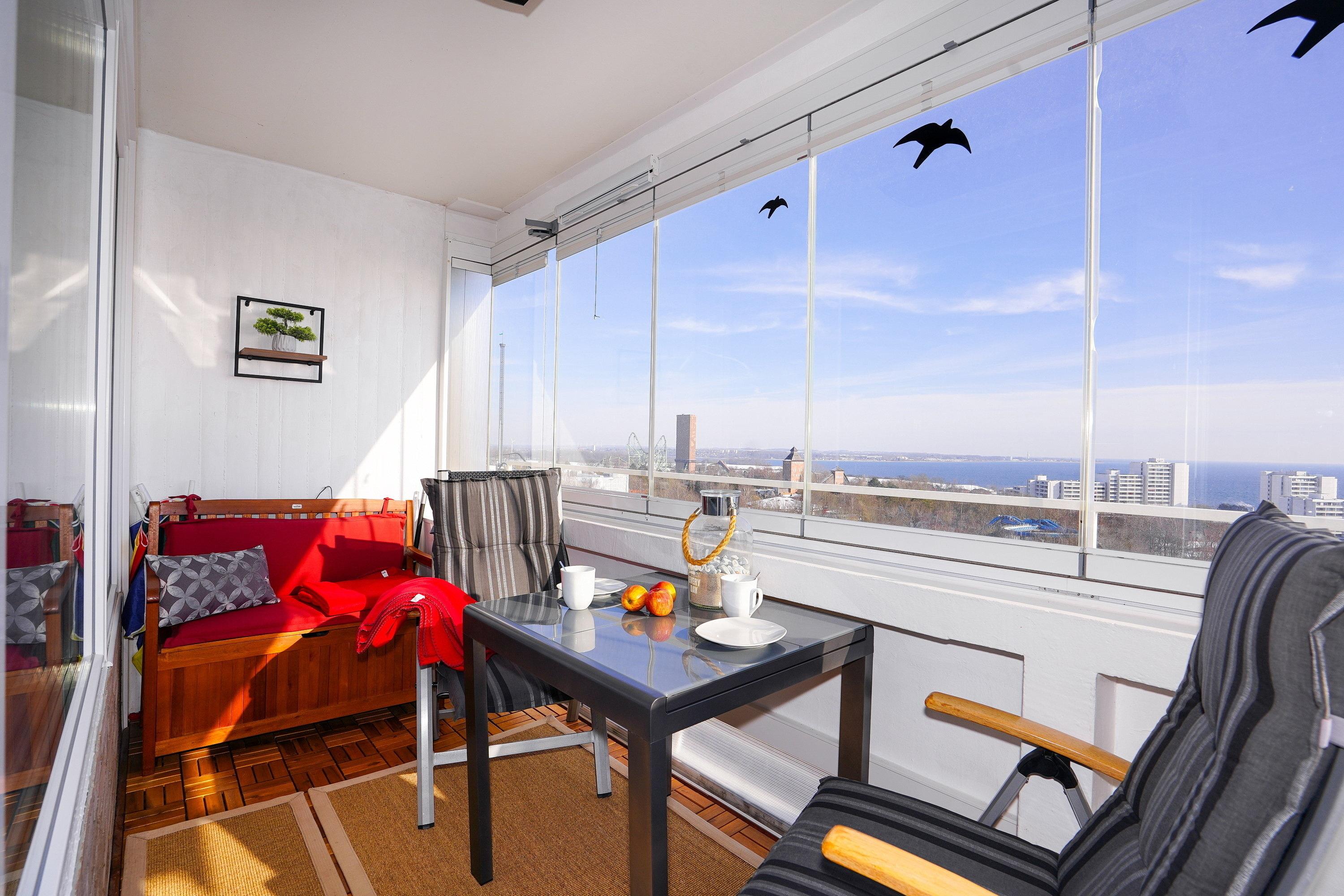 Traumblick-Ferienwohnung in Sierksdorf mit tollem Meerblick auf die Lübecker Bucht und verglastem Balkon für entspannte Urlaubstage.