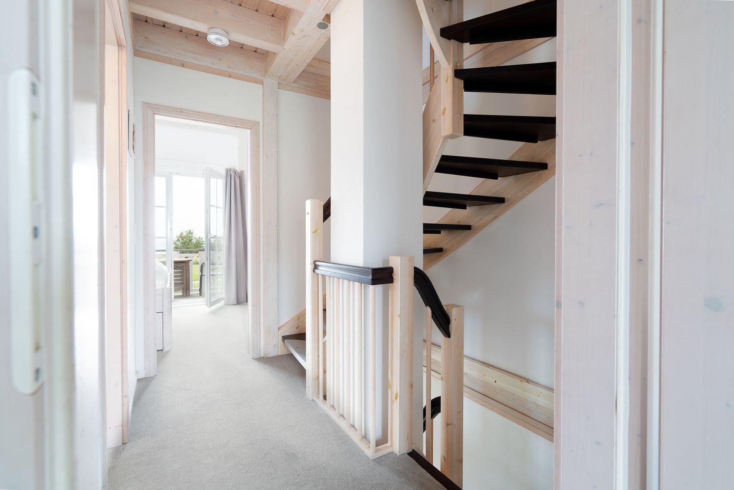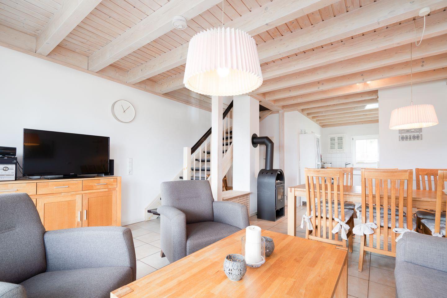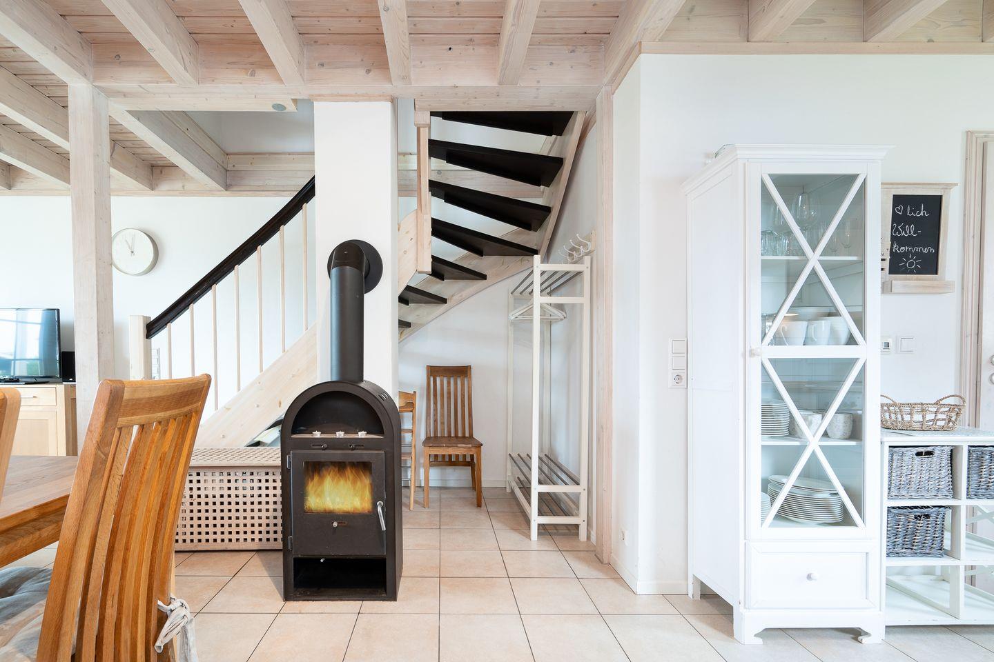 Der Wohn- und Essbereich mit offener Küche und Kamin liegen im Erdgeschoss. Die moderne Küche ist mit Spülmaschine, Backofen, Herd und Waschmaschine ausgestattet. Die Sauna mit Dusche und WC finden Sie ebenfalls im Erdgeschoss. Der Komfort einer eigenen Sauna wird sehr von unseren Wintergästen geschätzt. Vom Wohn- und Essbereich haben Sie Zugang zur Terrasse, von der Sie Blick auf die Ostsee haben. In der ersten Etage sind zwei Schlafräume mit Doppelbetten, sowie das Bad mit Whirlwanne. Einen dritten Schlafbereich mit zwei getrennten Einzelbetten finden Sie in der 2. Etage in einer offenen Schlafgalerie unterm Dach. Die Beheizung erfolgt über Elektroheizungen und den Kamin.