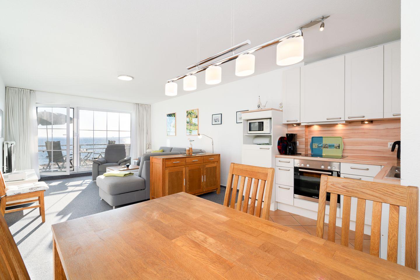 Die Ferienwohnung besteht aus einem großen sonnigen Zimmer mit einem kombinierten Wohn-, Ess- und Küchenbereich, einem Schlafzimmer mit Blick aufs Meer, einem kleinen innen liegendem Kinderzimmer mit Etagenbett, ein helles Duschbad, der Flur mit Schrankablage und zwei Balkonen zum Strand ausgerichtet.