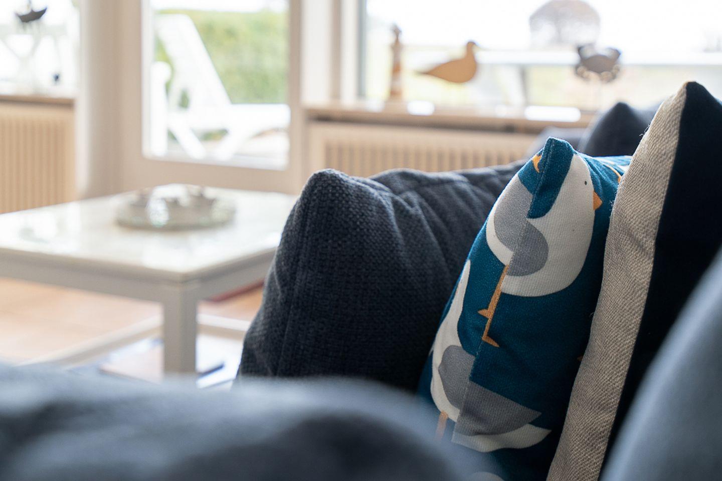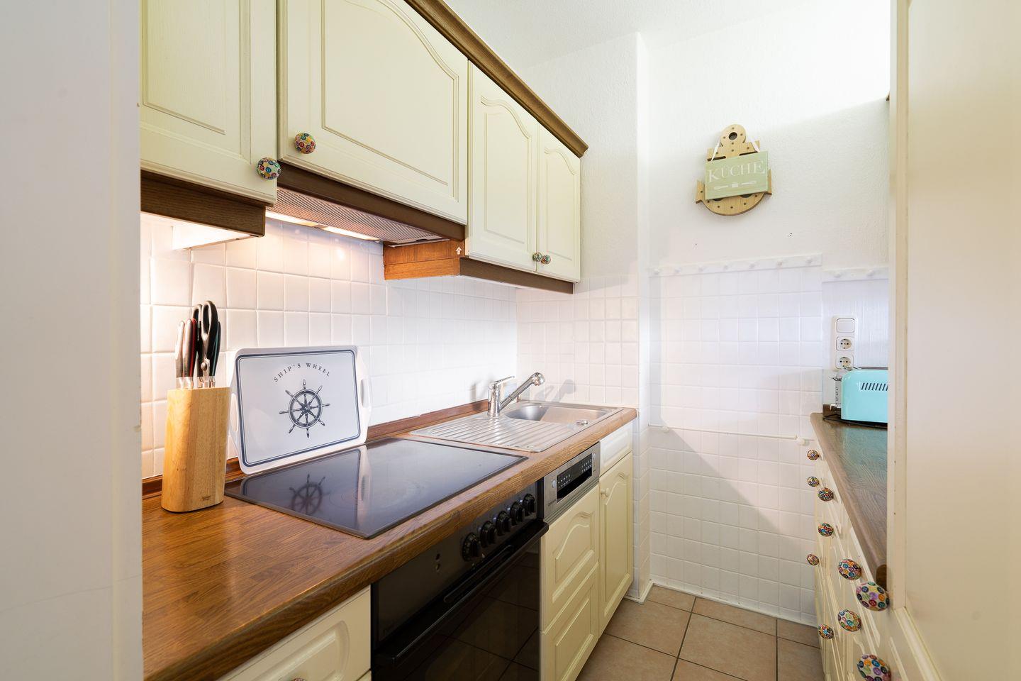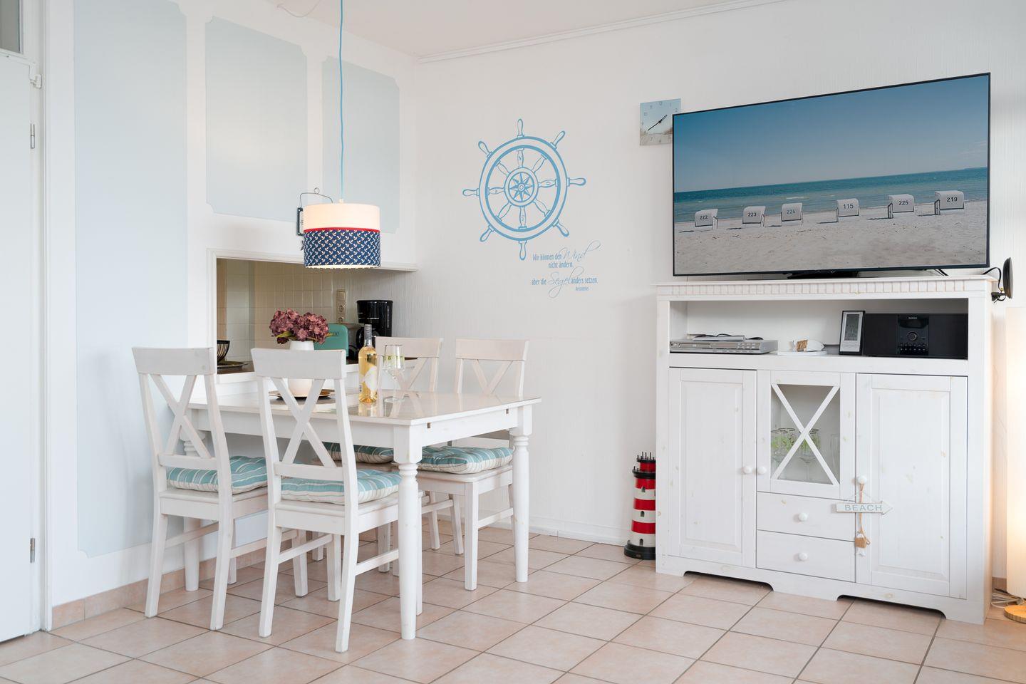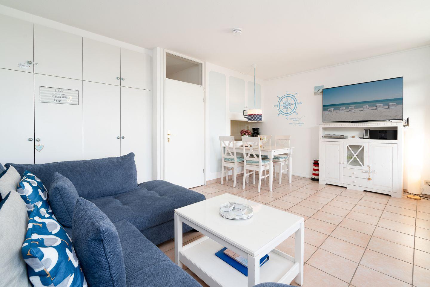 Das Apartment Nr. 015 befindet sich in der 1. Reihe der Terrassenhäuser in unmittelbarer Strandnähe. Genießen Sie von der Terrasse aus den Meerblick. Die Küche mit Spülmaschine und Backofen hat eine Durchreiche zum maritimen Wohn-und Esszimmer. Ein Schlafzimmer mit Doppelbett, ein Kinderzimmer mit Etagenbett und ein Badezimmer mit Dusche runden diese Ferienunterkunft ab. Die Schlafräume haben ein Oberlicht zum Öffnen. WLAN ist inklusive.