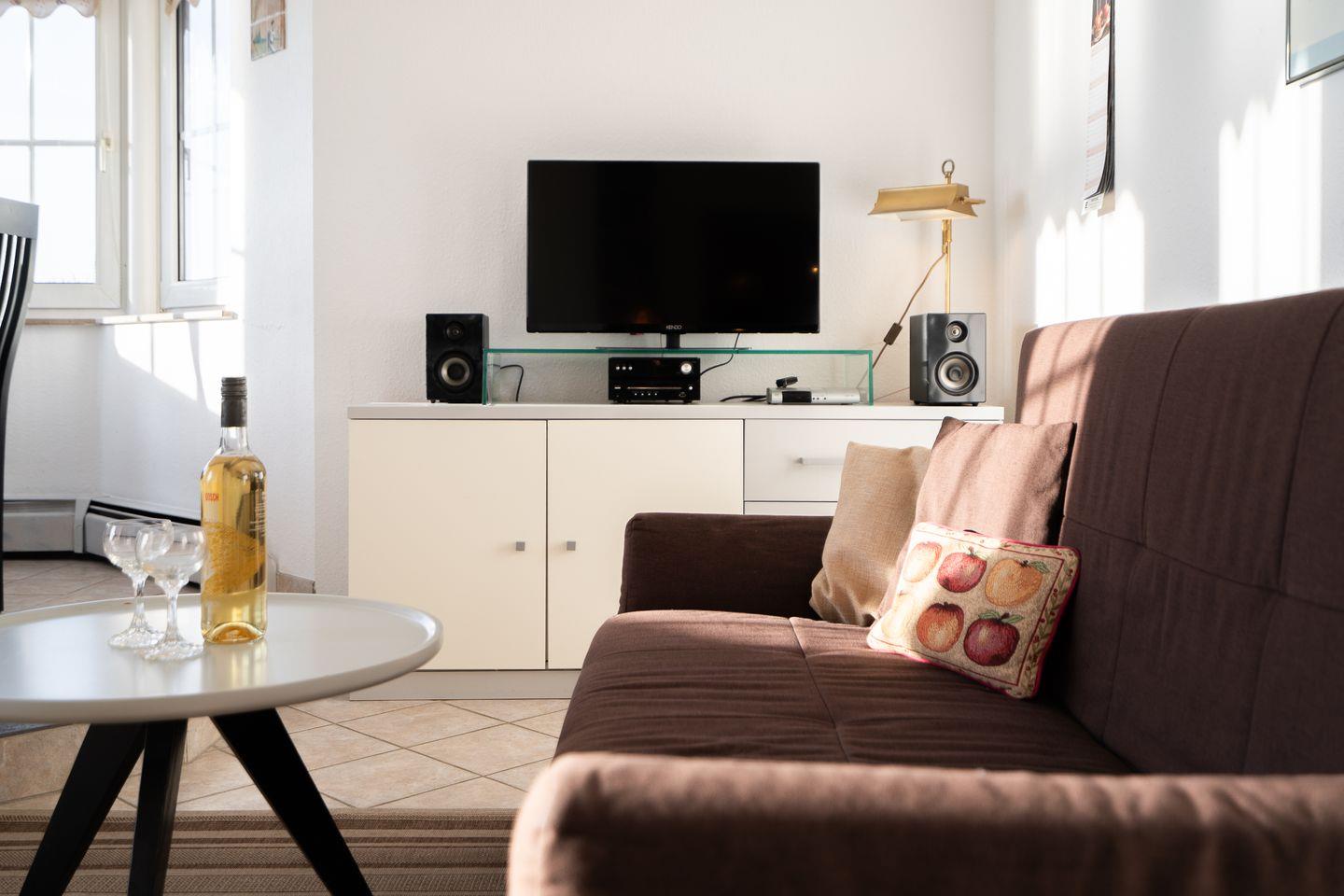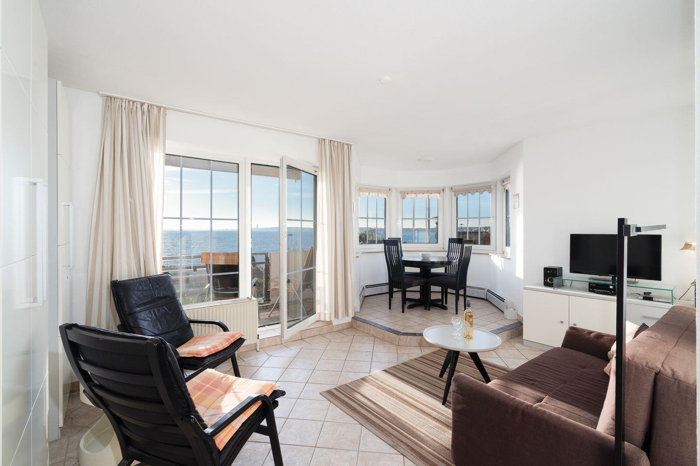 Das Apartment besteht aus einem Wohnraum mit erhöhter Essecke im Erker, diese bietet einen schönen Blick aufs Wasser. Im Wohnbereich steht ein TV-Gerät, dazu passend 2 Sessel und eine Couch, diese kann zu einer Schlafcouch umgewandelt werden, es können hier 2 Personen schlafen. ( 140 x 190 cm). Es gibt einen extra Schlafraum mit zwei Einzelbetten und Fenster. Die Küchenzeile ist offen zum Wohnbereich hin. Das Bad ist geräumig mit Dusche, WC und Waschbecken. Die Wohnung ist durchgehend gefliest.