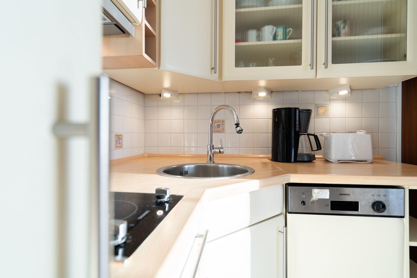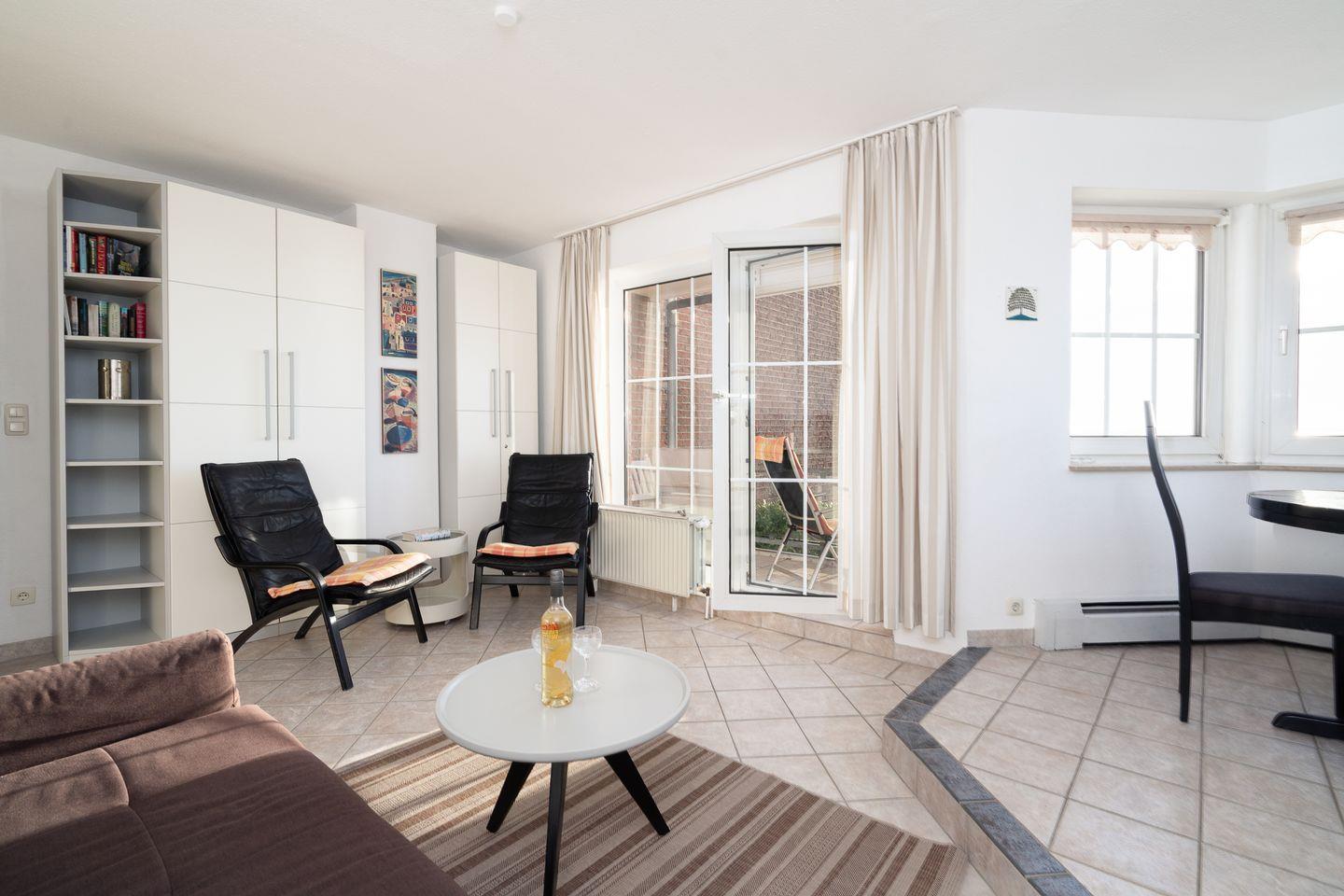 Das Apartment besteht aus einem Wohnraum mit erhöhter Essecke im Erker, diese bietet einen schönen Blick aufs Wasser. Im Wohnbereich steht ein TV-Gerät, dazu passend 2 Sessel und eine Couch, diese kann zu einer Schlafcouch umgewandelt werden, es können hier 2 Personen schlafen. ( 140 x 190 cm ). Es gibt einen extra Schlafraum mit zwei Einzelbetten (jeweils 80 x 200 cm) und Fenster. Die Küchenzeile ist offen zum Wohnbereich hin. Das Bad ist geräumig mit Dusche, WC und Waschbecken. Die Wohnung ist durchgehend gefliest.