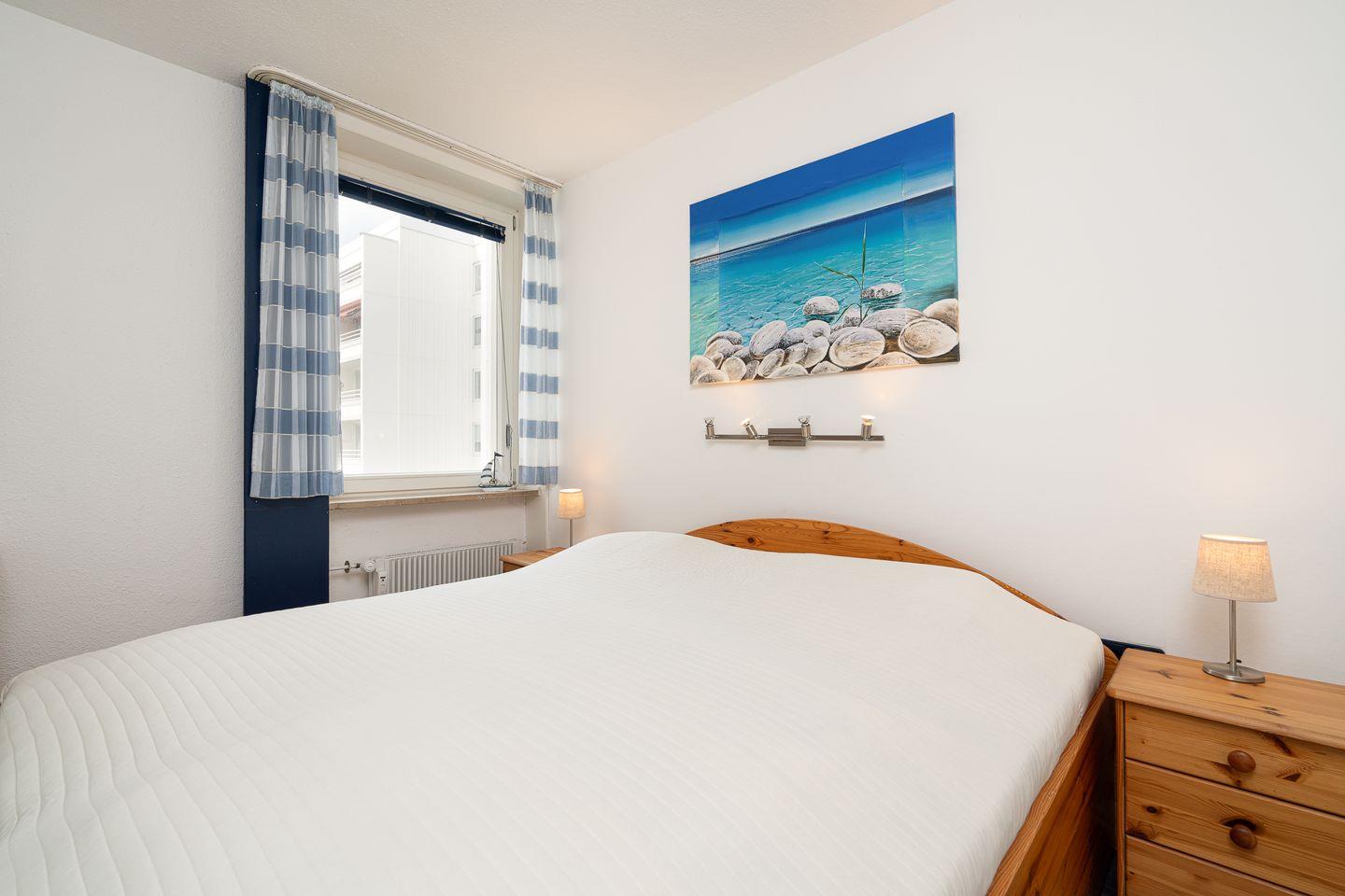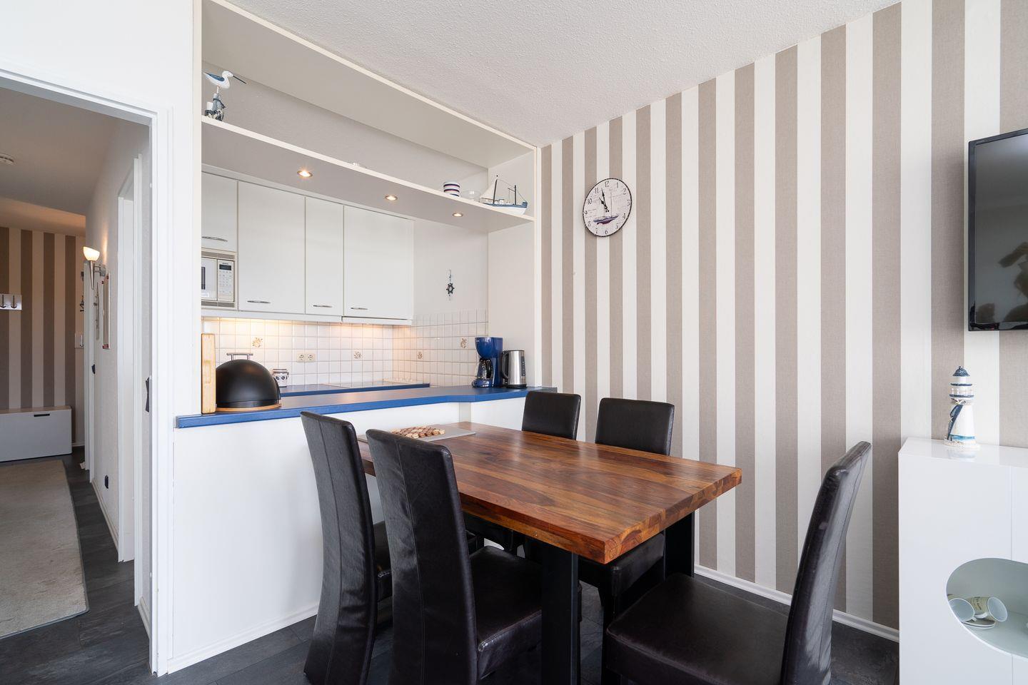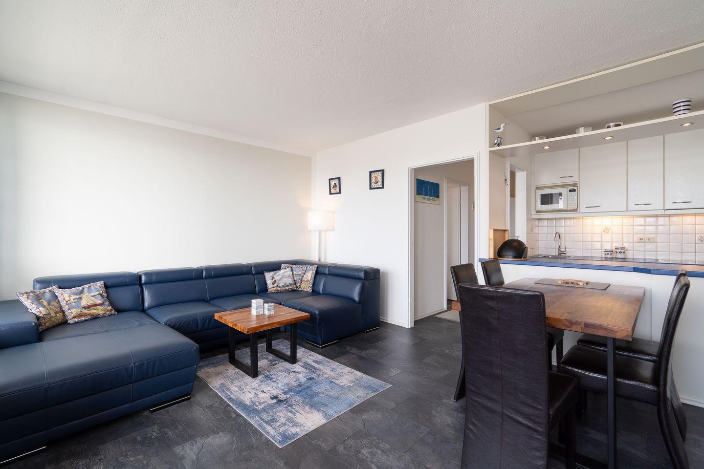 Die mit Spülmaschine, Backofen und Herd gut ausgestattete Küche ist in den kombinierten Wohn-/Essbereich integriert. Das erste Schlafzimmer hat ein Doppelbett (2x 90 x 200 cm), das zweite Schlafzimmer hat ein Etagenbett (jeweils 90 x 180 cm). Das modernisierte Duschbad ist innenliegend. Der PKW-Stellplatz im Parkdeck ist nur über eine Treppe erreichbar, ein Seiteneingang führt zum Fahrstuhl zum ebenerdigen Be-und Entladen. Zum Strand sind es nur wenige Gehminuten.