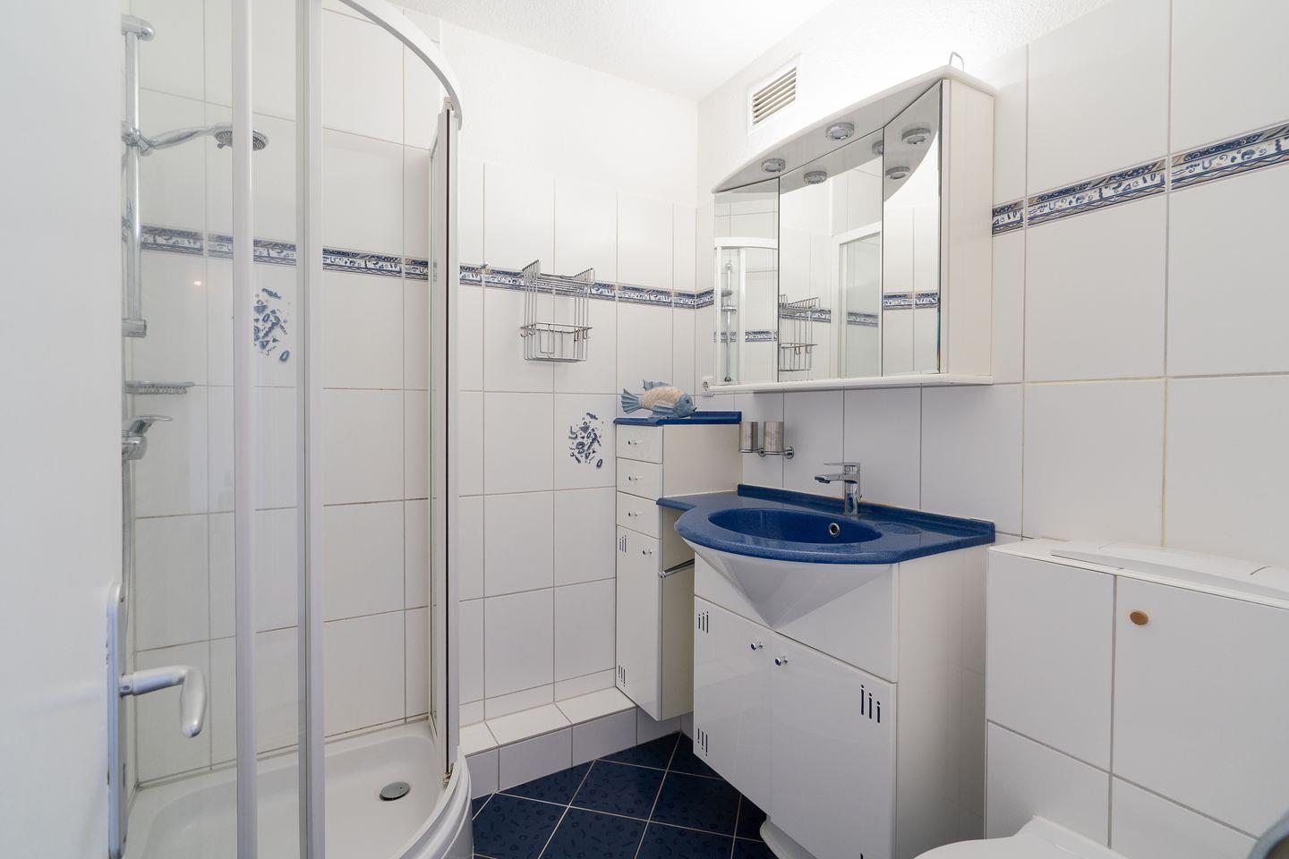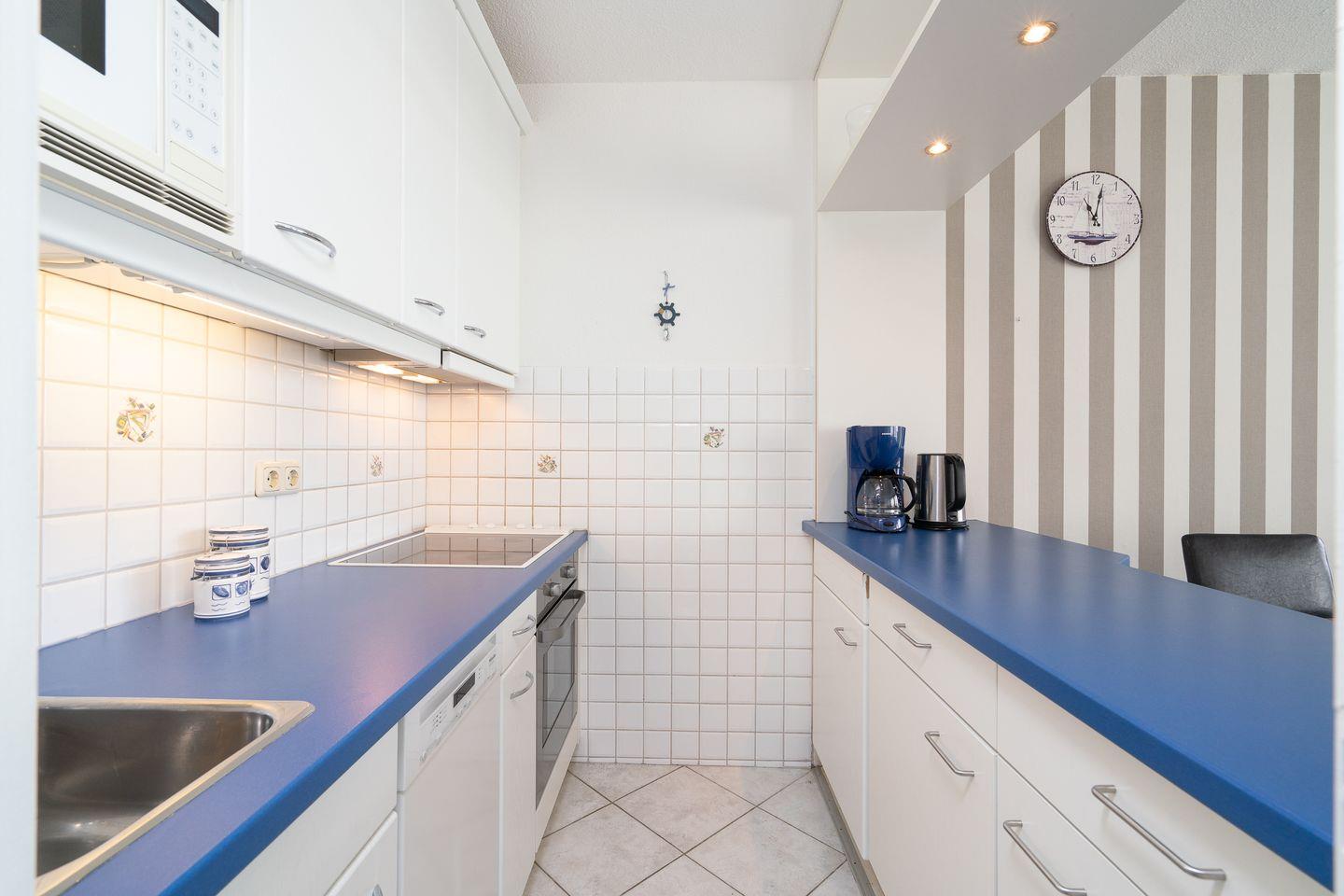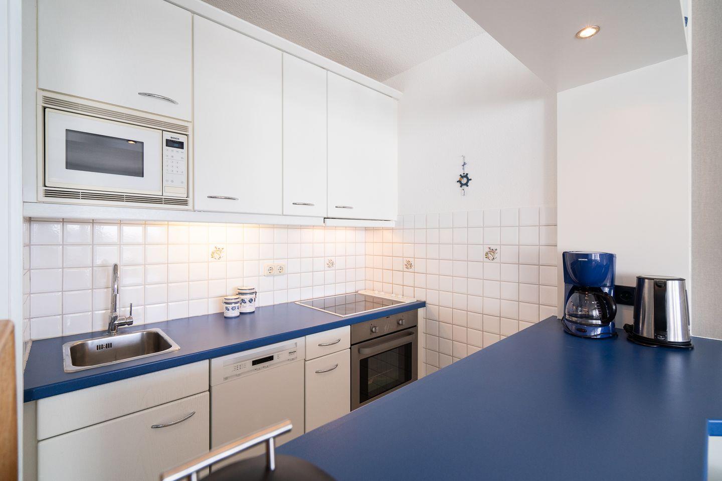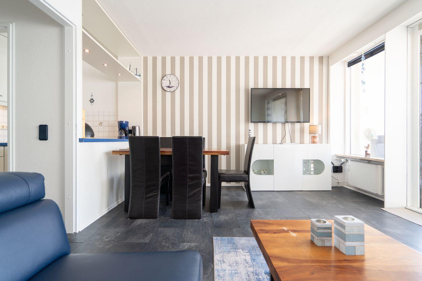 Die mit Spülmaschine, Backofen und Herd gut ausgestattete Küche ist in den kombinierten Wohn-/Essbereich integriert. Das erste Schlafzimmer hat ein Doppelbett (2x 90 x 200 cm), das zweite Schlafzimmer hat ein Etagenbett (jeweils 90 x 180 cm). Das modernisierte Duschbad ist innenliegend. Der PKW-Stellplatz im Parkdeck ist nur über eine Treppe erreichbar, ein Seiteneingang führt zum Fahrstuhl zum ebenerdigen Be-und Entladen. Zum Strand sind es nur wenige Gehminuten.