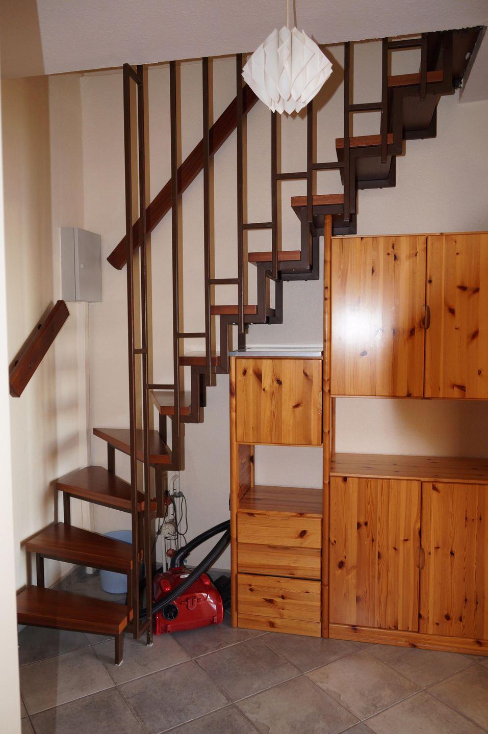 Die Ferienwohnung geht über 2 Etagen - über eine schmale Treppe geht es nach oben, hier stehen Ihnen 2-3 Schlafgelegenheiten unter der Dachschräge zur Verfügung. Von dem kleinen Flur geht es ins Duschbad und in den Wohnbereich mit Küchenzeile, diese ist gefliest. Im Schlafbereich liegt Teppich. Für die Eltern steht eine Schlafcouch zum Ausziehen im Wohnraum bereit. Die Wohnung ist einfach, aber zweckmäßig ausgestattet und befindet sich in der zweiten Etage. In dem Haus gibt es keinen Fahrstuhl.