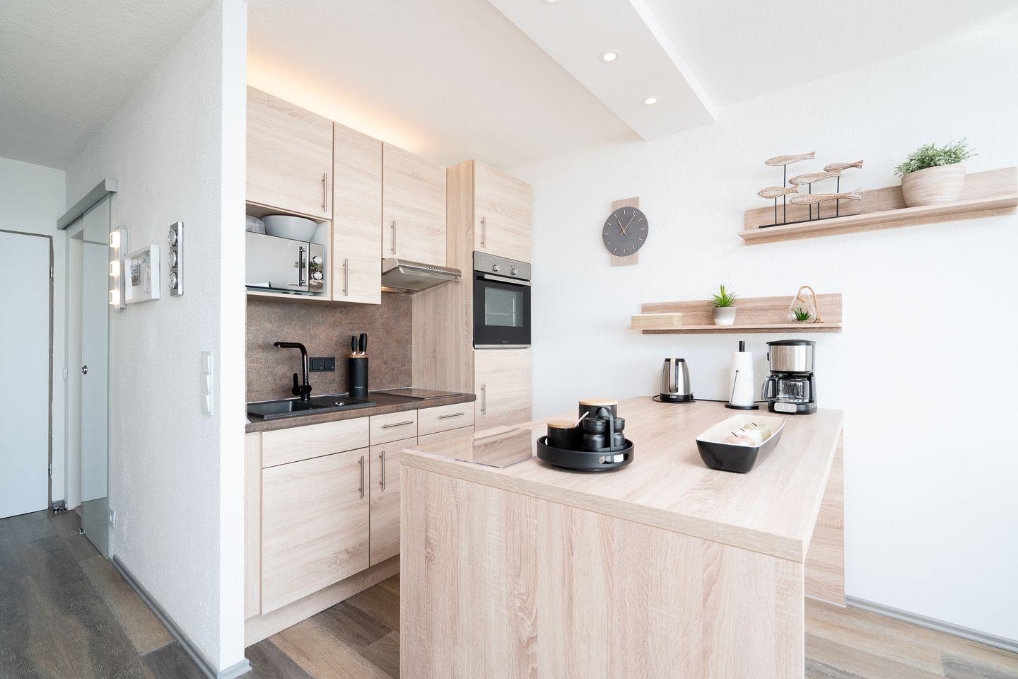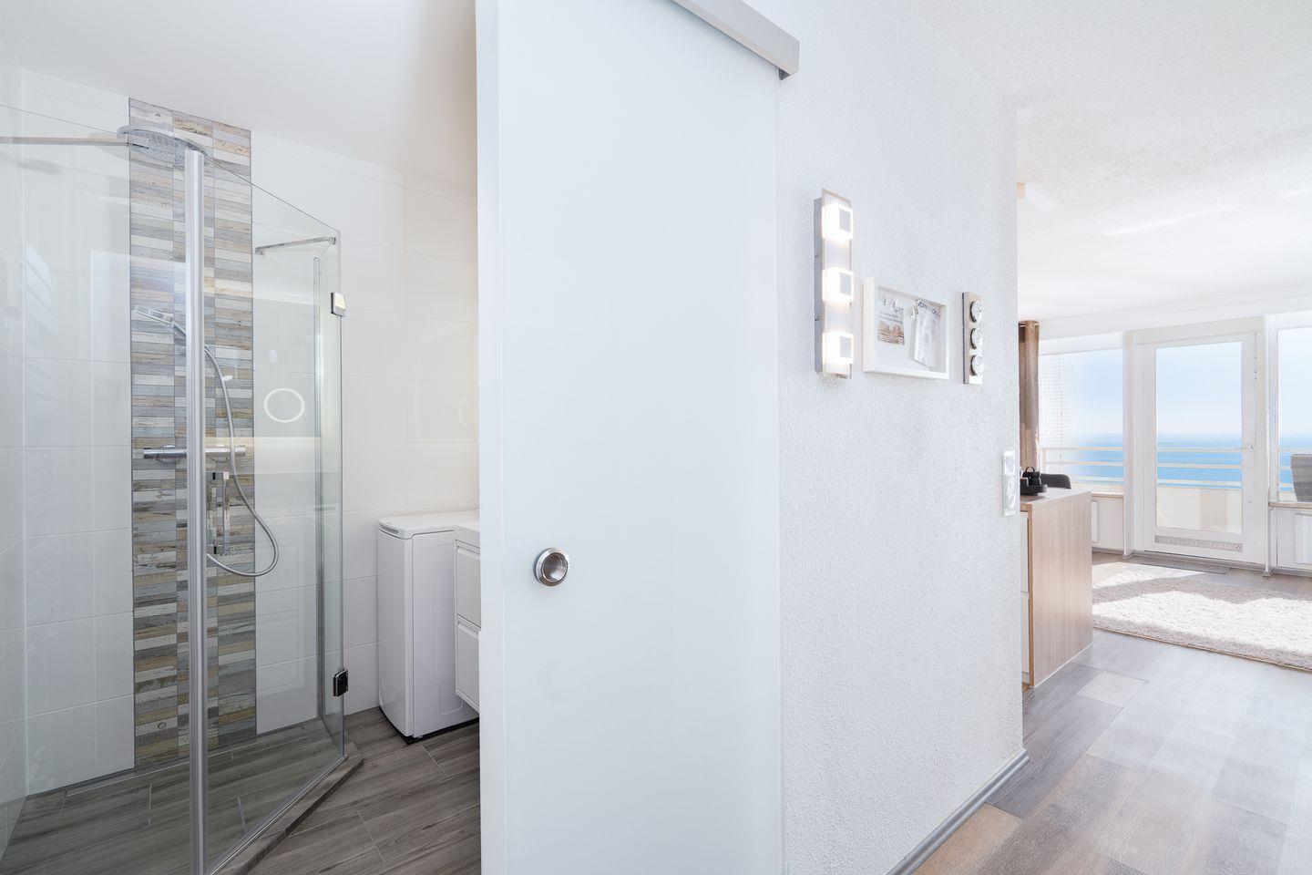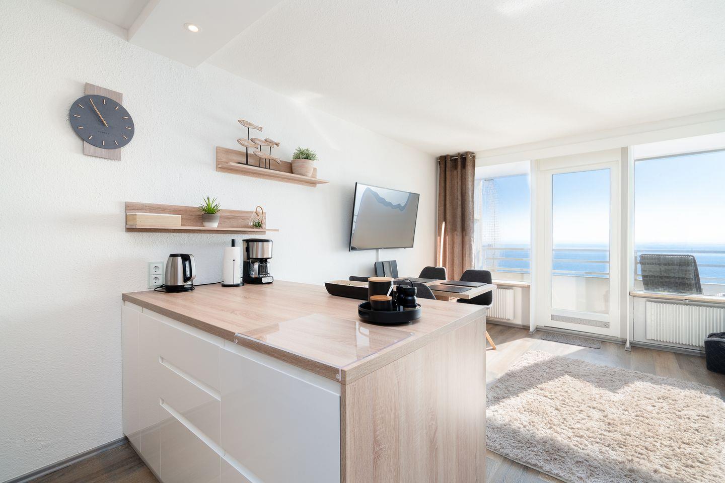 die komfortable und geschmackvoll eingerichtete Wohnung befindet sich in der 9. Etage mit Balkon in Süd-Ost-Lage und traumhaftem Ostseeblick über die Lübecker Bucht. Die moderne und mit Spülmaschine, Backofen und kleinem Kochfeld ausgestattete Küche ist mit einer Kücheninsel zum gemütlichen Wohn- und Essbereich offen. Im Schlafraum steht ein Doppelbett (180 cm x 200 cm). Im Wohnbereich steht zudem eine Schlafcouch (140 cm x 190 cm). Es gibt ein innenliegendes, modernisiertes Duschbad. Zum Strand sind es nur wenige Gehminuten. PKW-Stellplatz im Parkdeck, es führen Treppen von dort aus zur Wohnung. Über einen Seiteneingang gelangt man zum Fahrstuhl für ebenerdiges Be-und Entladen.