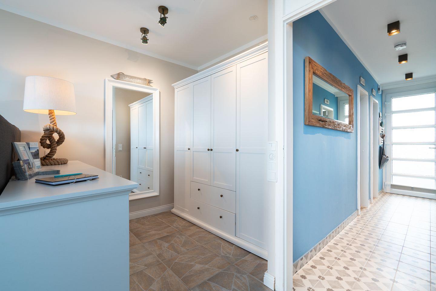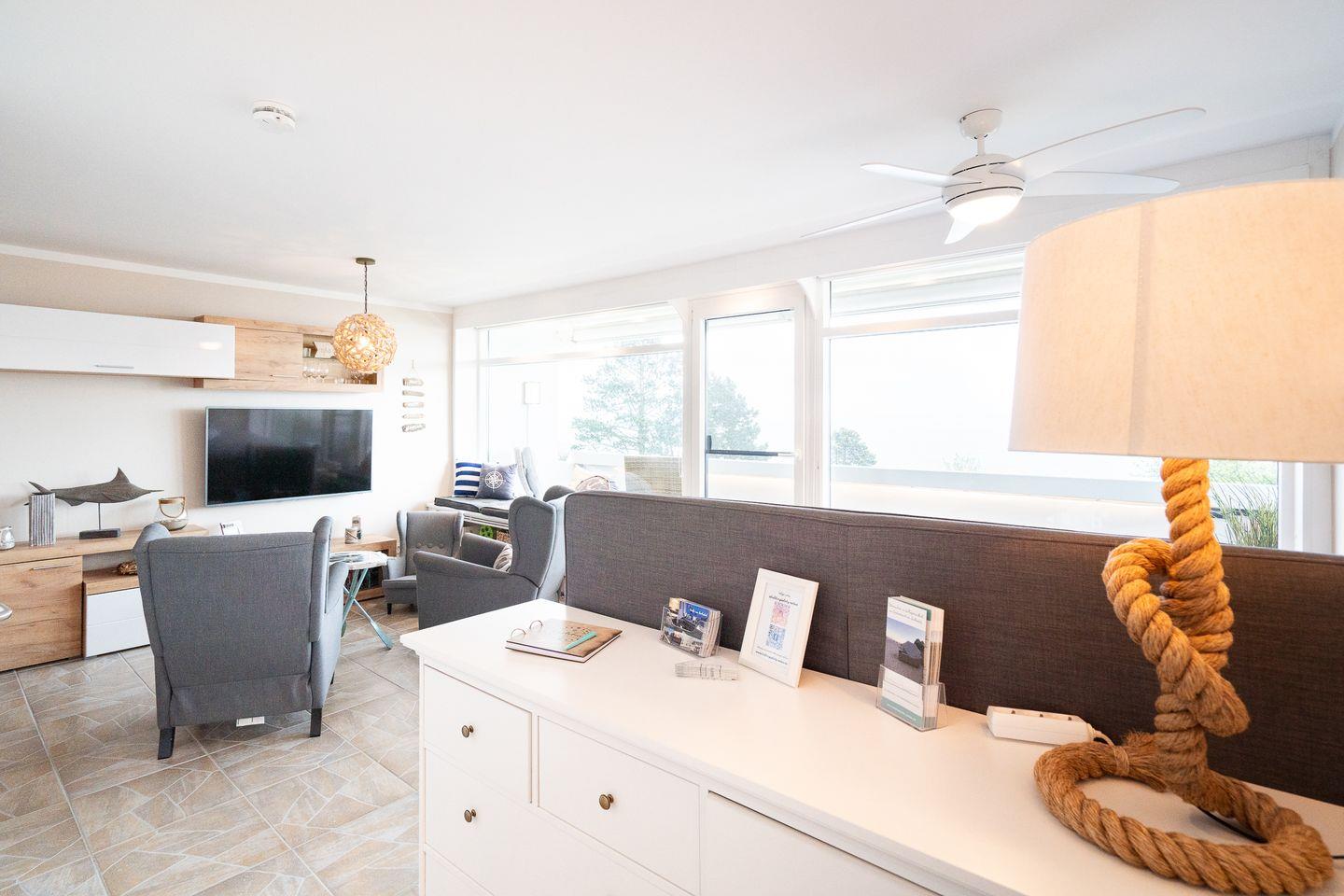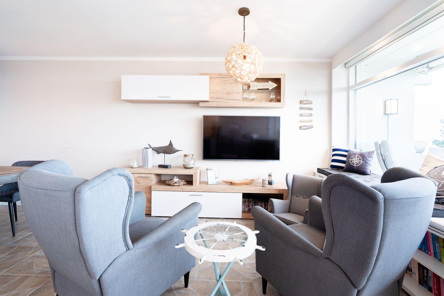 Die Ferienwohnung mit Balkon bietet allen Komfort für erholsame und entspannte Tage an der Ostsee. Von Sonnenaufgang bis zum Nachmittag können Sie die Sonne genießen, eine Markise ist auf dem Balkon vorhanden. Mit 55qm Wohnfläche ist Platz für bis zu 4 Personen. Das helle und maritim gestaltete Wohnzimmer bietet durch die großen Panoramafenster einen atemberaubenden Blick auf die Ostsee. Hier finden Sie ein Boxspringbett (160 cm x 200 cm) direkt vor der großen Panoramascheibe. Verdunklungsrollos sorgen für einen erholsamen Schlaf. Im separaten Schlafraum mit TV befindet sich ein ausziehbares Einzelbett (2x 80 x 200 cm). Der Essbereich und eine Wohnlandschaft mit zwei Ruhesesseln und Leseecke mit Flatscreen-TV (55 Zoll) runden die tolle Ausstattung der Wohnung ab. Eine große Auswahl an Gesellschaftsspielen, Büchern und DVDs lädt zum gemütlichen und entspannten Verweilen ein. Die separate Küche ist klein, aber hochwertig mit Backofen und Herd ausgestattet. Das moderne Duschbad ist innenliegend. Ohne eine Straße überqueren zu müssen, sind es nur wenige Gehminuten zum schönen Sandstrand. PKW-Stellplatz inklusive.
