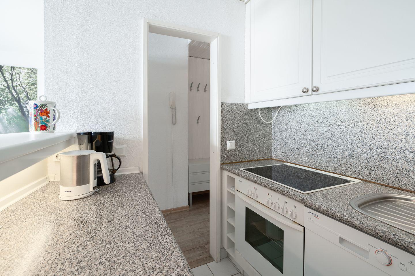 Die Küche ist mit einer Durchreiche zum Wohn- und Essbereich hin offen und ist mit Spülmaschine, Herd und Backofen ausgestattet. Im ersten Schlafraum steht ein französisches Bett (140 cm x 200 cm), im zweiten Schlafraum ein Einzelbett (90 cm x 200 cm). Das Duschbad ist innenliegend. Ohne eine Straße überqueren zu müssen, sind es nur wenige Gehminuten zum schönen Sandstrand.