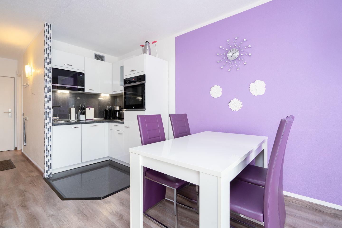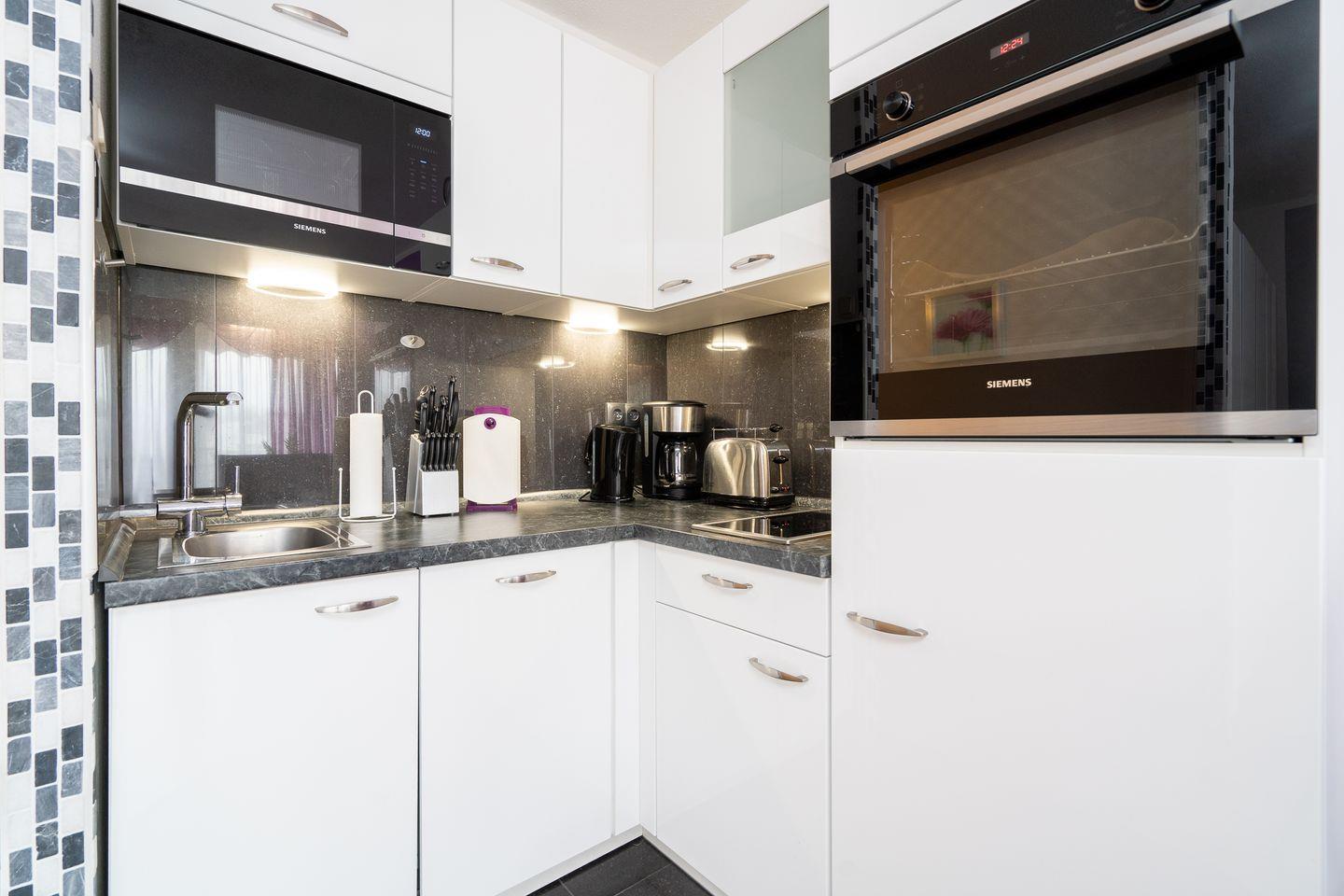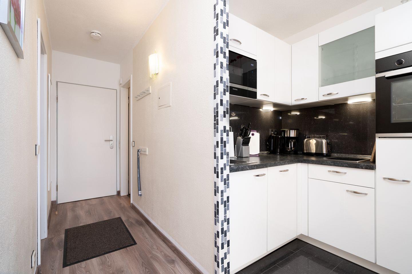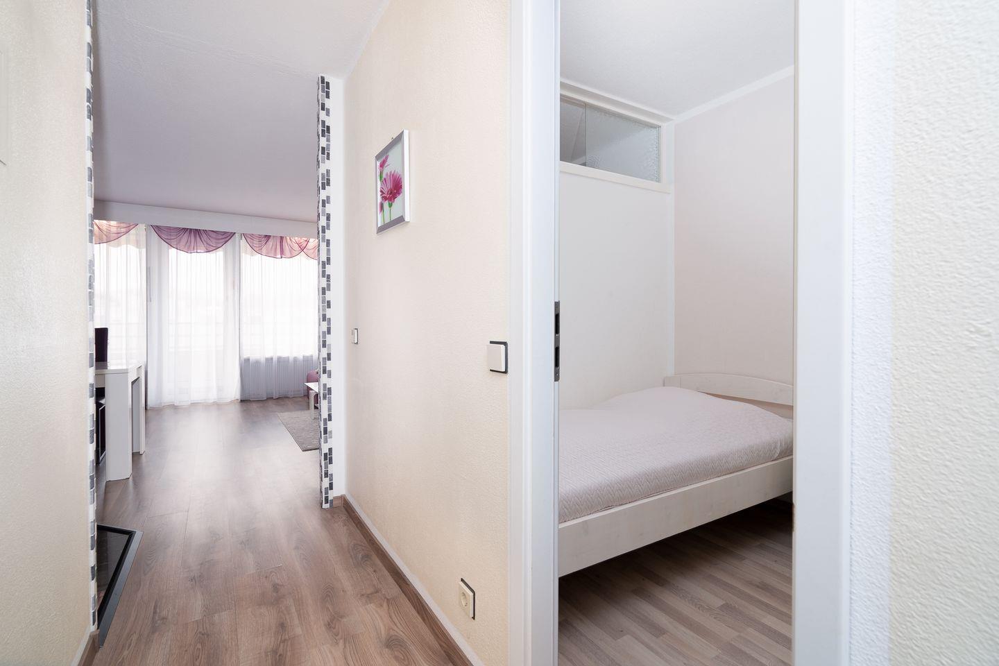 die Wohnung befindet sich im Hochparterre eines Hochhauses mit Balkon in Süd-West-Lage und Mini-Meerblick :) Vom kombinierten Wohn- und Essbereich haben Sie Zugang zum Balkon. Die Küchenzeile mit Spülmaschine, Backofen und kleinem Kochfeld ist in den Wohn- und Essbereich integriert. Im Schlafraum befinden sich zwei getrennte Betten (2x 90 cm x 190 cm), die man nicht zusammenstellen kann. Im Wohnbereich steht ein Sofa (110 x 190 cm), das Platz für eine weitere Person bietet. Es gibt ein innenliegendes, modernes Duschbad. Zum Strand und zur Promenade sind es nur wenige Schritte zu Fuß. PKW-Stellplatz inklusive.