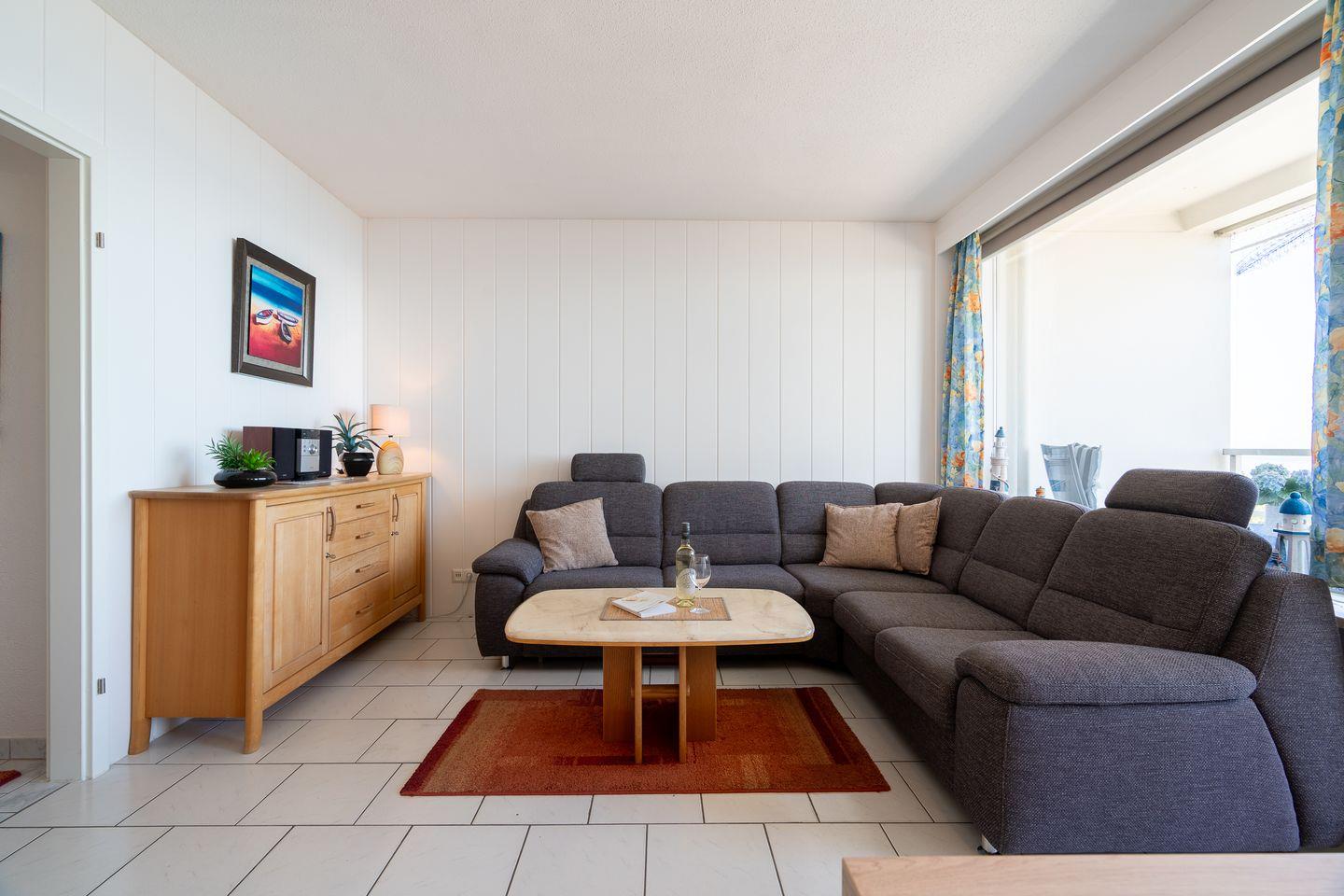 Die Ferienwohnung Nr. 406 ist eine 3-Raum-Nichtraucherwohnung in der 4. Etage mit Balkon und Ostseeblick. Die Wohnung ist für bis zu fünf Personen geeignet. im ersten Schlafraum steht ein Doppelbett, im zweiten ein Etagenbett. Das Sofa im Wohnzimmer bietet einen weiteren Schlafplatz. Die Küchenzeile ist zum Wohn- und Essbereich offen und mit Spülmaschine, Backofen und Herd ausgestattet. Das Wannenbad ist innenliegend. Zum Strand sind es nur wenige Fußschritte.