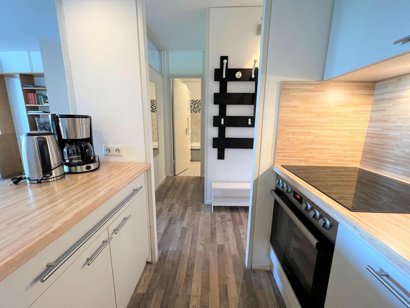 Die Wohnung liegt in der 5. Etage und hat einen Balkon in Ostlage. Dieser bietet über die Bäume hinweg einen schönen Blick auf die Ostsee. Vom kombinierten Wohn- und Essbereich haben Sie Zugang zum Balkon. Die moderne Küche ist mit Spülmaschine, Herd und Backofen ausgestattet und hat eine große Durchreiche zum Ess-/Wohnraum. Im ersten innenliegenden Schlafraum mit Glasfront zum Balkon steht ein Doppelbett mit Topper (180 cm x 200 cm) und im zweiten Schlafraum, ebenfalls innenliegend, zwei Einzelbetten (je 90cm x 190 cm). Das Wannenbad ist innenliegend. Die Wohnung ist mit Laminat ausgelegt.