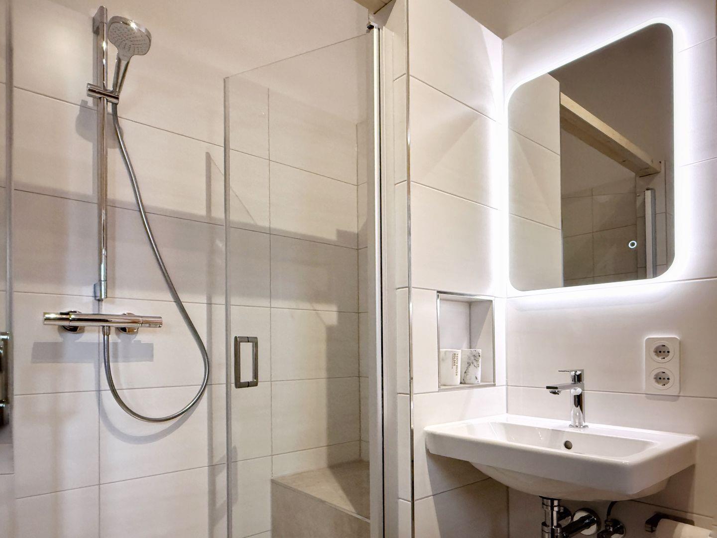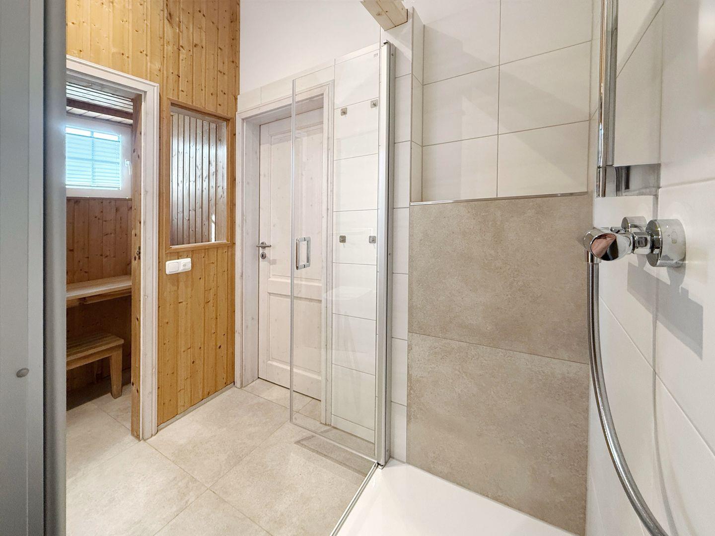 Das Badezimmer verfügt über eine bodengleiche Dusche, Waschbecken, WC und integrierter Sauna.