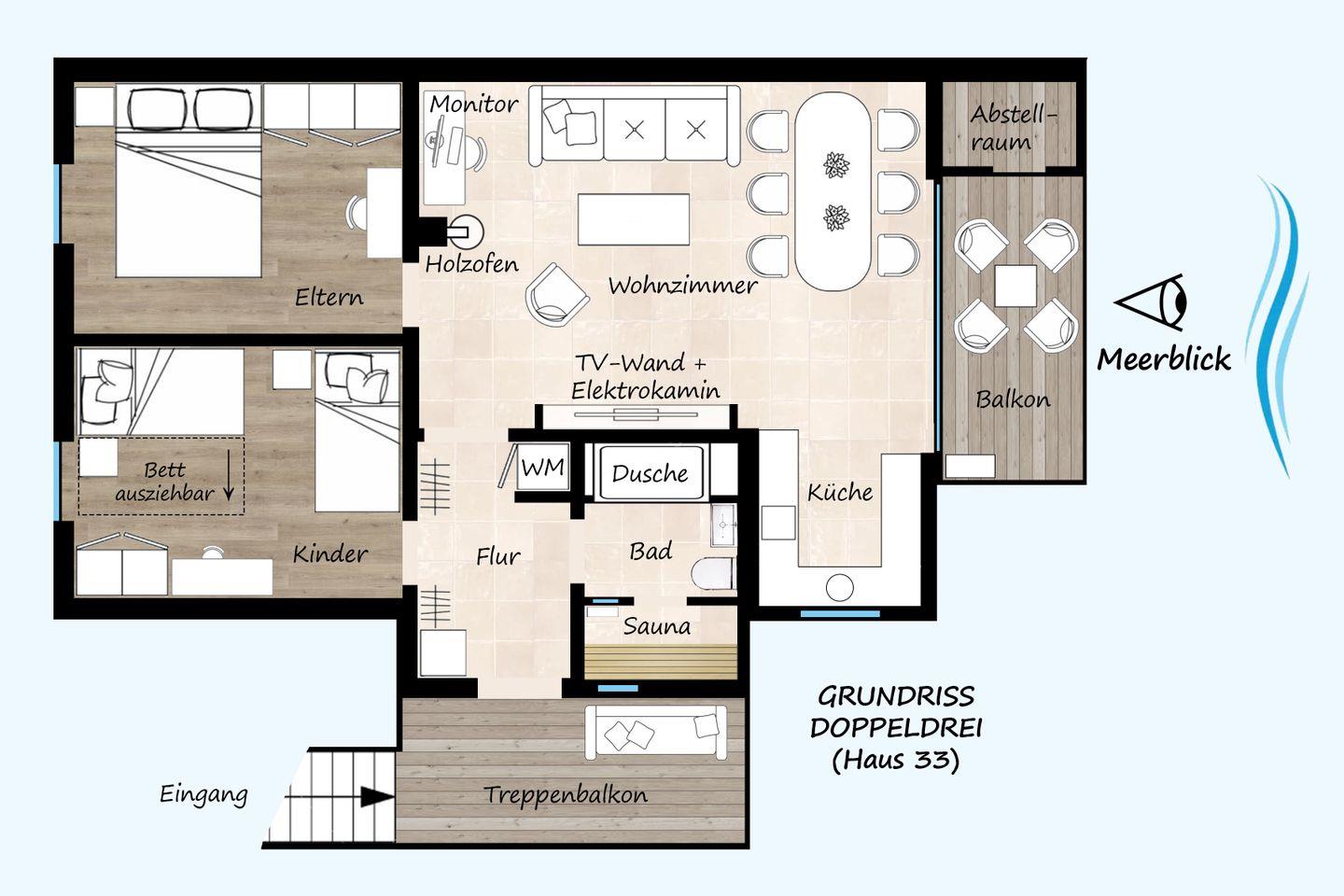 Die Ferienwohnung "Doppeldrei" im Strandpark Sierksdorf bietet ideale Voraussetzungen für einen erholsamen Ostseeurlaub. Besonders hervorzuheben sind der Balkon mit Meerblick sowie die eigene Sauna, die zu jeder Jahreszeit für entspannte Wohlfühlmomente sorgt. Die 3-Zimmer-Ferienunterkunft verfügt über ca. 70 m² Wohnfläche und bietet Platz für bis zu 5 Personen – ideal für Familien oder kleine Gruppen.