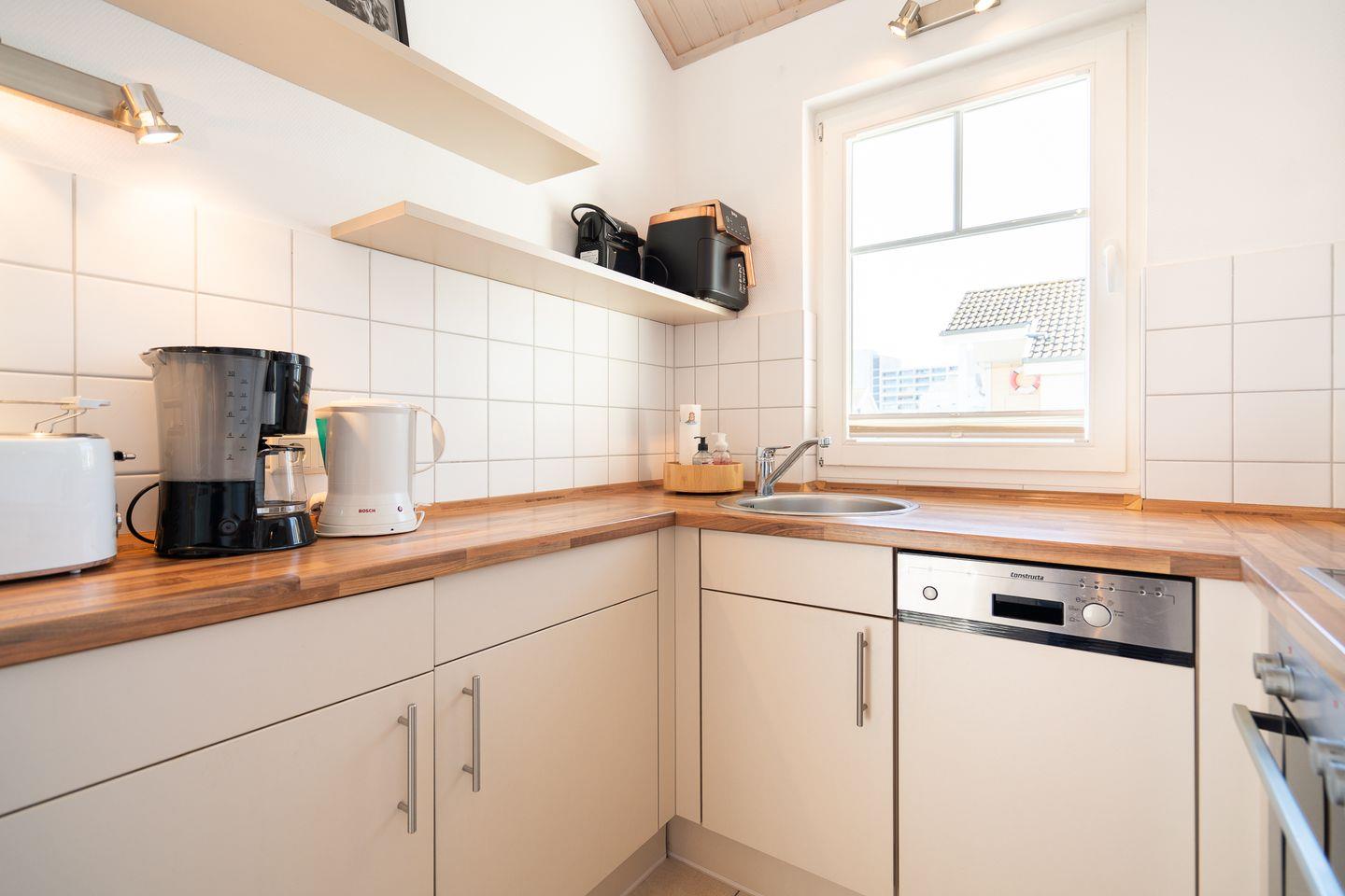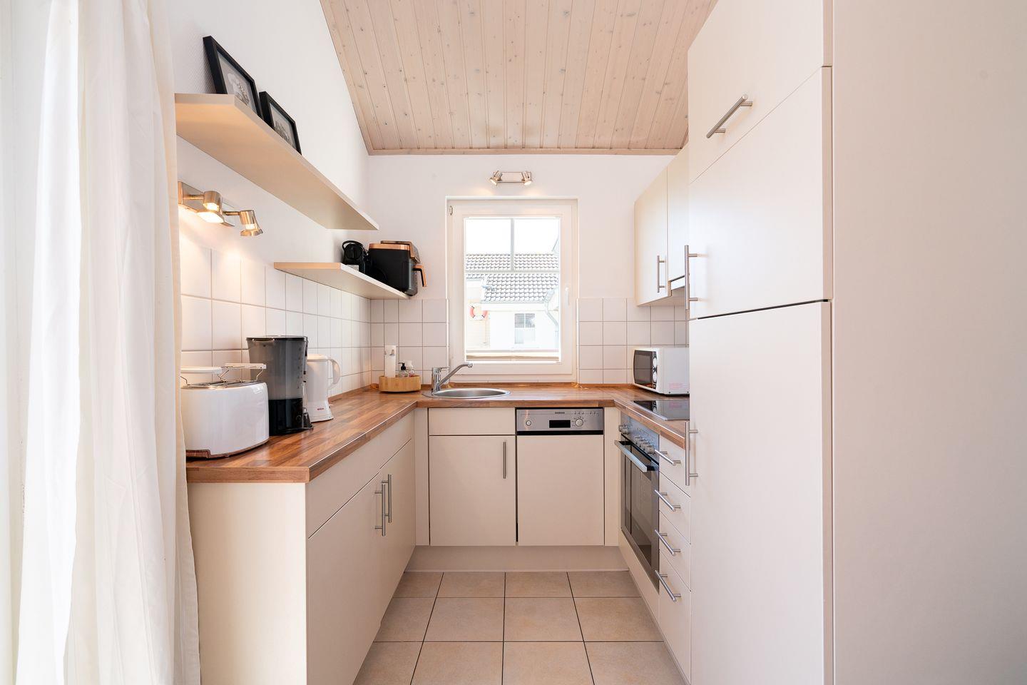 Die offene Küche ist gut ausgestattet mit Cerankochfeld, Backofen, Mikrowelle, Kühlschrank mit Gefrierfach, sowie allen grundsätzlichen Annehmlichkeiten. Eine Spülmaschine ist vorhanden und sorgt für zusätzlichen Komfort.