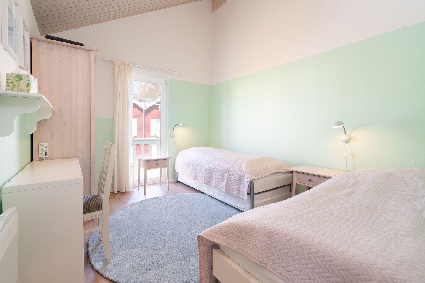 Die Wohnung verfügt über zwei separate Schlafzimmer: Ein Schlafzimmer ist mit einem Doppelbett (2x 80 x 200 cm) ausgestattet, das zweite Schlafzimmer bietet ein Einzelbett und ein ausziehbares Kojenbett mit zwei Schlafplätzen (jeweils 90 x 200 cm). Verdunklungsmöglichkeiten sorgen für erholsamen Schlaf.