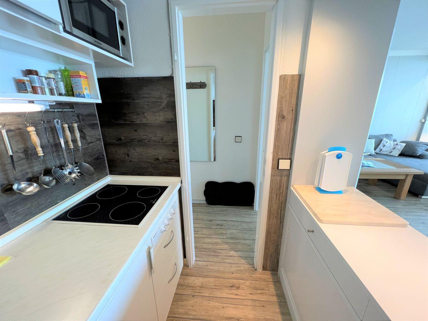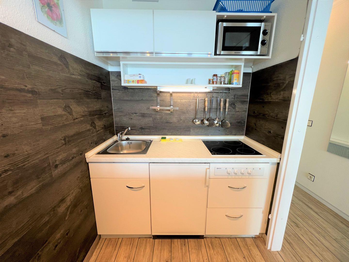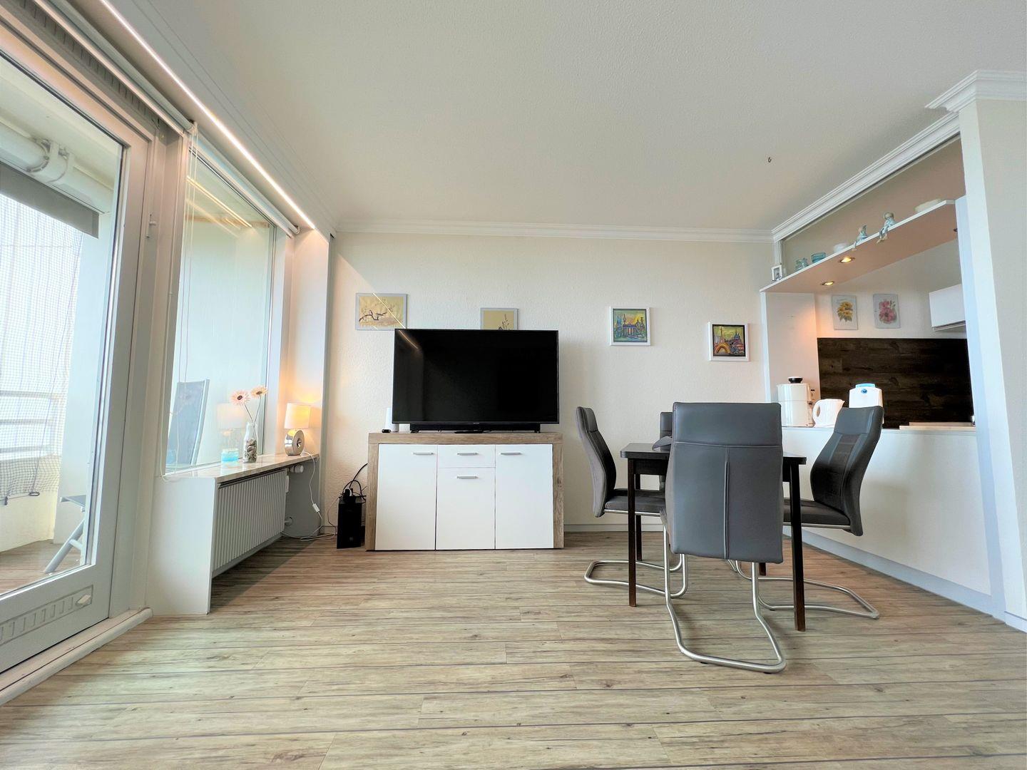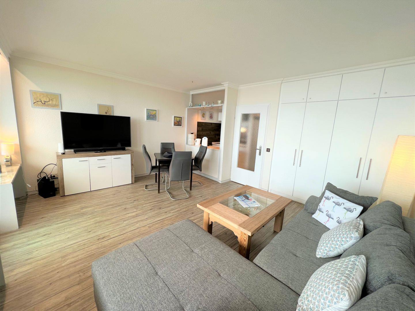 Die 2-Raum-Nichtraucher Wohnung Nr. 413 befindet sich in der 5. Etage mit Balkon in Süd-Ost-Lage und tollem Meerblick. Der Strand ist fußläufig in weniger als 5 Minuten zu erreichen. Im Schlafraum steht ein Boxspringbett (140 cm x 200 cm). Die kleine Küche mit Backofen und Herd ist mit einer Durchreiche zum Wohn-/Essbereich hin offen. Hier steht auch eine Schlafcouch für eine Person. Das modernisierte Duschbad hat ein Oberlicht zum Lüften. WLAN ist inklusive.