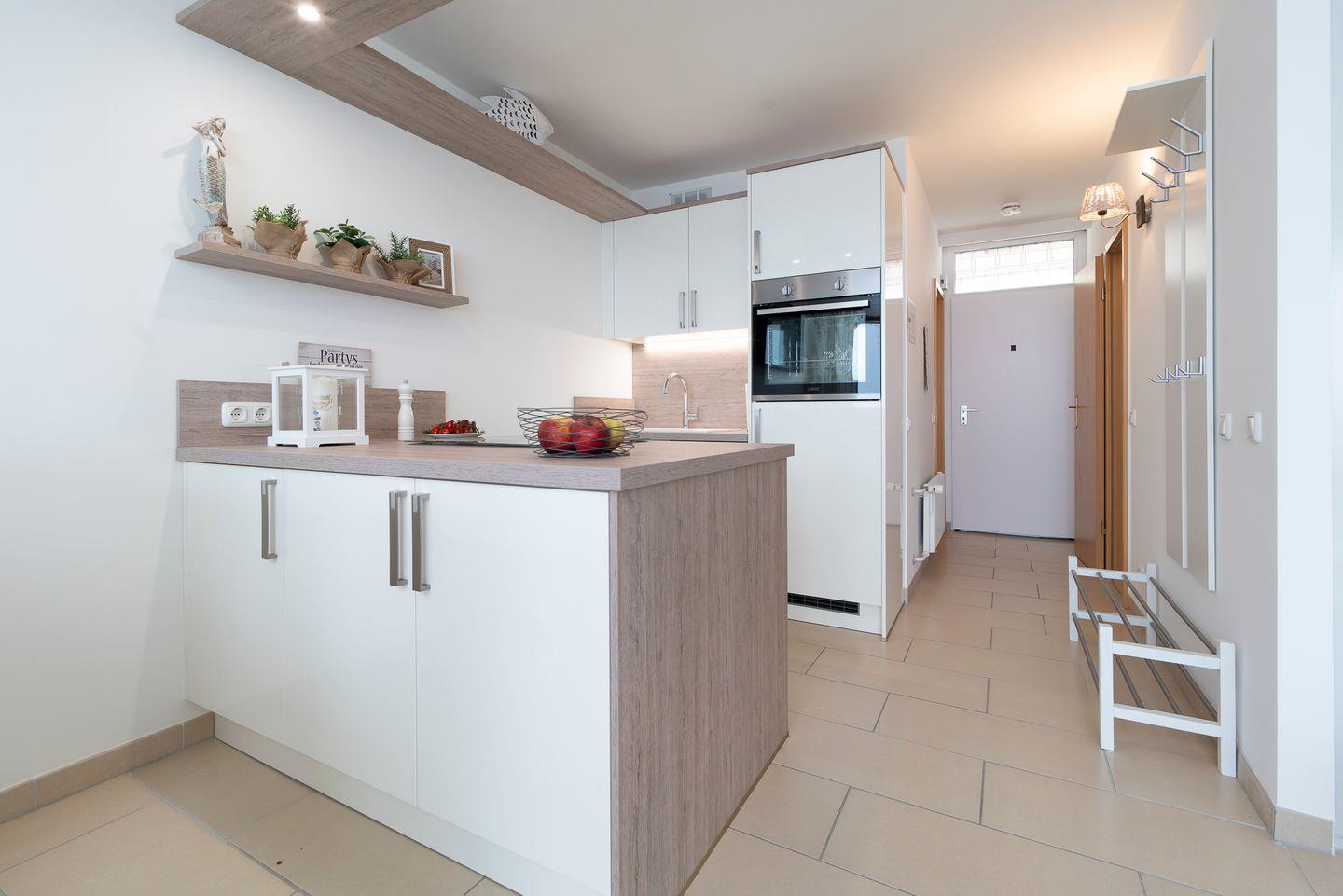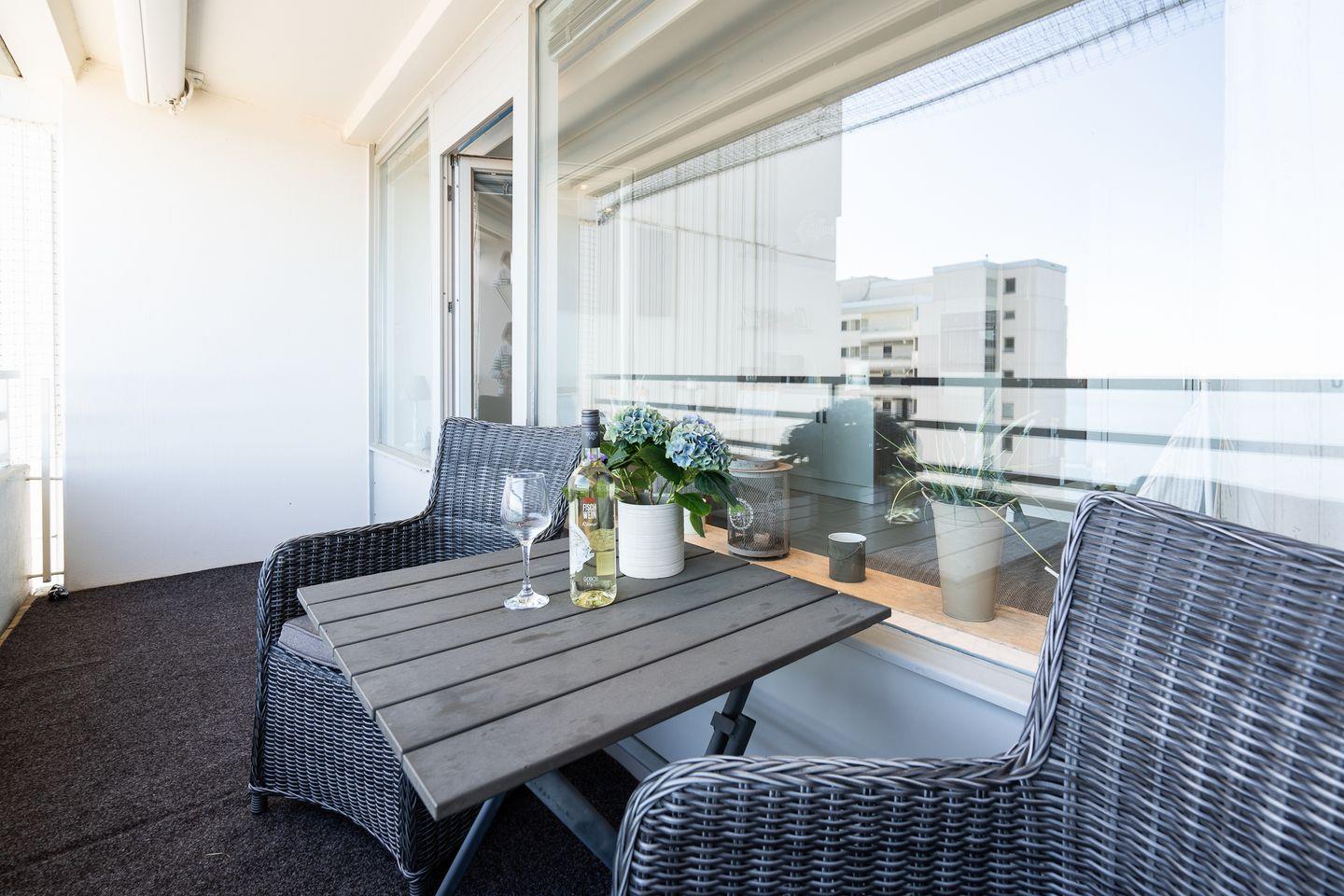 Die schöne und helle 2-Raum-Ferienwohnung befindet sich in der 9. Etage mit Balkon in Süd-Ost-Lage und Ostseeblick und ist für 2 Personen geeignet. Die moderne Küche ist mit Geschirrspüler, Herd und Backofen ausgestattet und in den Wohn- und Essraum integriert. Im Schlafraum befindet sich ein franz. Bett (140 cm x 190 cm). Es gibt ein modernes Duschbad mit Oberlicht zum Lüften. Zum Strand geht man max. 5 Min.