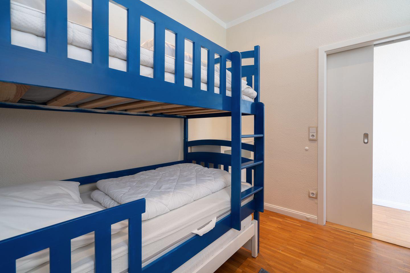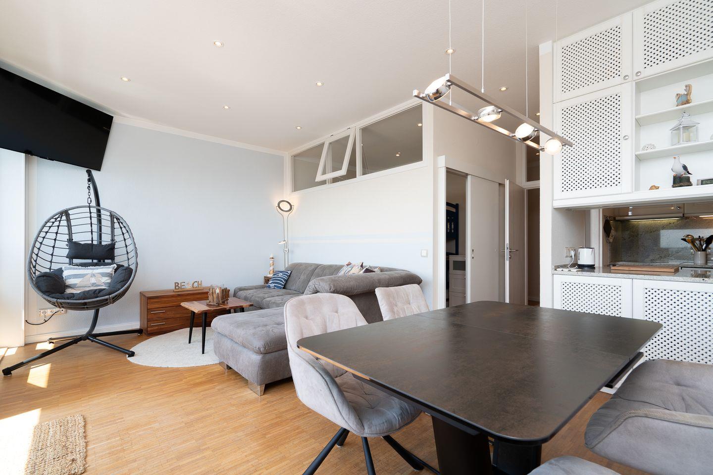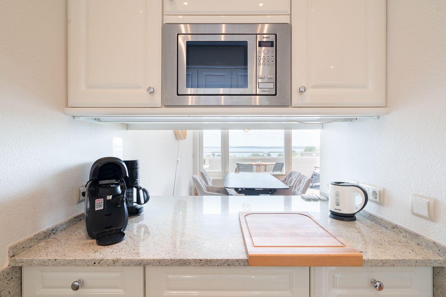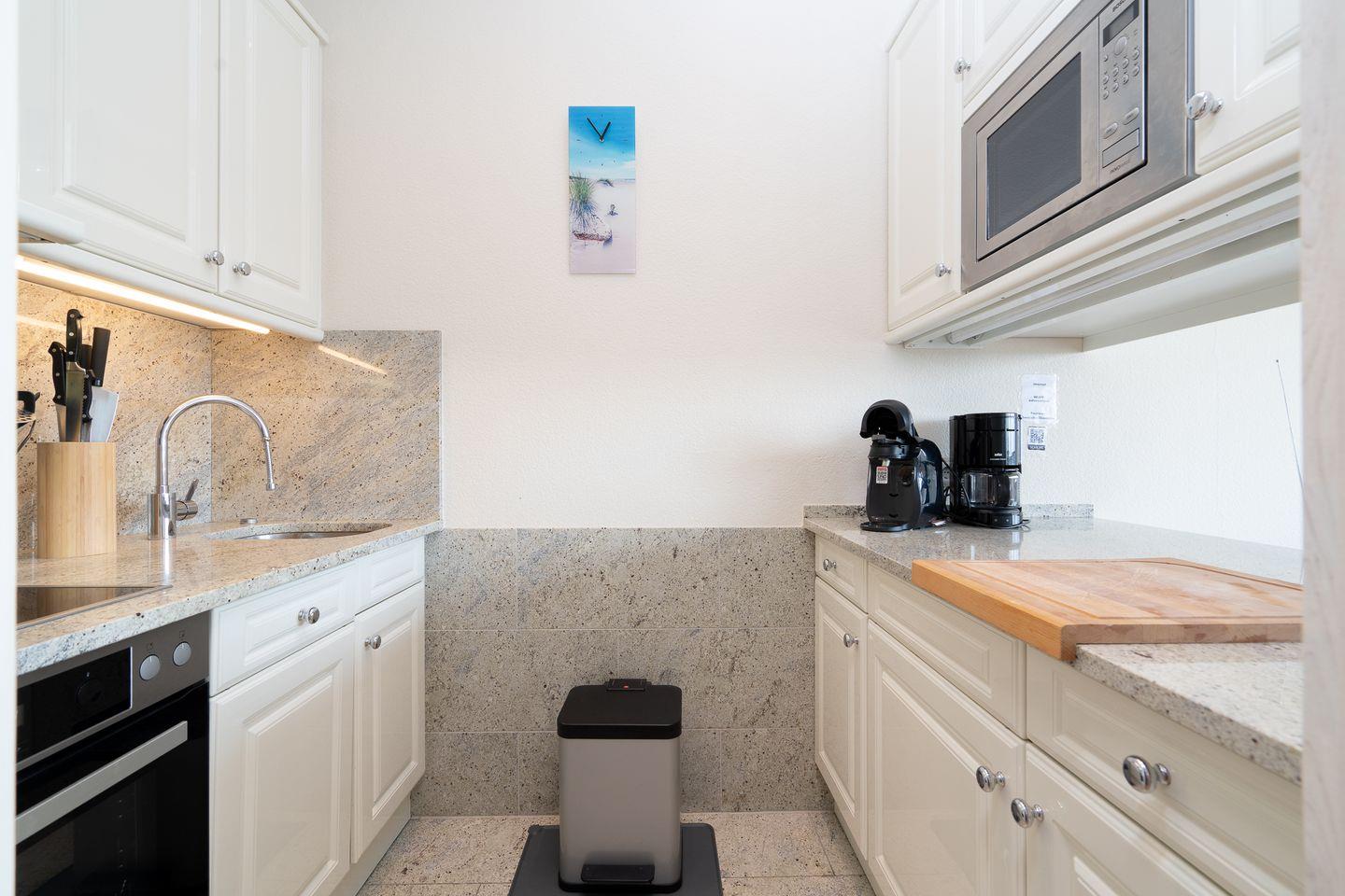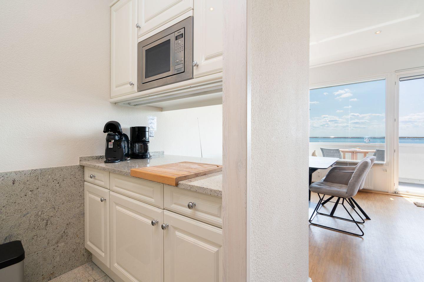 Die Wohnung liegt in der 9. Etage und hat einen möblierten Balkon in Südlage. Von hier aus haben Sie einen traumhaften Meer- und Landblick. Im ersten Schlafraum ( mit Fenster ) steht Ihnen ein komfortables Doppelbett (2x 80 x 200 cm) mit Einstieg von beiden Seiten, sowie eine große Schrankwand zur Verfügung. Im zweiten Schlafzimmer befindet sich ein Etagenbett (jeweils 90 x 200 cm), das perfekt für Kinder geeignet ist. Der helle und geräumige Wohn-/ Essbereich ist hochwertig und modern eingerichtet und das gemütliche Sofa lässt sich im Handumdrehen zu einer Schlafcouch (140 x 200 cm) umfunktionieren. Die Küche ist komplett ausgestattet und hat eine Durchreiche zum Ess-/Wohnbereich. Das großzügige Duschbad ist innenliegend und mit Waschmaschine ausgestattet.