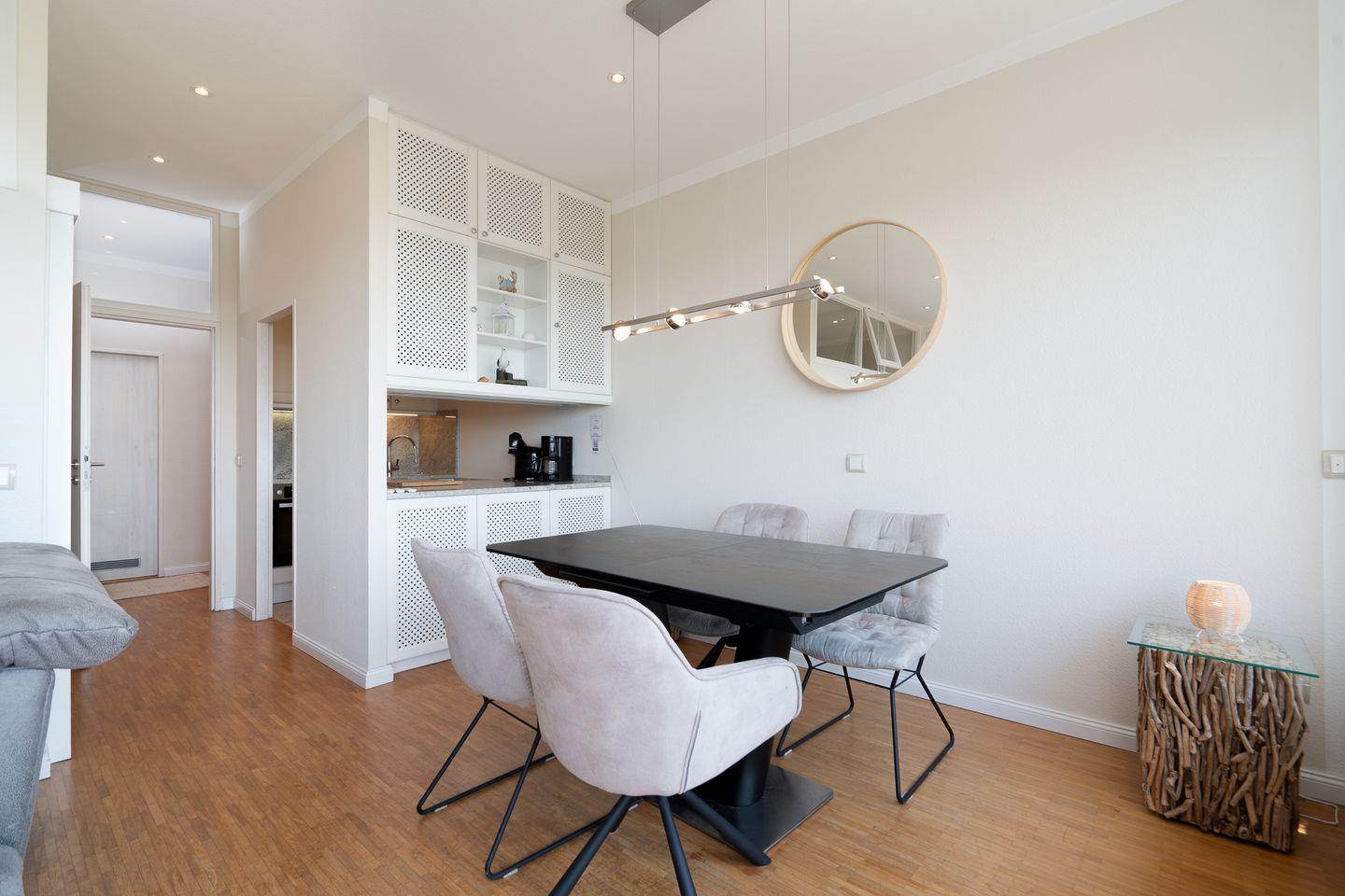 Die helle und gemütliche 2,5-Raum-Ferienwohnung liegt in der 9. Etage mit Balkon in Südlage und wunderbaren Blick auf die Ostsee. Die Küche ist komplett ausgestattet und hat eine Durchreiche zum kombinierten Ess- und Wohnbereich. Im Schlafraum steht ein komfortables Doppelbett. Das moderne Duschbad ist innenliegend und mit einer Waschmaschine ausgestattet. Die Nutzung des Schwimmbads in der Anlage ist inklusive.