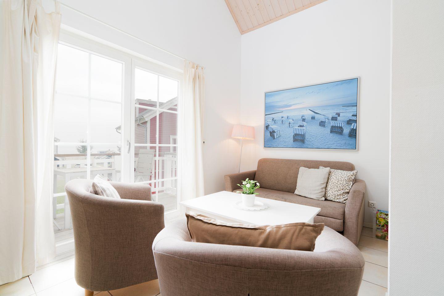 Unsere 84 qm großen Doppelhaushälften vom Typ "Klipper" bieten viel Platz und Wohlfühl-Komfort über 3 Etagen. Küchen- und Essbereich mit Kamin und Zugang zur Terrasse befinden sich im Erdgeschoss, sowie Sauna mit Dusche und WC und ein Schlafraum mit Doppelbett (2x 80 cm x 200 cm). Der Komfort einer eigenen Sauna wird sehr von unseren Wintergästen geschätzt. In der 1. Etage befinden sich ein zweiter Schlafraum mit Doppelbett (2x 90 cm x 200 cm) und der Wohnbereich, sowie das Bad mit Whirlwanne und Waschmaschine. Der Balkon geht vom Wohnbereich ab und hat an den anderen Häusern vorbei einen Ostseeblick. Zur offenen Schlafgalerie mit Tandembett (ausziehbar auf 2x 80 cm x 200 cm) führt von der 1. Etage aus eine steile Sprossenwand. Die Beheizung erfolgt über Elektroheizungen und den Kamin.