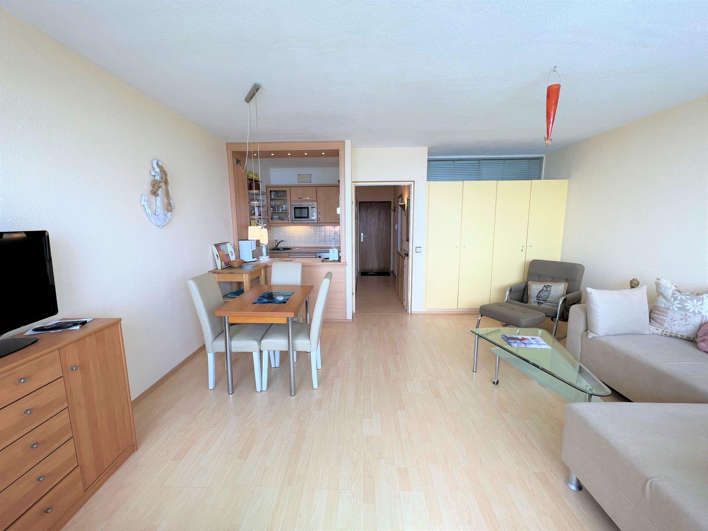 die Wohnung befindet in der 3. Etage mit Balkon in Süd-Ost-Lage und schönem Ostseeblick. Vom kombinierten Wohn- und Essbereich haben Sie Zugang zum Balkon. Die Küchenzeile ist zum Wohn-/Essbereich mit einer Durchreiche hin offen. Im innenliegenden Schlafraum befinden sich 2 Einzelbetten. Eine weitere Schlafmöglichkeit bietet das Schlafsofa im Wohnbereich. Das Duschbad ist innenliegend. Der Strand ist in wenigen Minuten zu Fuß zu erreichen.