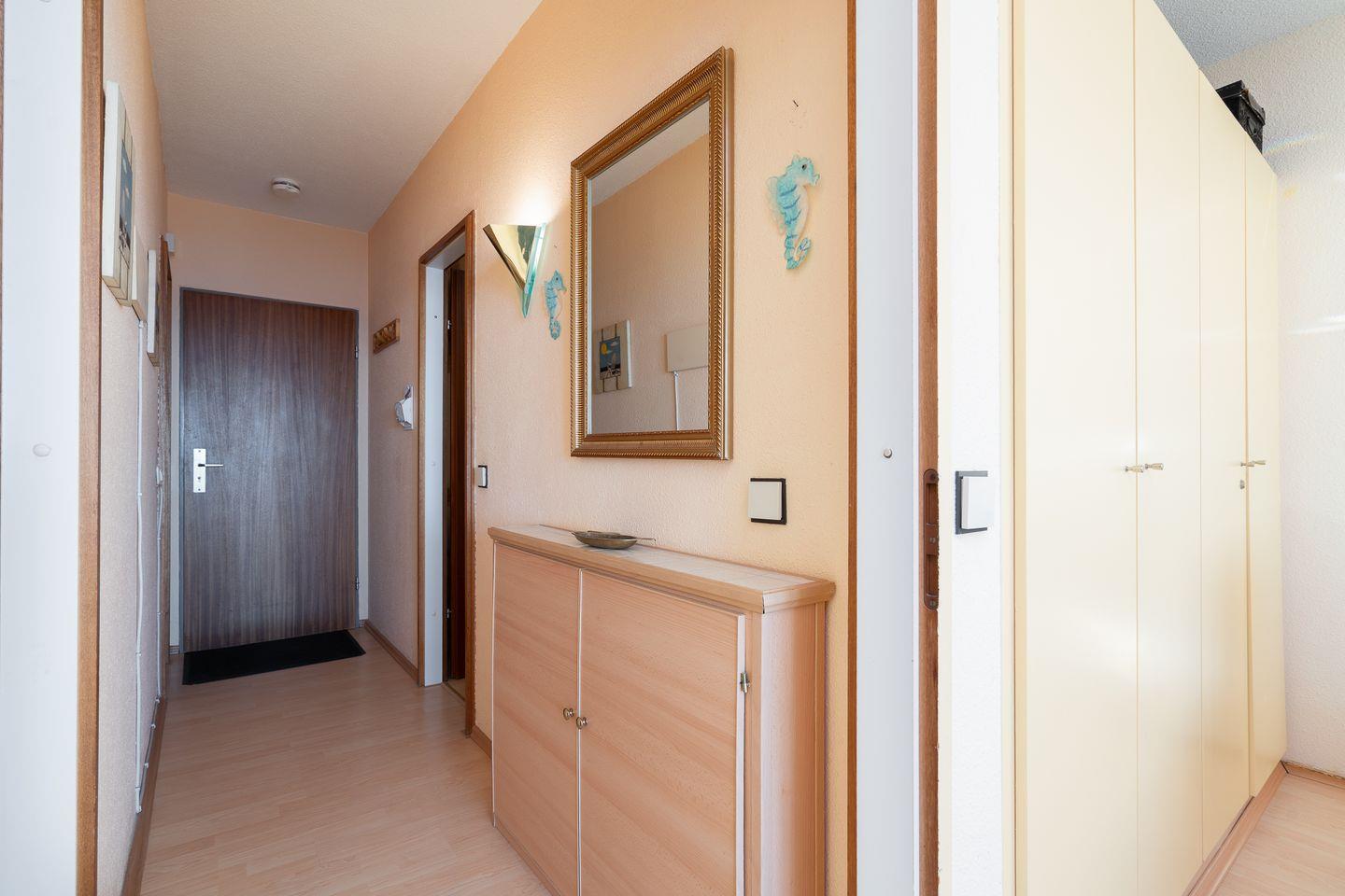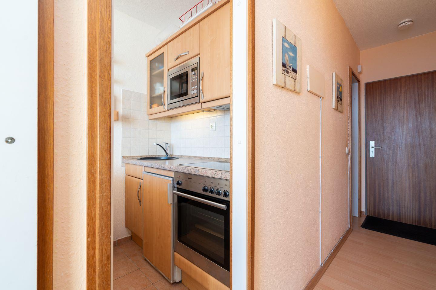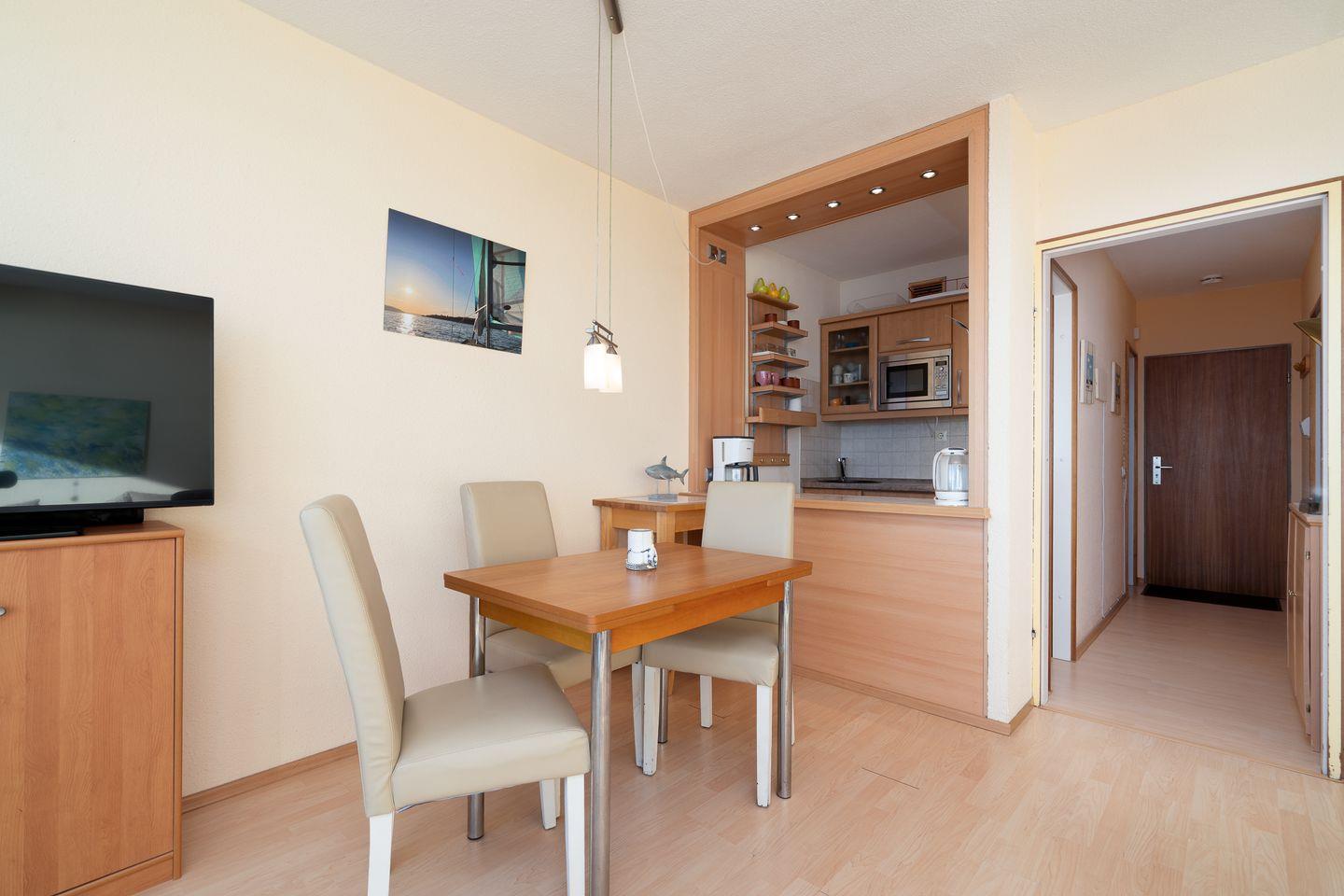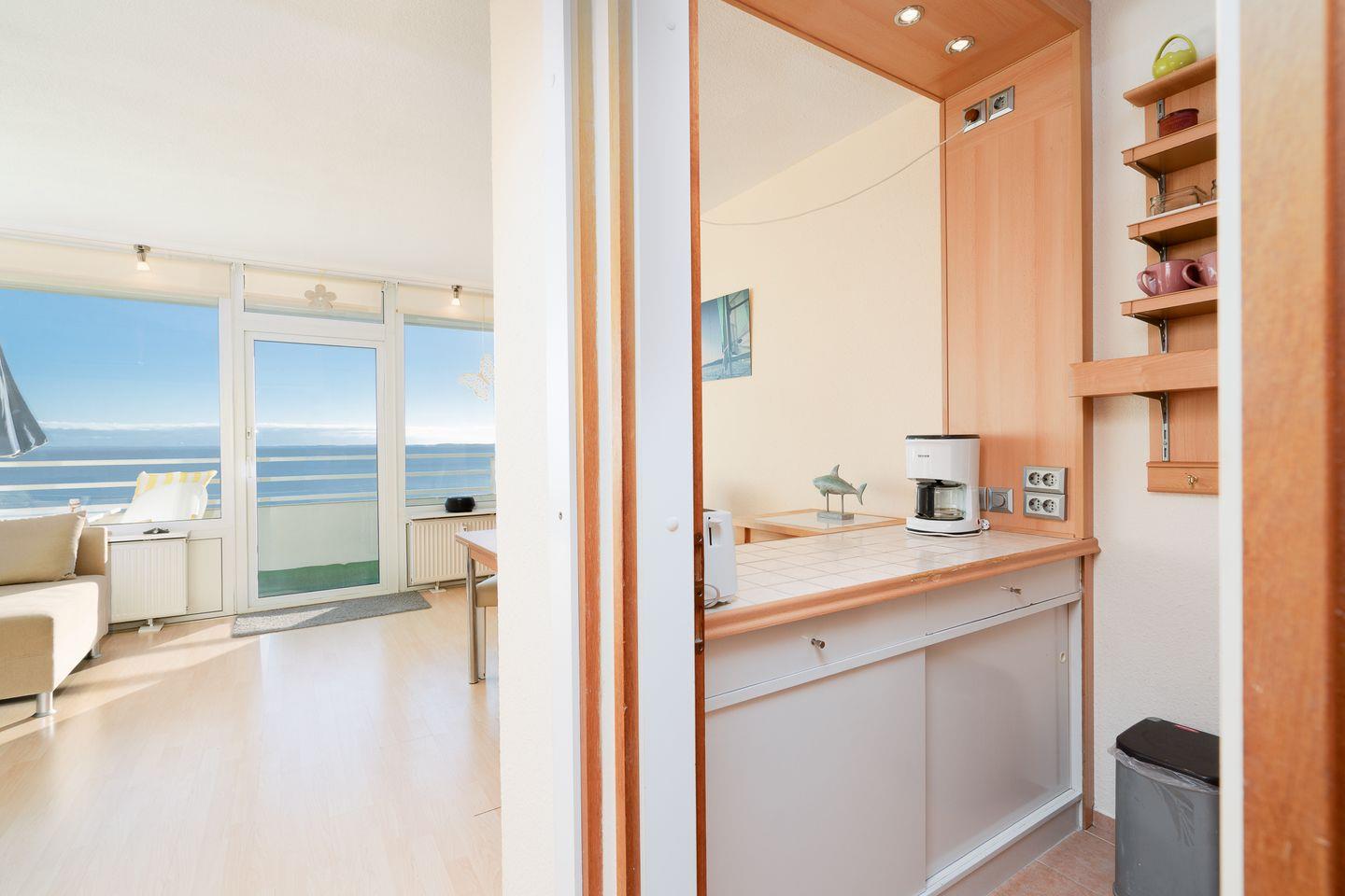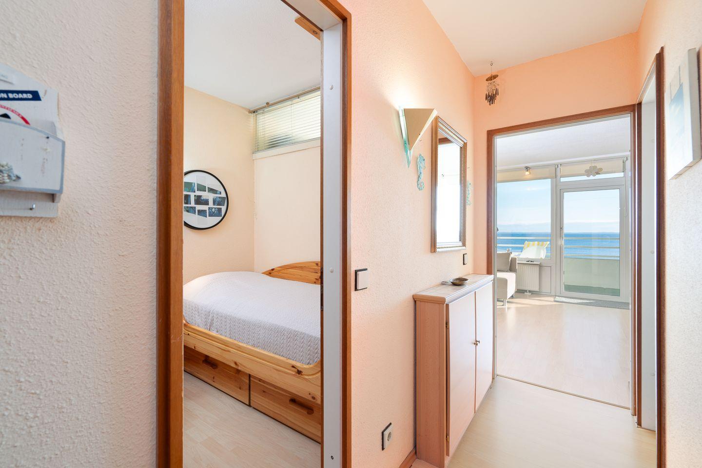 die Wohnung befindet sich im Hochhaus in der 3. Etage mit Balkon in Süd-Ost-Lage und wunderbarem Ostseeblick. Vom kombinierten Wohn- und Essbereich haben Sie Zugang zum Balkon. Die kleine Küchenzeile ist zum Wohn-/Essbereich mit einer Durchreiche hin offen und mit Backofen, Herd und Mikrowelle ausgestattet. Im innenliegenden Schlafraum befinden sich zwei Einzelbetten (jeweils 90 cm x 190 cm), die man nicht zusammenschieben kann. Im Schlafraum ist kein Platz, um ein Kinderreisebettchen aufzustellen. Eine weitere Schlafmöglichkeit bietet das Schlafsofa im Wohnbereich. Das Duschbad ist innenliegend. Ohne eine Straße überqueren zu müssen, ist der Strand in wenigen Schritten zu erreichen. PKW-Stellplatz im Parkdeck, es führen Treppen von dort aus zur Wohnung. Über einen Seiteneingang gelangt man zum Fahrstuhl für ebenerdiges Be-und Entladen.