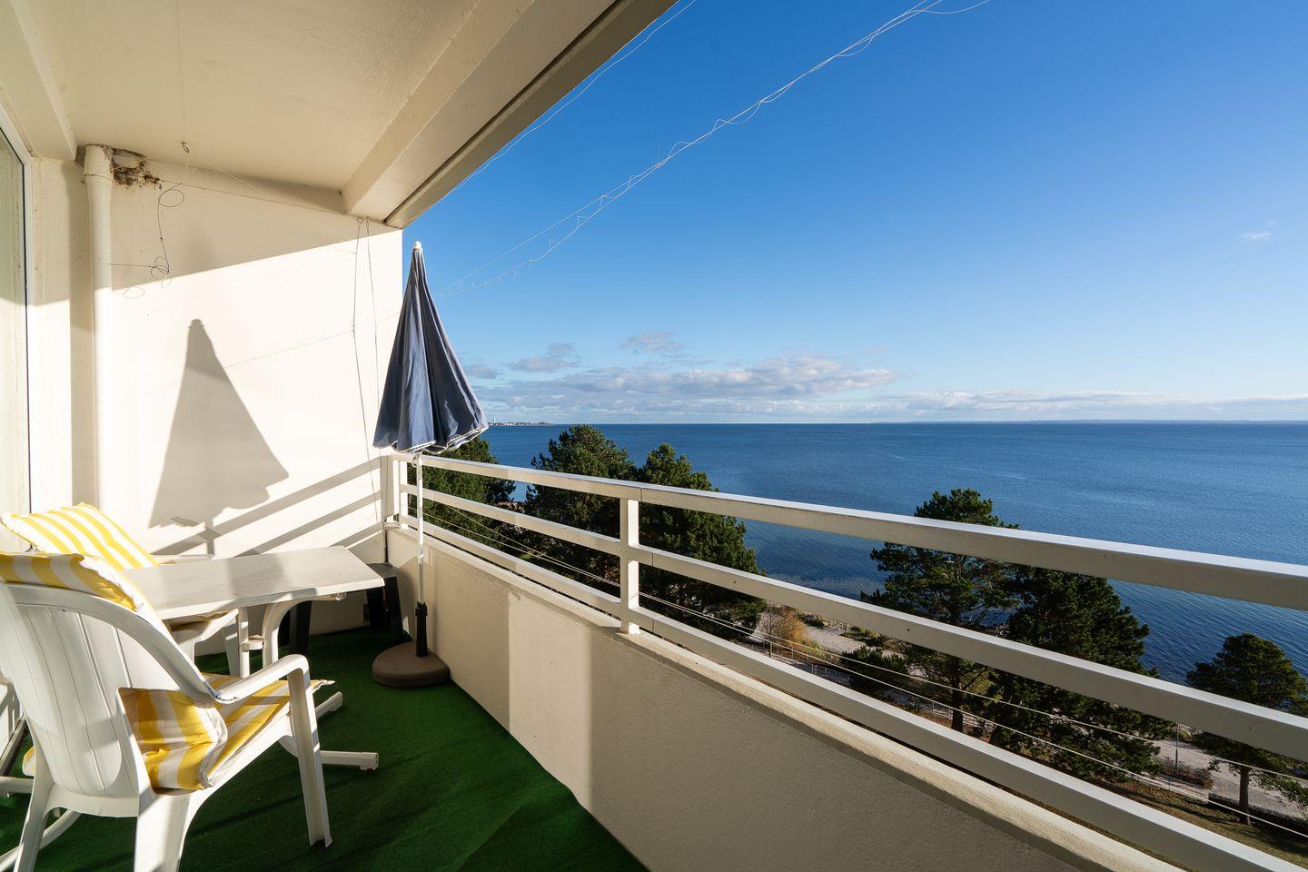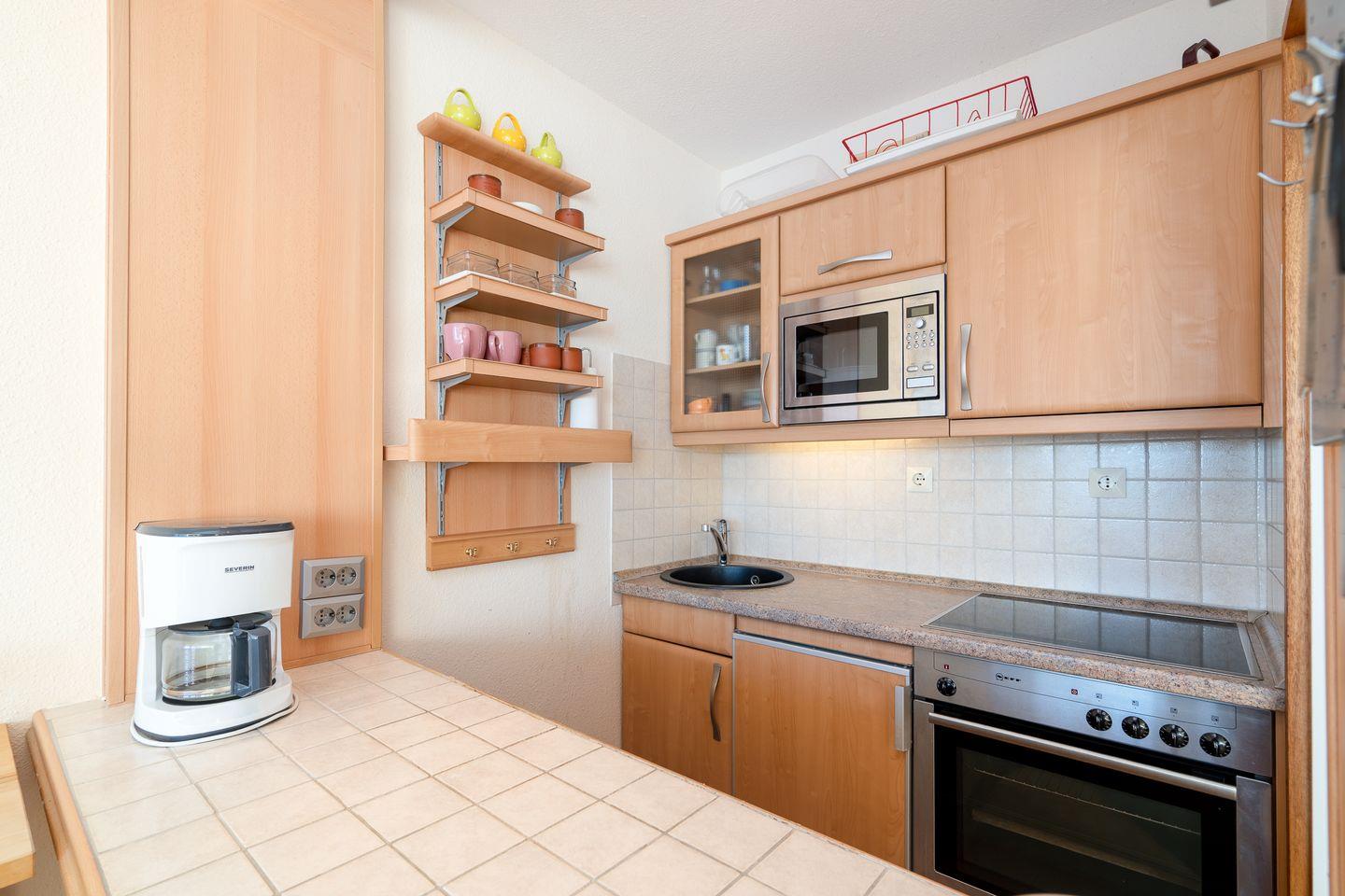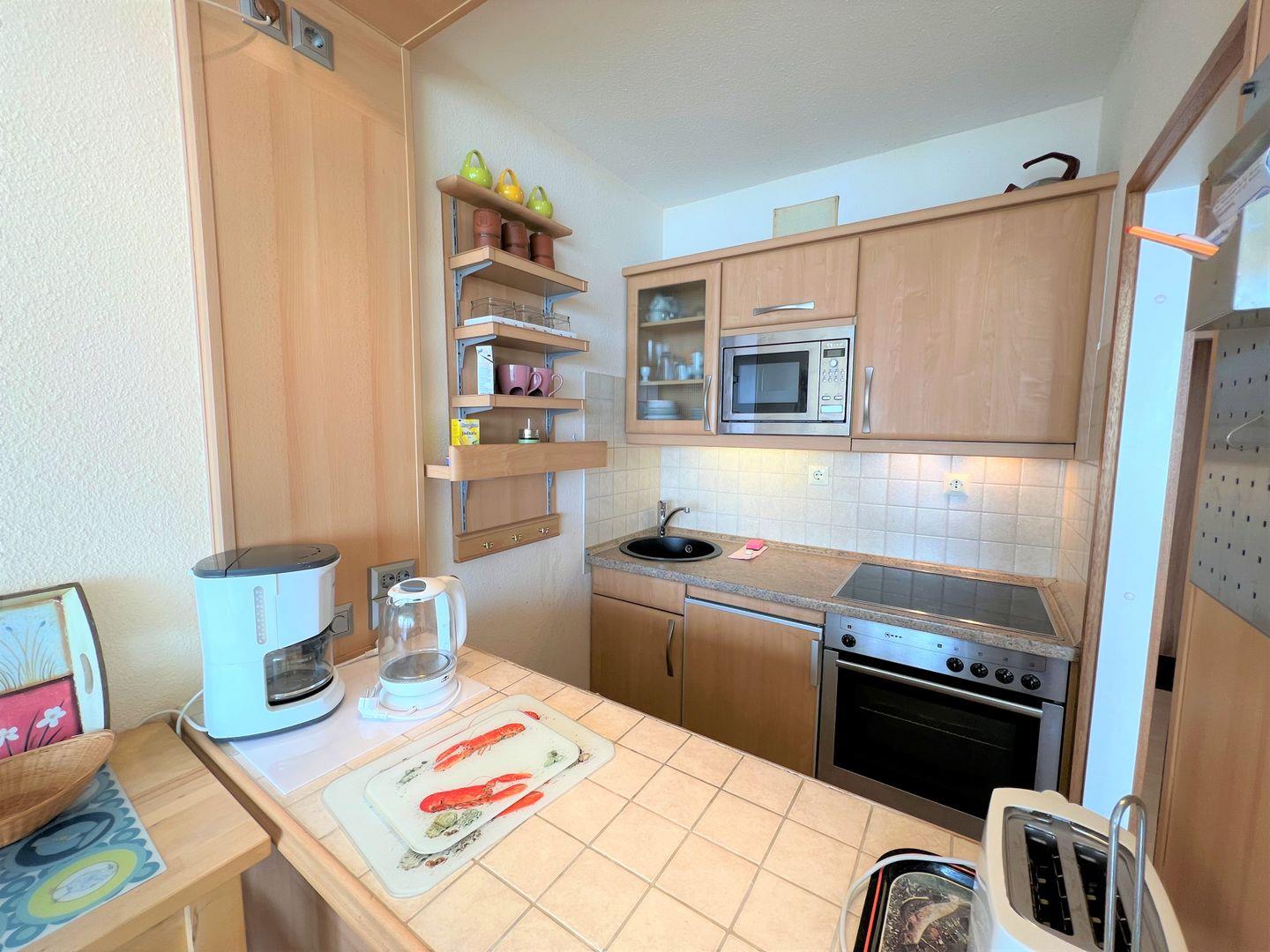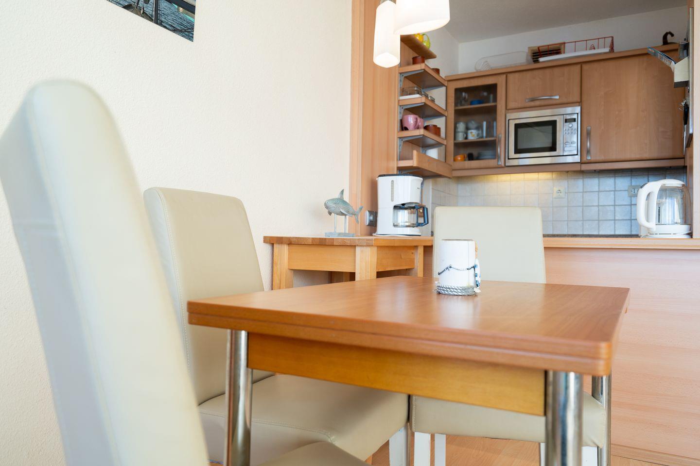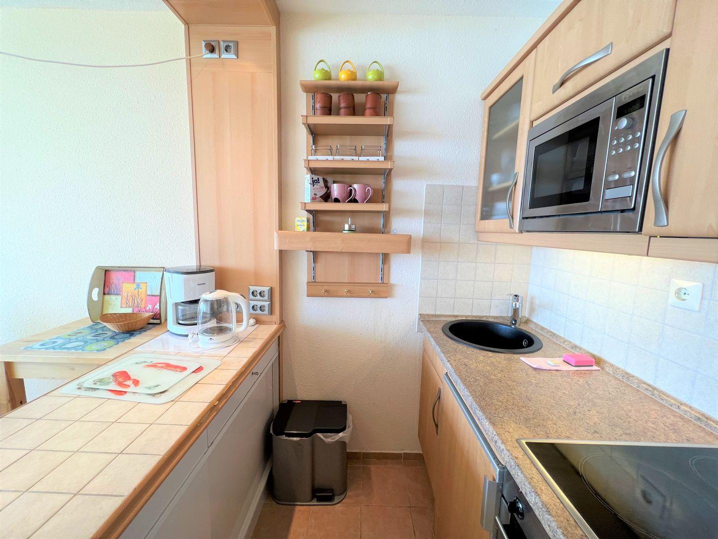 die Wohnung befindet sich im Hochhaus in der 3. Etage mit Balkon in Süd-Ost-Lage und wunderbarem Ostseeblick. Vom kombinierten Wohn- und Essbereich haben Sie Zugang zum Balkon. Die kleine Küchenzeile ist zum Wohn-/Essbereich mit einer Durchreiche hin offen und mit Backofen, Herd und Mikrowelle ausgestattet. Im innenliegenden Schlafraum befinden sich zwei Einzelbetten (jeweils 90 cm x 190 cm), die man nicht zusammenschieben kann. Im Schlafraum ist kein Platz, um ein Kinderreisebettchen aufzustellen. Eine weitere Schlafmöglichkeit bietet das Schlafsofa im Wohnbereich. Das Duschbad ist innenliegend. Ohne eine Straße überqueren zu müssen, ist der Strand in wenigen Schritten zu erreichen. PKW-Stellplatz im Parkdeck, es führen Treppen von dort aus zur Wohnung. Über einen Seiteneingang gelangt man zum Fahrstuhl für ebenerdiges Be-und Entladen.
