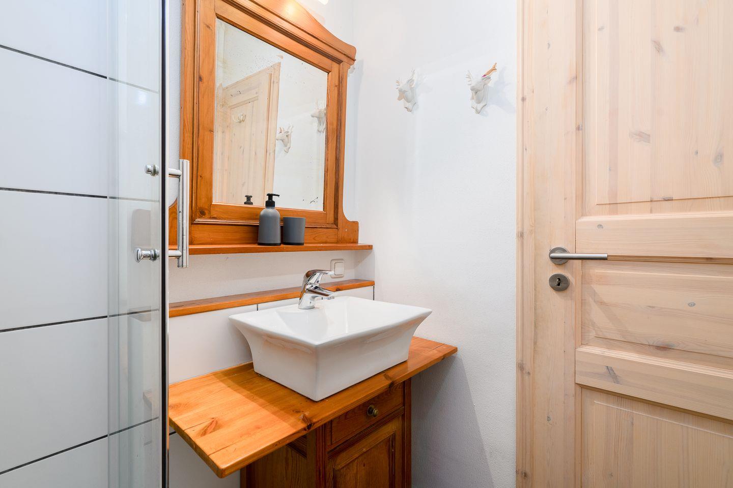 Das gepflegte Badezimmer mit Dusche ist mit einem Kieselsteinboden versehen, der die Füße nach einem langen Strandaufenthalt ganz nebenbei wohltuend massiert.