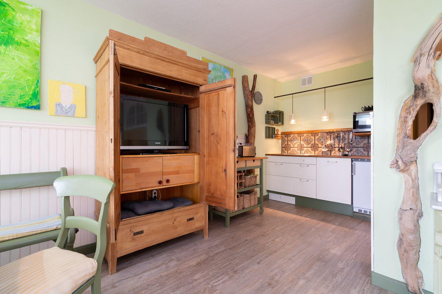 Im Wohnzimmer lässt sich die Couch in wenigen Schritten zur Schlafcouch (140 cm x 200 cm) umfunktionieren. Der Fernseher befindet sich im Schrank, direkt gegenüber der Schlafcouch.
