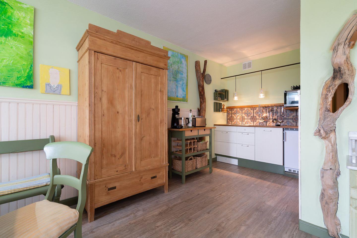 Die mit Spülmaschine, Herd und kleinem Backofen ausgestattete Küche ist in den gemütlichen kombinierten Wohn- und Essbereich integriert.