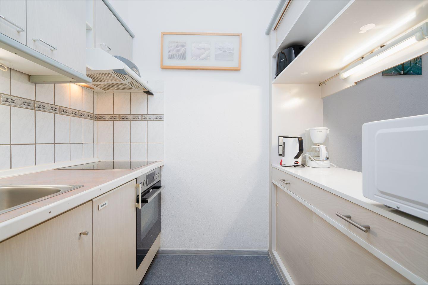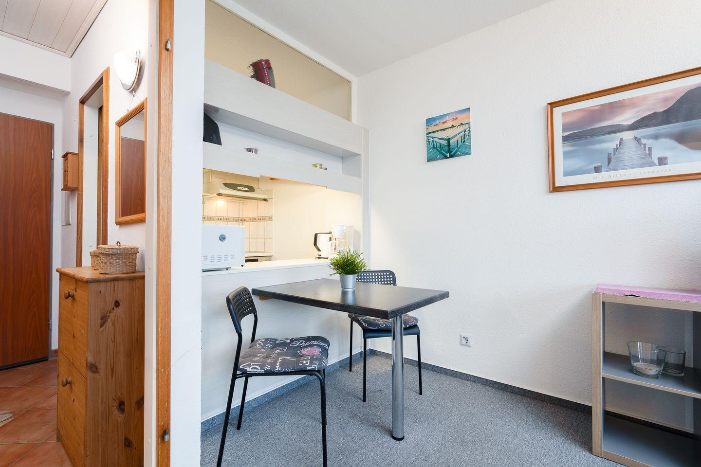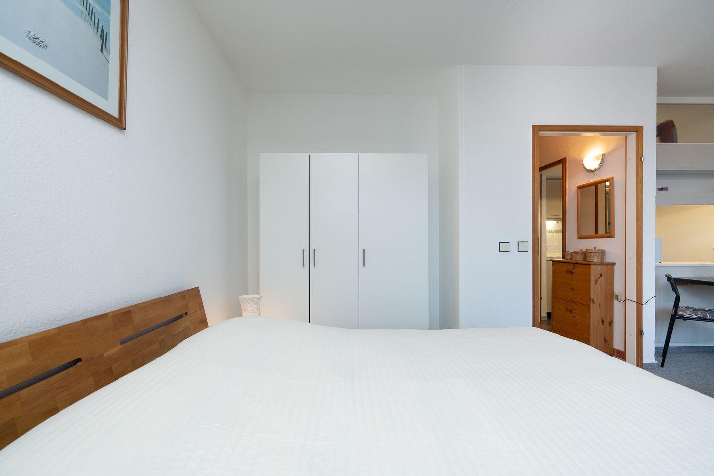 Die 33 qm große Wohnung für zwei Personen befindet sich im Hochhaus in der 4. Etage mit Balkon in Nord-West-Lage und Blick auf den Hansapark. Im kombinierten Wohn- und Schlafbereich befindet sich ein Doppelbett (160 cm x 200 cm) und ein kleiner Esstisch. Die Küche mit Backofen und Herd ist mit einer Durchreiche zum Wohnbereich hin offen. Das Duschbad ist innenliegend. Zum Strand sind es nur wenige Gehminuten. PKW-Stellplatz inklusive.