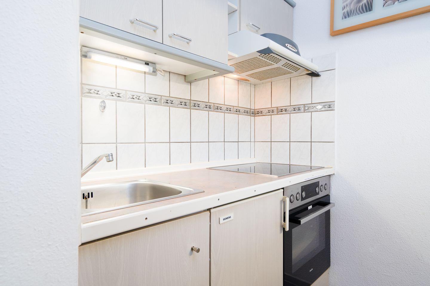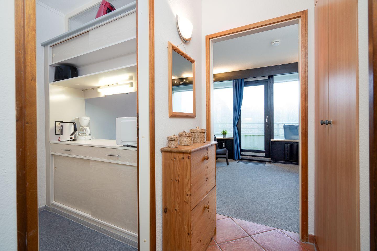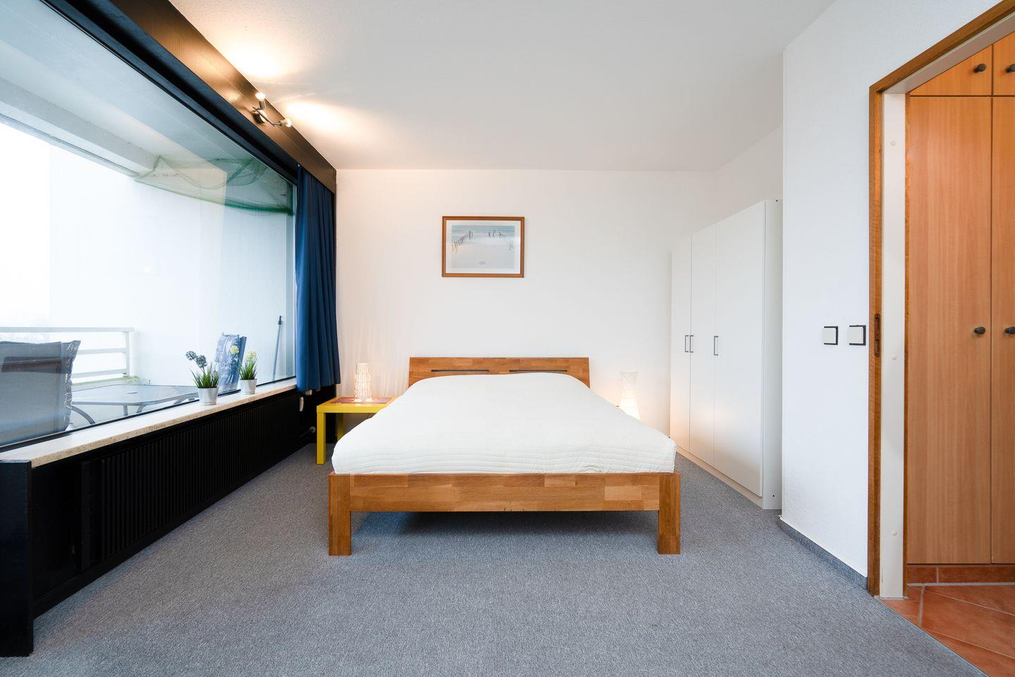 Die 33 qm große Wohnung für zwei Personen befindet sich im Hochhaus in der 4. Etage mit Balkon in Nord-West-Lage und Blick auf den Hansapark. Im kombinierten Wohn- und Schlafbereich befindet sich ein Doppelbett (160 cm x 200 cm) und ein kleiner Esstisch. Die Küche mit Backofen und Herd ist mit einer Durchreiche zum Wohnbereich hin offen. Das Duschbad ist innenliegend. Zum Strand sind es nur wenige Gehminuten. PKW-Stellplatz inklusive.