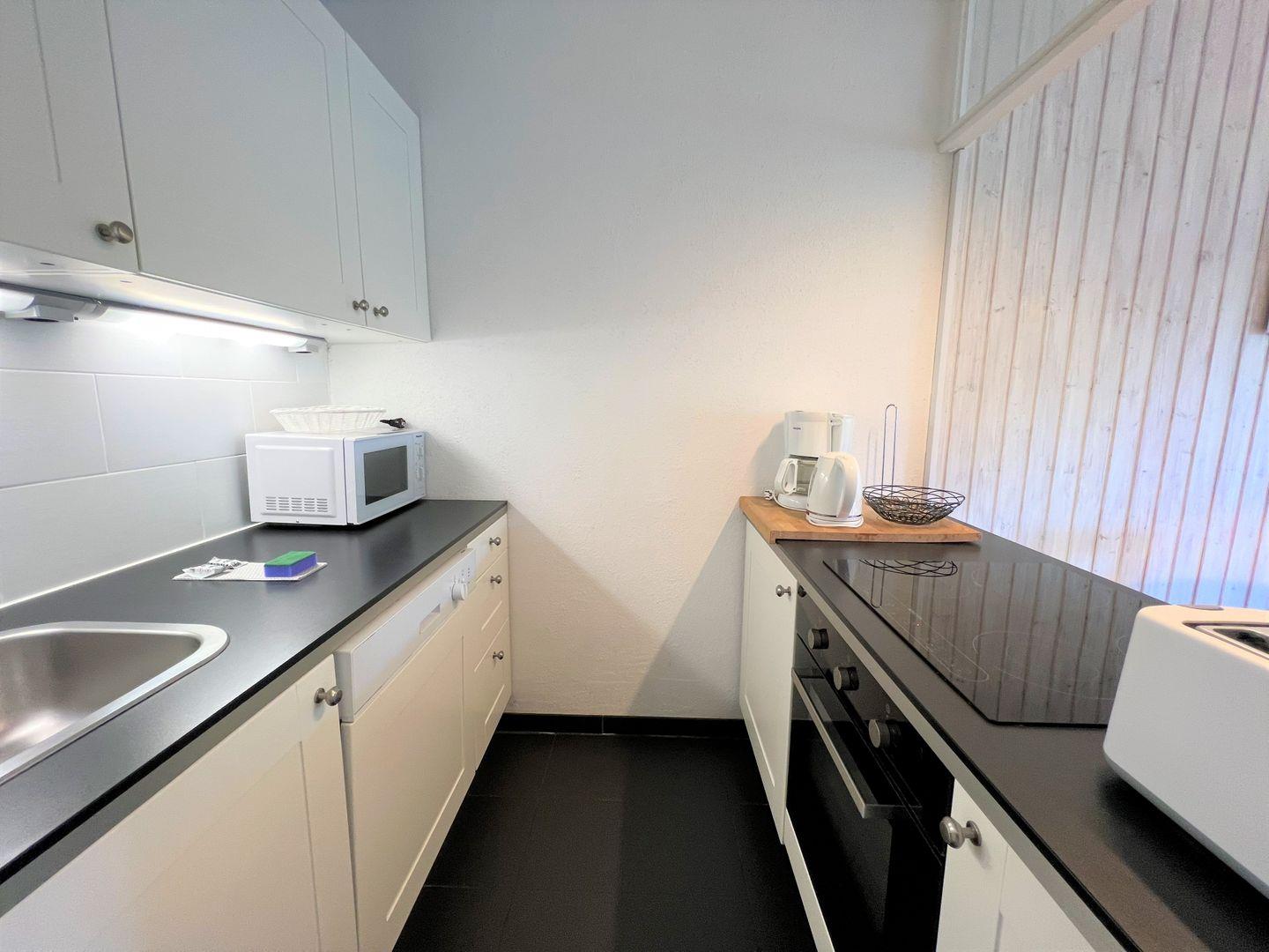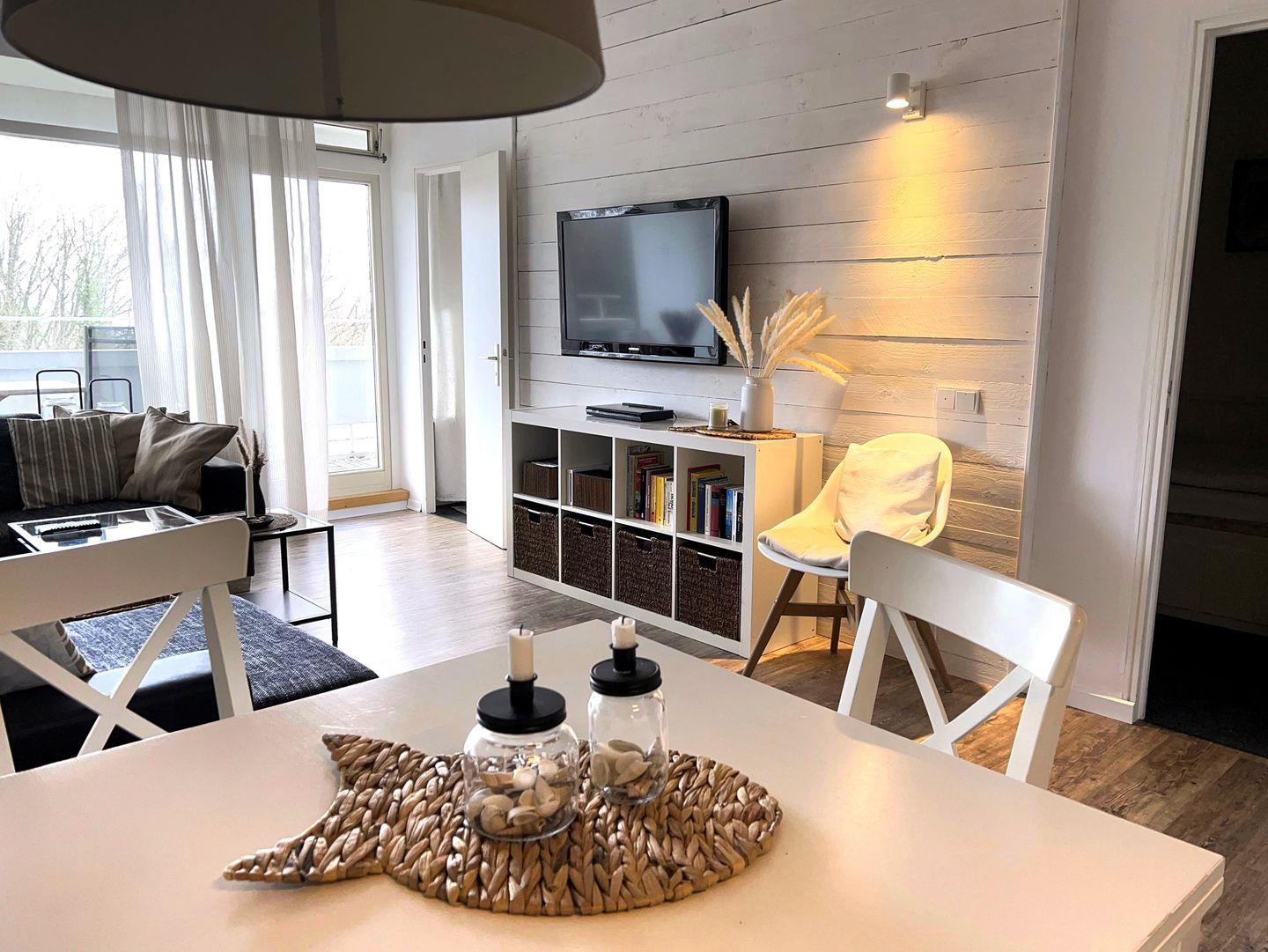 hier finden Sie eine maritime, hell und freundlich eingerichtete 50 qm 3-Raum-Ferienwohnung in der Apartmentanlage Panoramic. Es gibt einen Wohnraum mit Essbereich und einem Balkon in Ostlage mit Blick ins Grüne. In der Wohnung sind 2 innenliegende Schlafräume - das erste Schlafzimmer mit Doppelbett (180 x 200 cm), das zweite mit einem 80 x 200 cm Bett, welches man zu einer größeren Liegefläche ausklappen kann (dann 160 x 200 cm). Ist das Bett nicht ausgezogen, hat ein Kinderbett ausreichend Platz.. Der zweite Schlafraum hat ein Oberlicht zum anderen Schlafraum. Die Küche ist zum Essbereich offen und ist mit Spülmaschine, Backofen und Herd ausgestattet. Das moderne und helle Wannenbad ist innenliegend. Zum Strand sind es nur wenige Minuten zu Fuß.