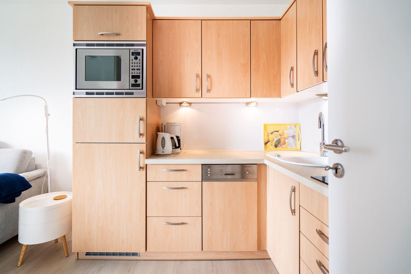 die geräumige 1-Raum-Ferienwohnung mit Balkon in Süd-Ost-Lage ist für maximal 2 Personen ausgestattet. Die Küche ist zum Ess- und Wohnbereich offen und mit Spülmaschine, Backofen und Herd ausgestattet. Das Doppelbett (2x 90 cm x 200 cm) kann mit einem Vorhang optisch vom gemütlichen Wohnraum getrennt werden. Es gibt ein innenliegendes, helles Duschbad. PKW-Stellplatz inklusive. Zum Strand sind es nur wenige Fußschritte.