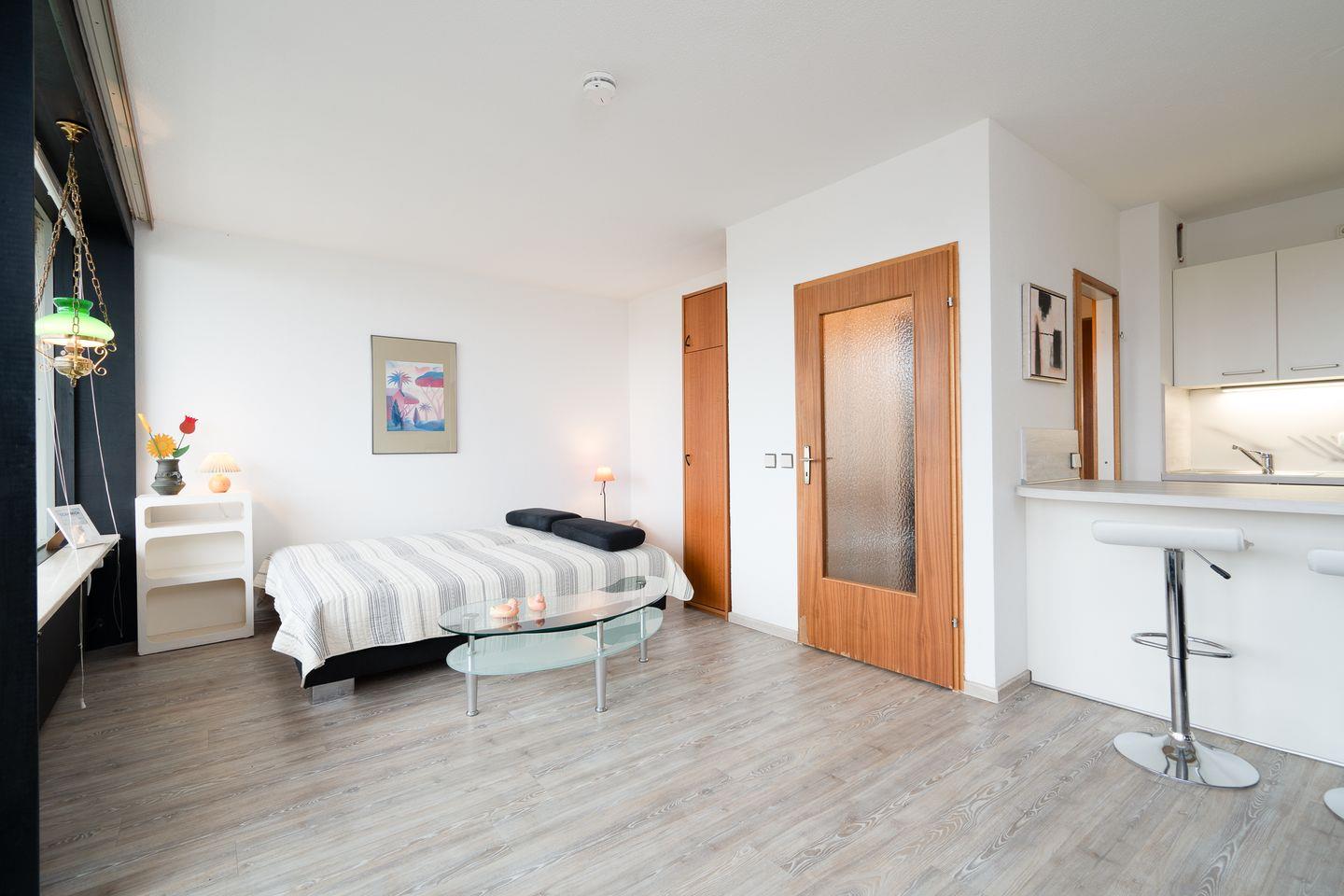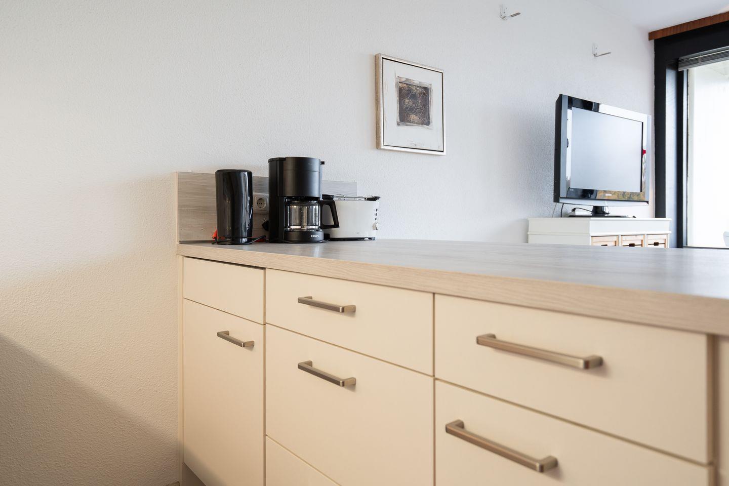 diese 1-Raum-Ferienwohnung liegt in der Apartmentanlage Ferienpark in der 4. Etage mit einem Balkon in Süd-West-Lage und seitlichem Ostseeblick über die Wohnanlage hinweg. Die Wohnung ist ca. 33 qm groß und für 2 Personen geeignet. Im kombinierten Wohn- und Schlafraum steht Ihnen ein Schlafsofa (140 cm x 190 cm) zur Verfügung. Die moderne Küche ist mit Spülmaschine, Backofen und Herd ausgestattet und mit einem Esstresen zum Wohnraum hin offen. Das Duschbad ist innenliegend. Der Fussboden ist mit Designerplanke ausgelegt. Zum Strand sind es nur wenige Gehminuten. PKW-Stellplatz inklusive.